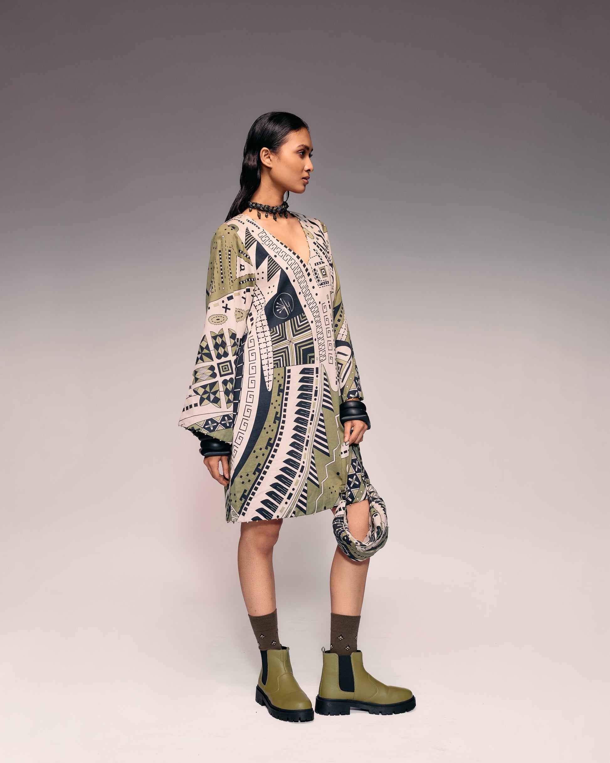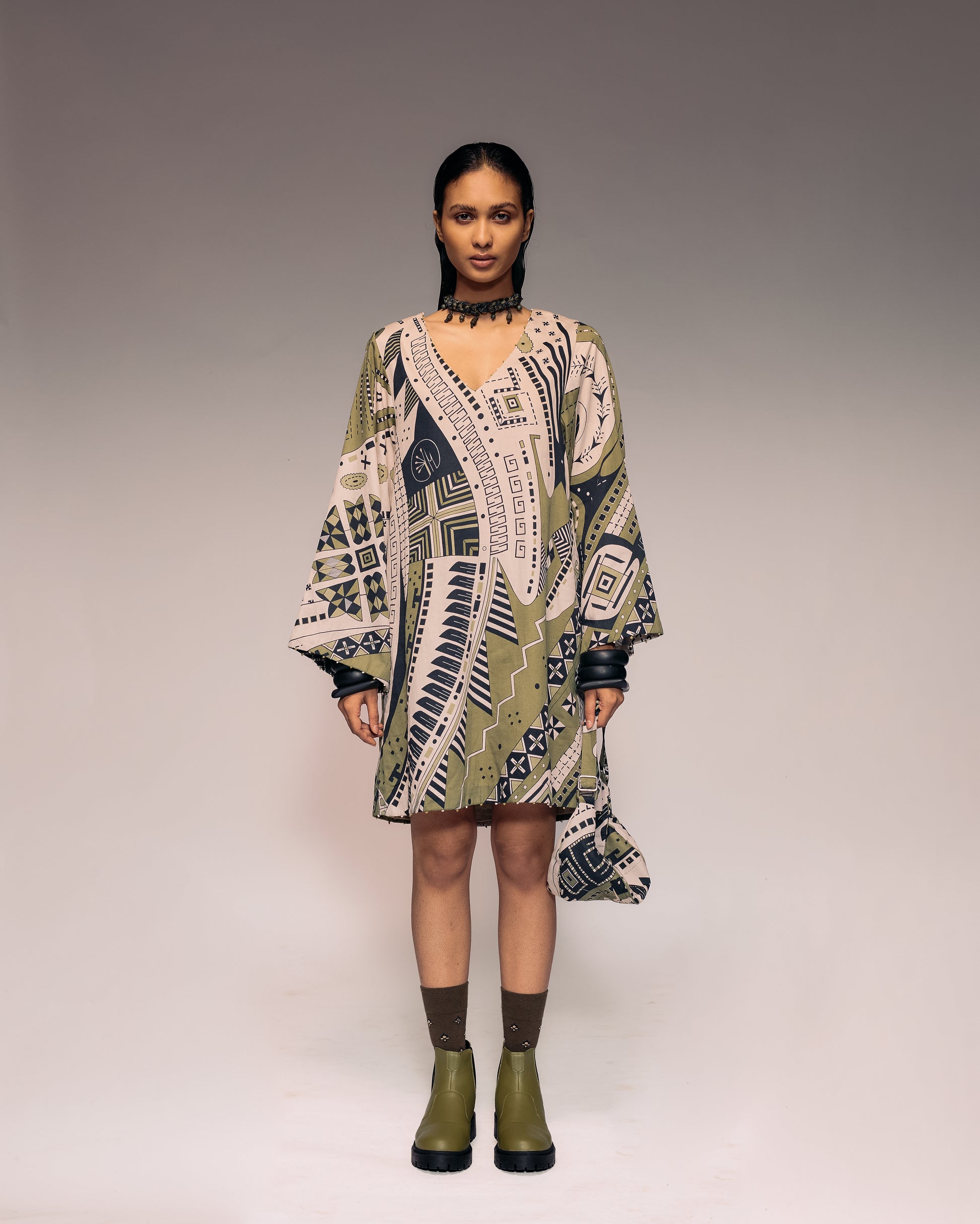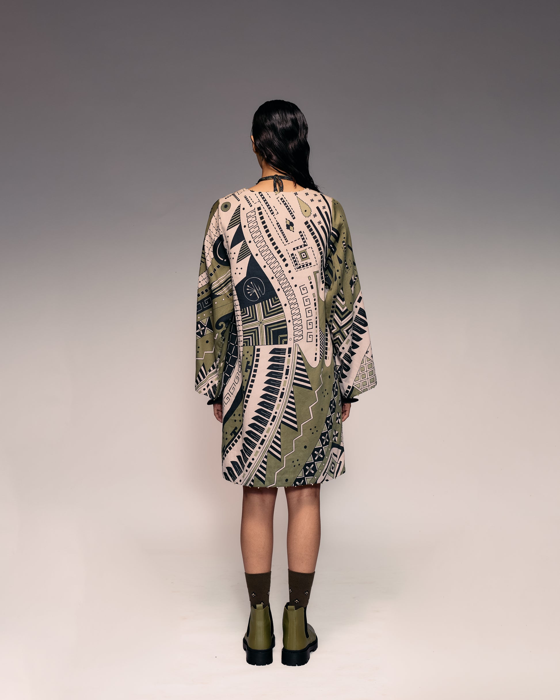 Inspired by Mata ortiz pottery, the Olive Print Shift Dress blends artistic heritage with modern minimalism. Crafted from breathable cotton, it features subtle French knot embroidery on the V-neckline and sleeve hems. The straight, tunic-style silhouette ensures relaxed comfort and everyday elegance. Pair with neutral footwear and minimal jewelry for daytime wear or casual gatherings. Perfect for all season dressing and effortless travel chic.