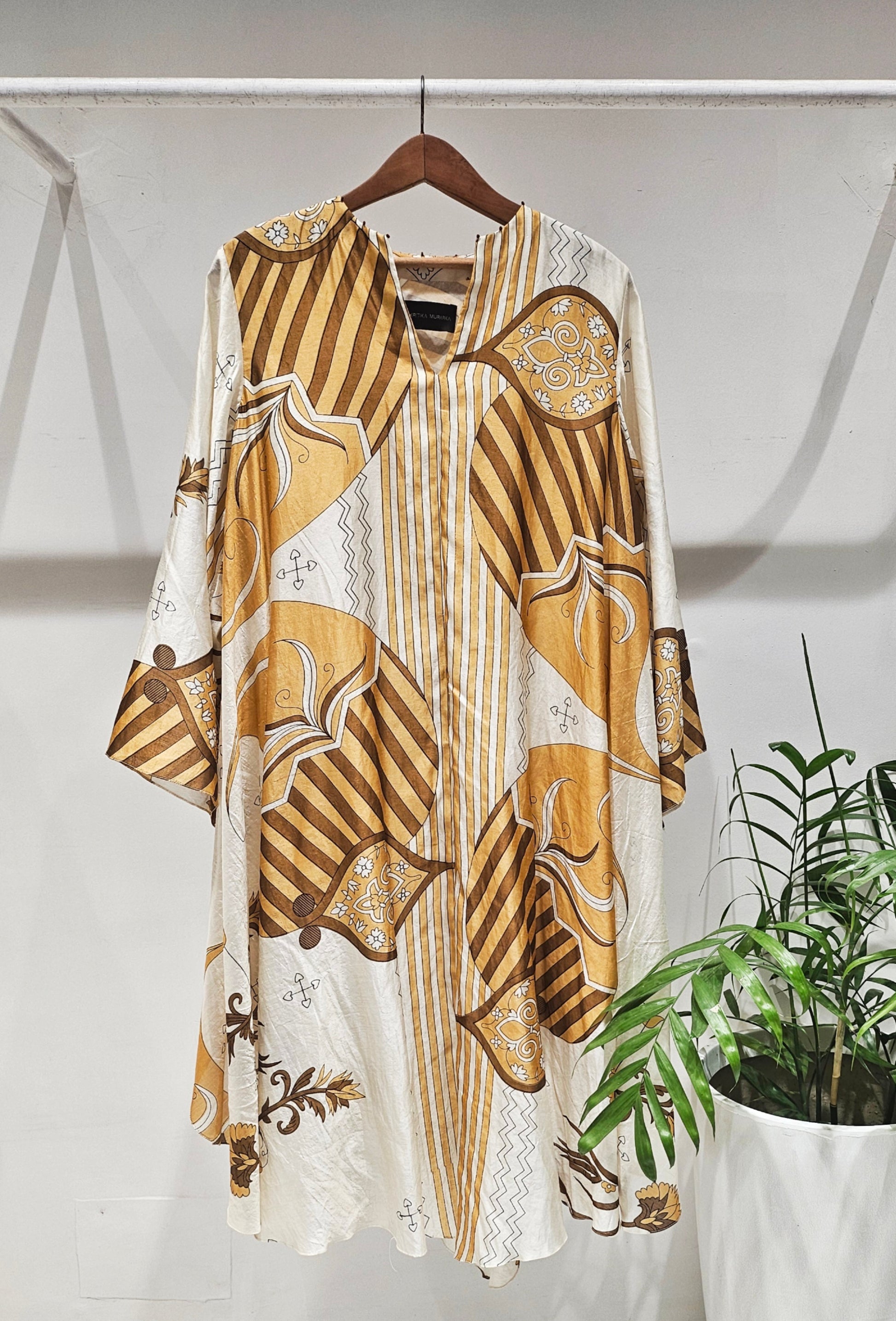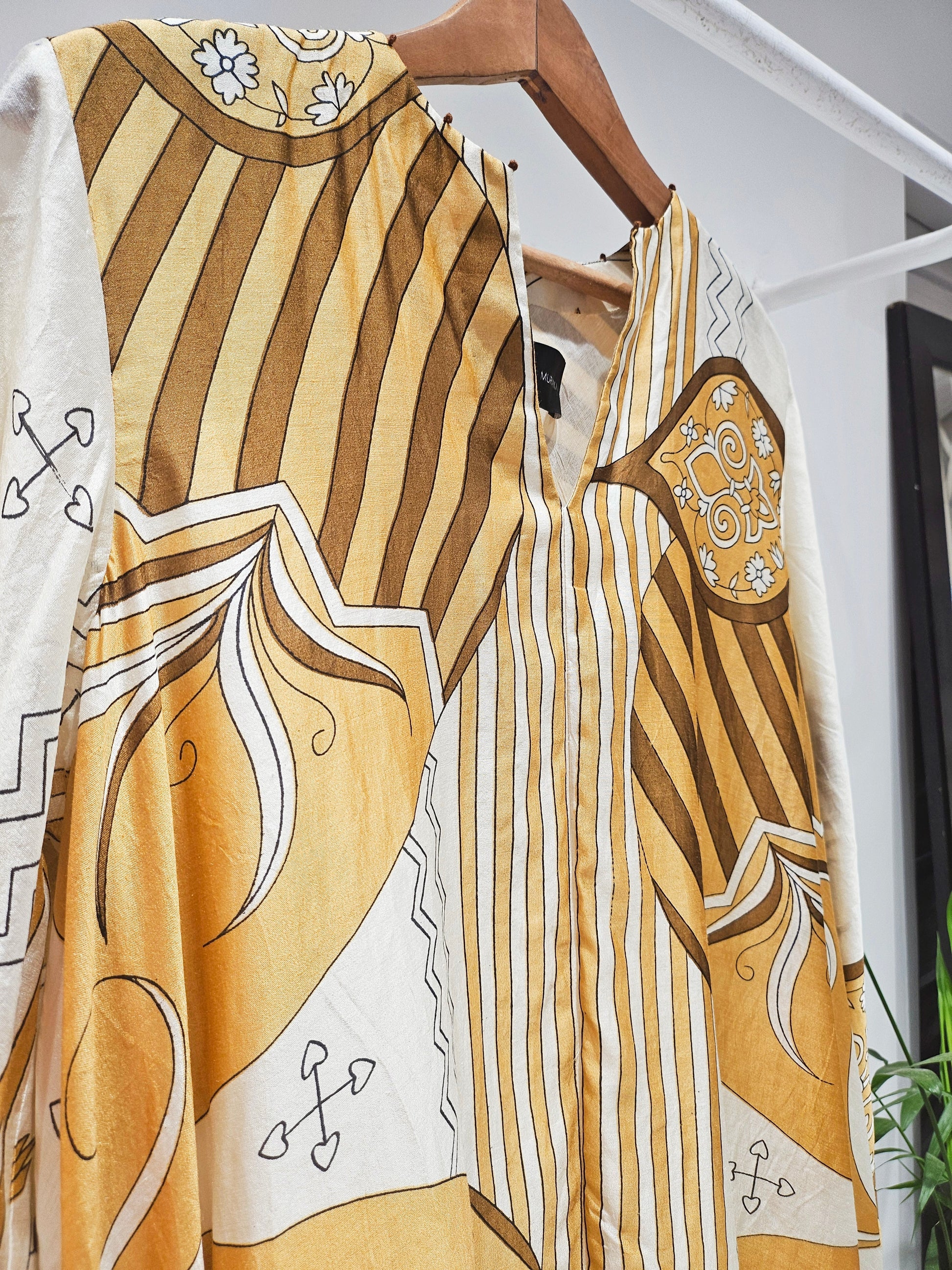 Cut from lustrous cotton silk, this printed tunic has a v-neck with french knot detailing. It is a relaxed silhouette with comfortable bell sleeves.