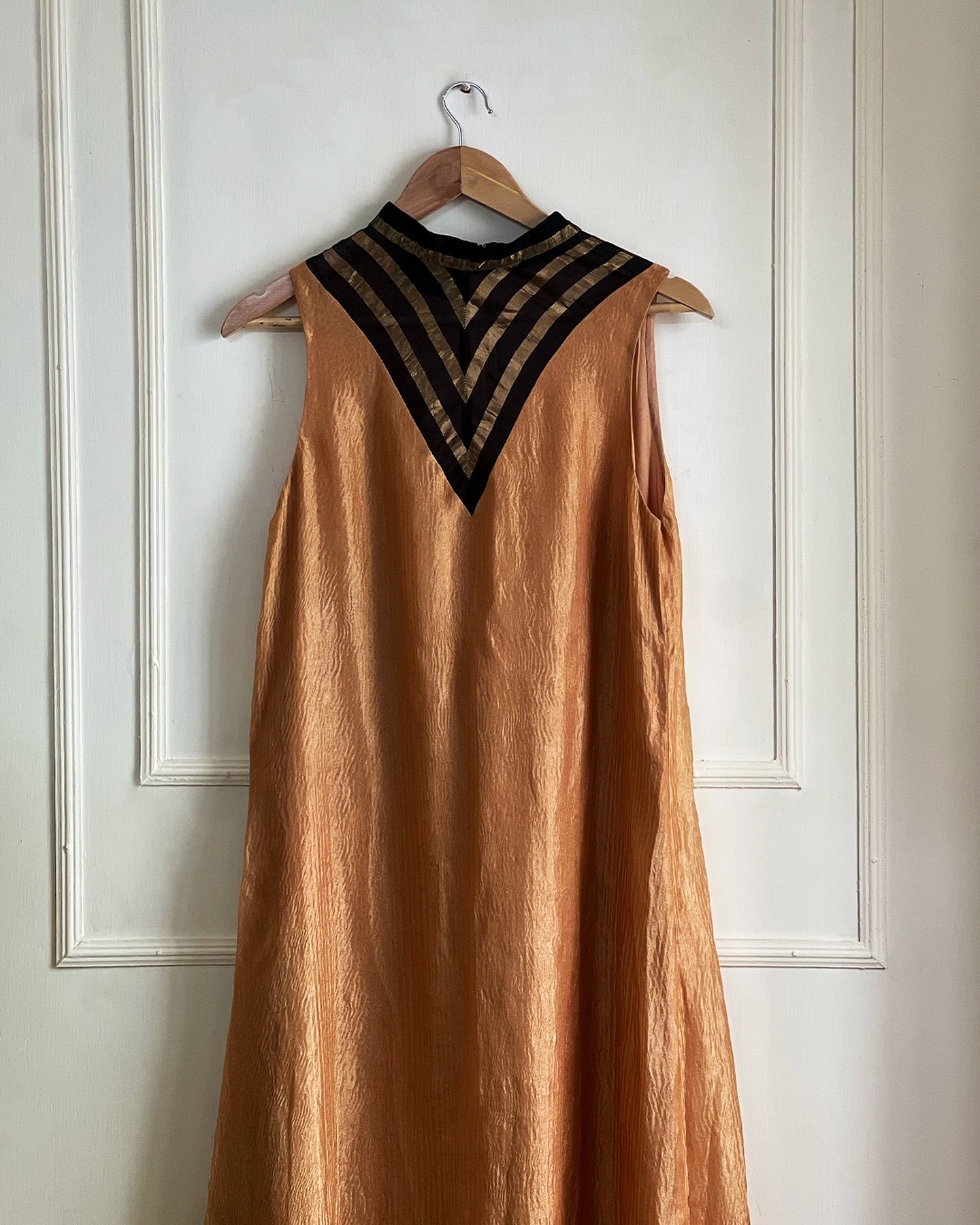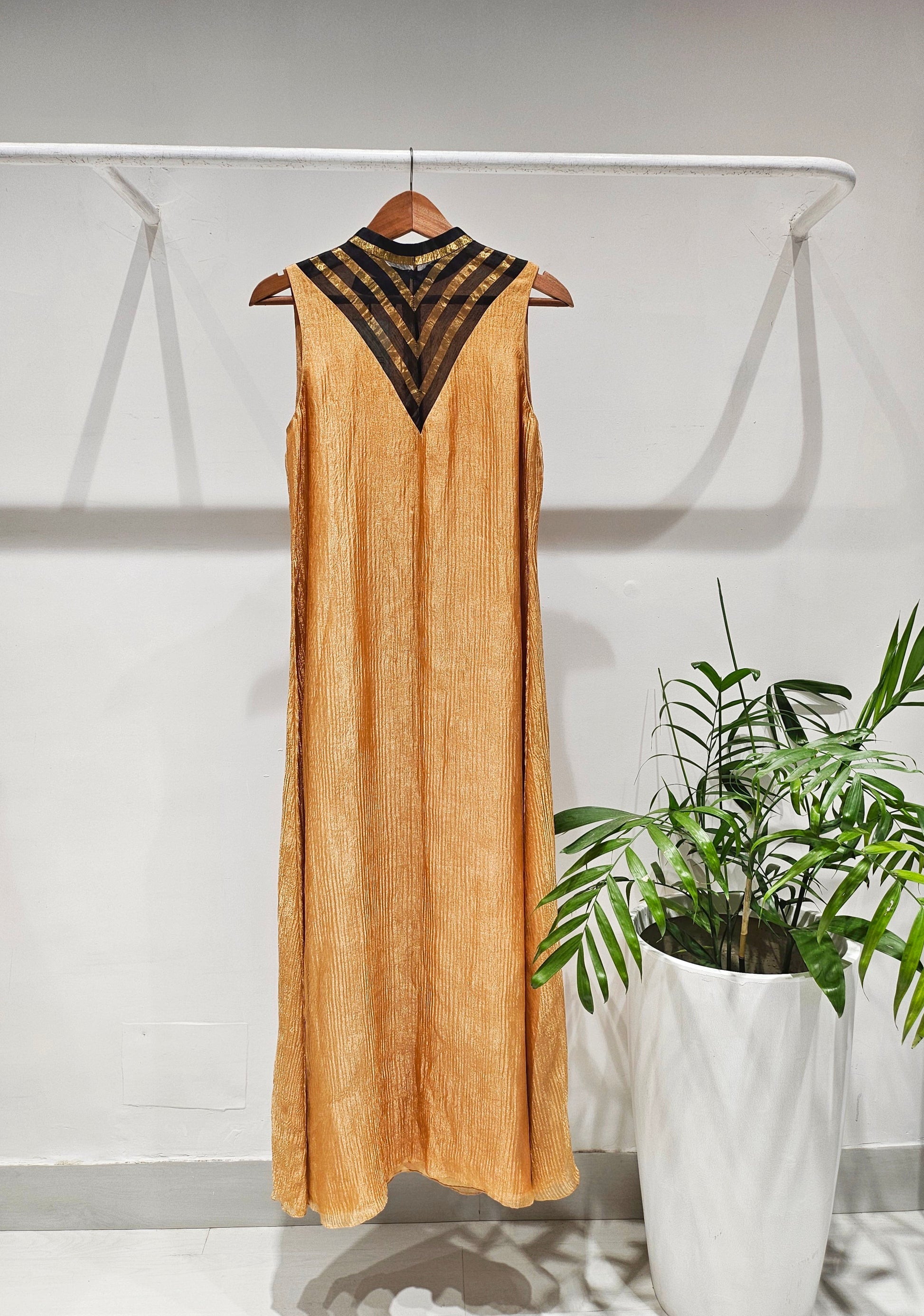 Made from crushed tissue organza silk, this long maxi dress features a high collar neckline constructed from a contrasting fabric. Style it with jewelled accessories and sleek pumps.