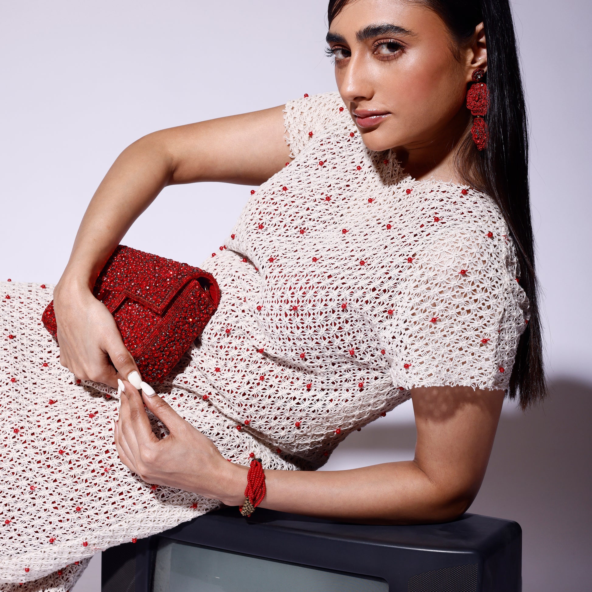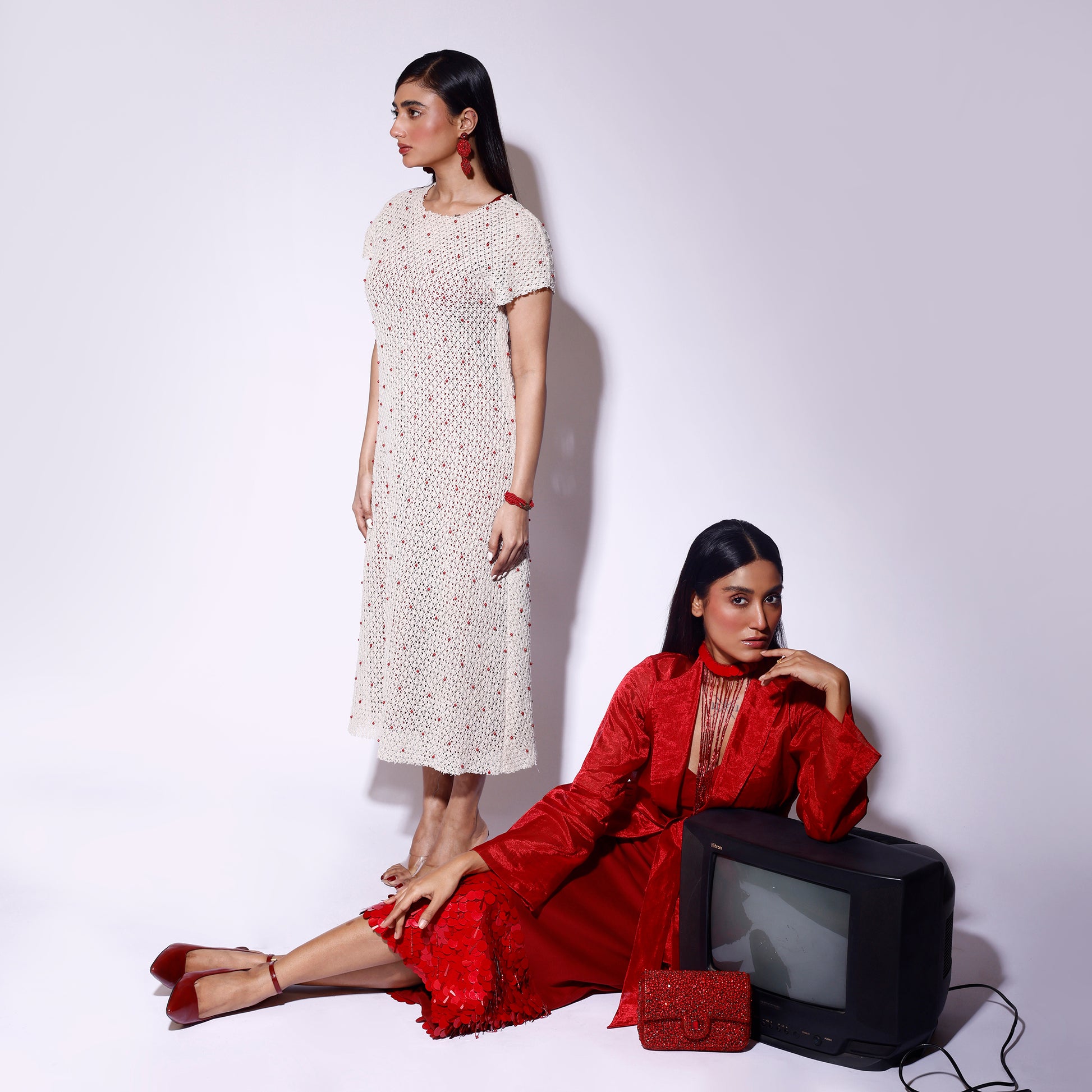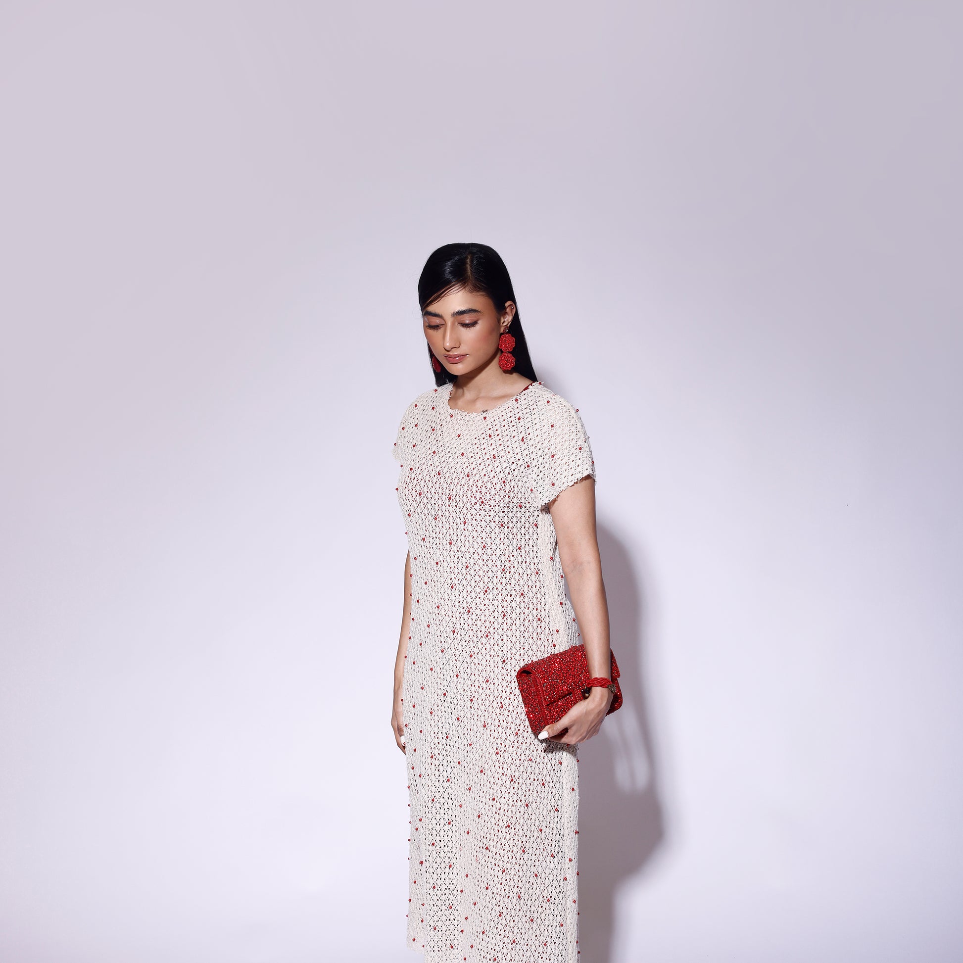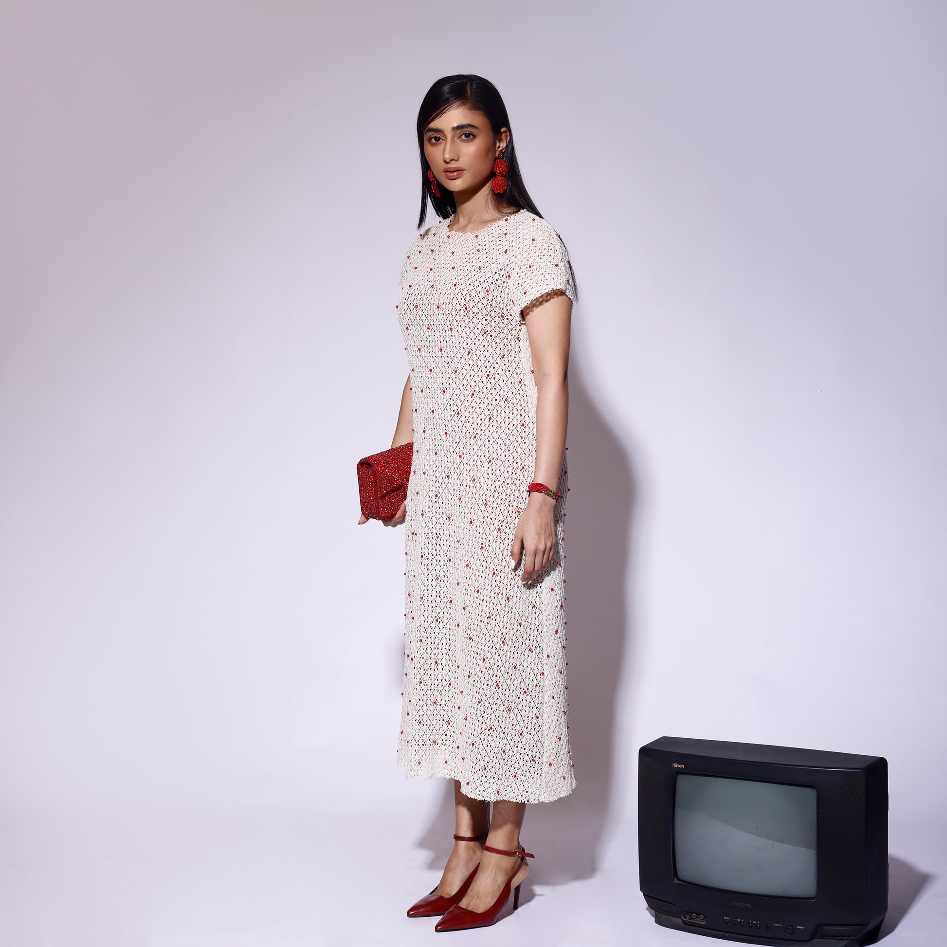 A perfect blend of lightness and luxury, this cotton net dress features intricate pearl embroidery that adds a touch of sparkle and sophistication. The airy, delicate fabric and refined design make it ideal for both casual outings and dressier events.