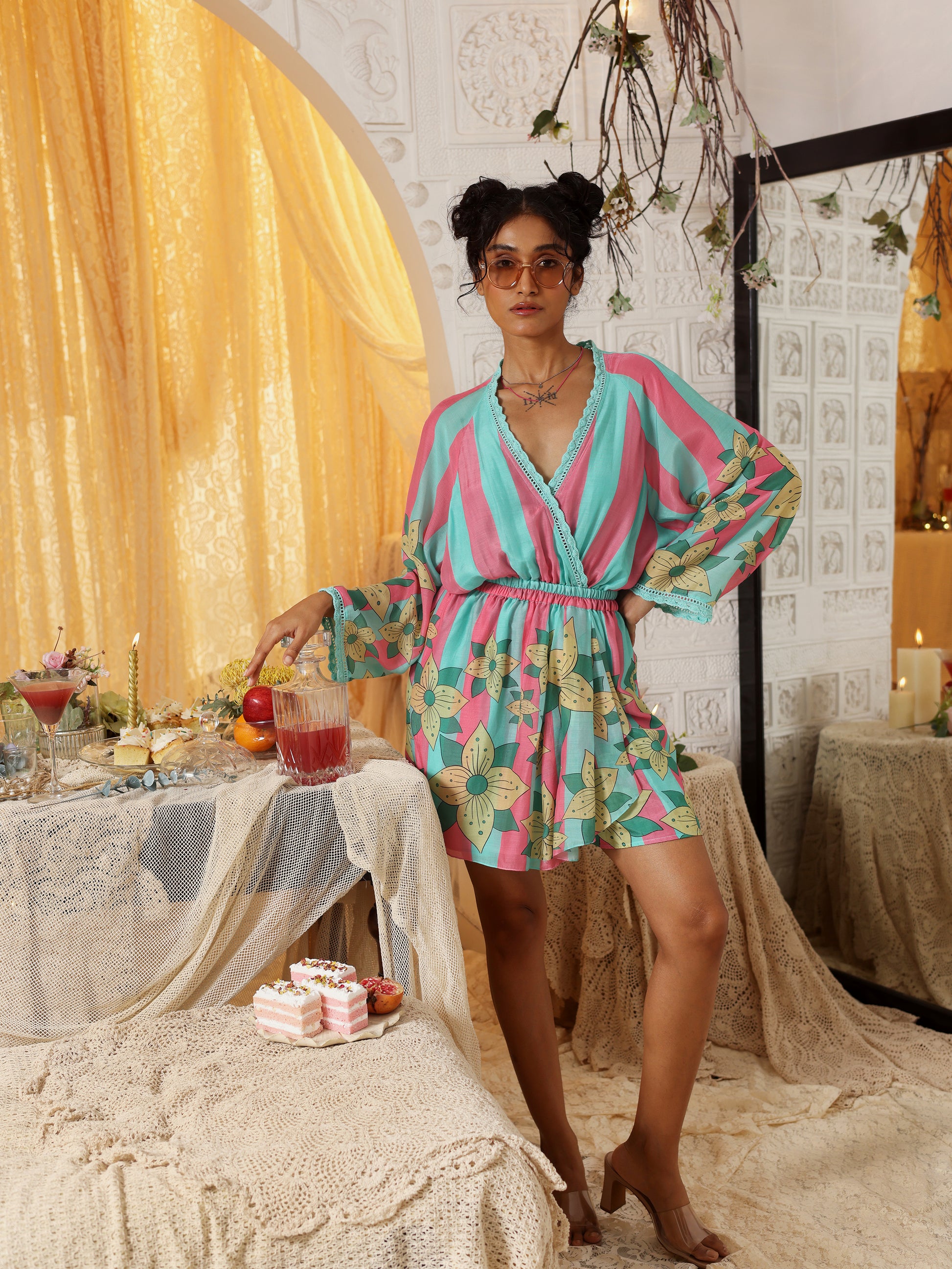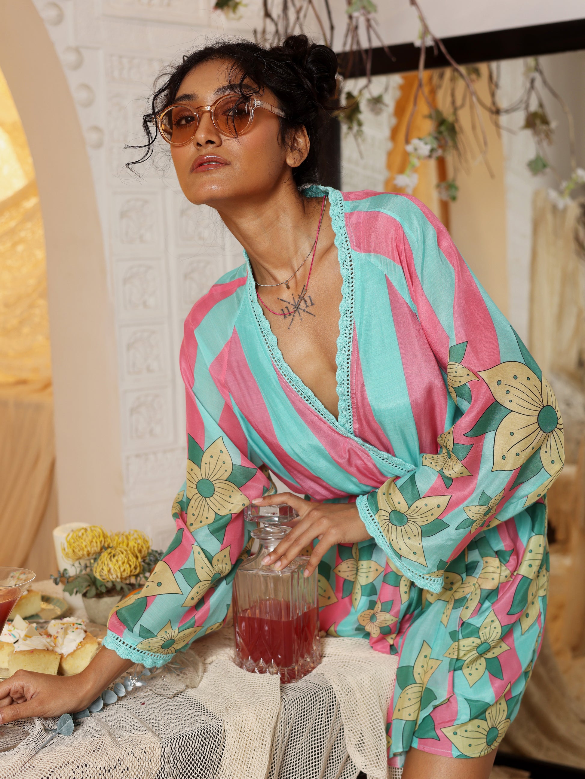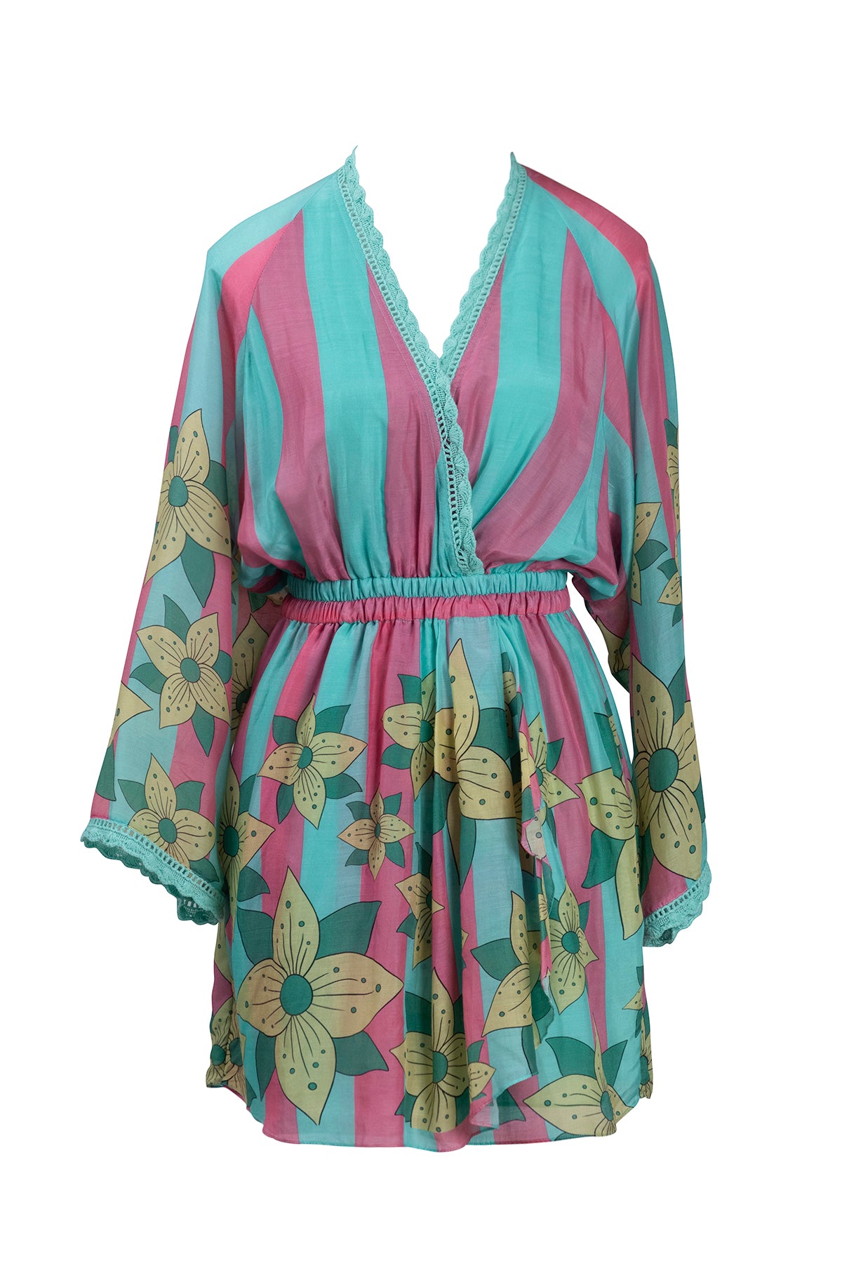 Youthful and breezy, this short jumper in pink-blue cotton silk stripes is your go-to outfit for carefree summer moments. The soft sheen of silk meets breathable comfort, while lace-trimmed neckline details add a sweet, romantic touch. The cinched elastic waist flatters the figure, making it perfect for resort lounging, brunches, or sightseeing under the sun. Pair with sandals and a straw hat for an effortlessly chic look.