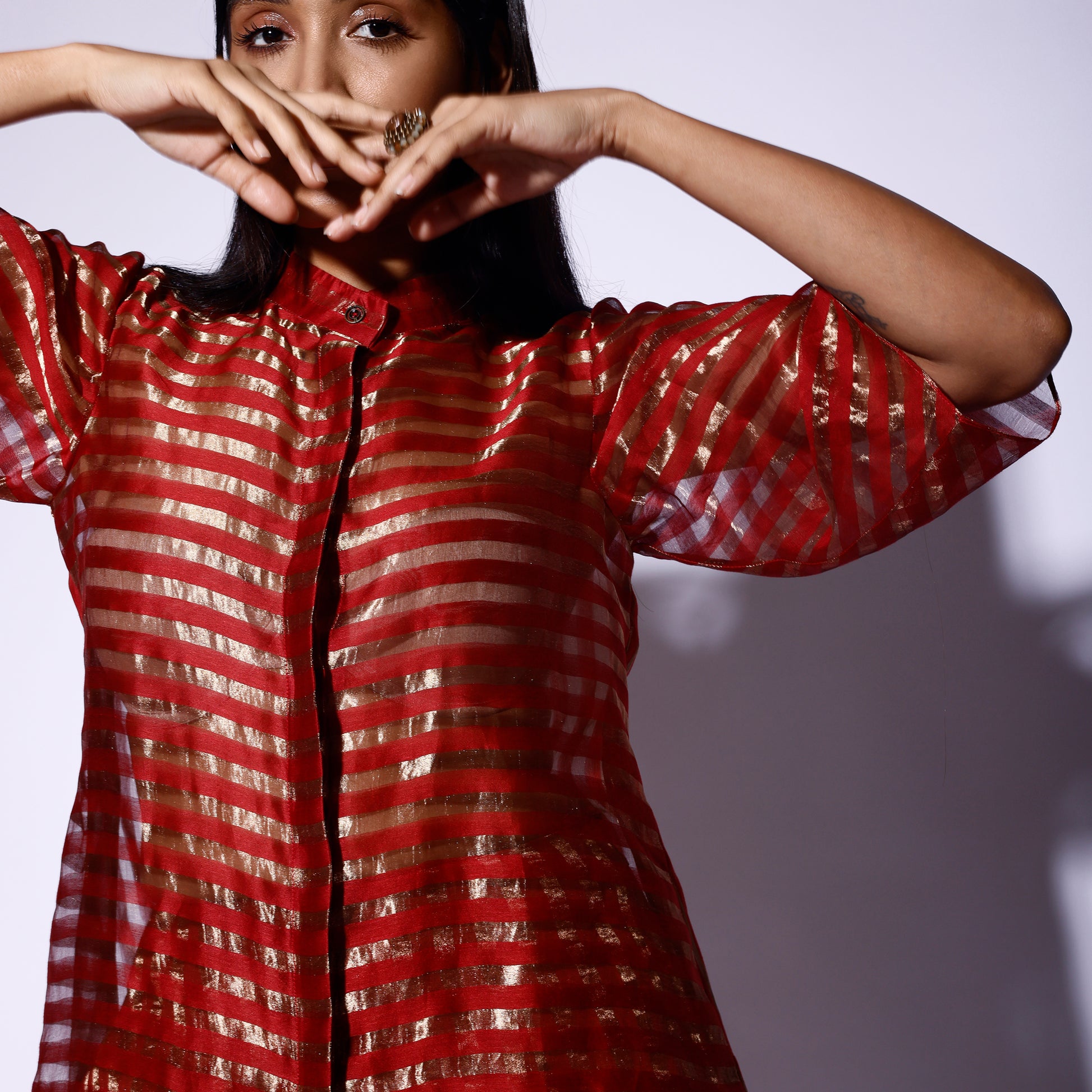 This statement red shirt with gold stripes and a traditional Chinese collar brings a fusion of classic and contemporary style. Adding an air of elegance to your wardrobe with this red skirt featuring striking gold stripes and a daring side slit. The luxurious fabric, flattering cut and sleek design creates a bold, yet refined look, making it perfect for evening outings or festive occasions when you want to make a statement. Bold, sophisticated, and timeless.