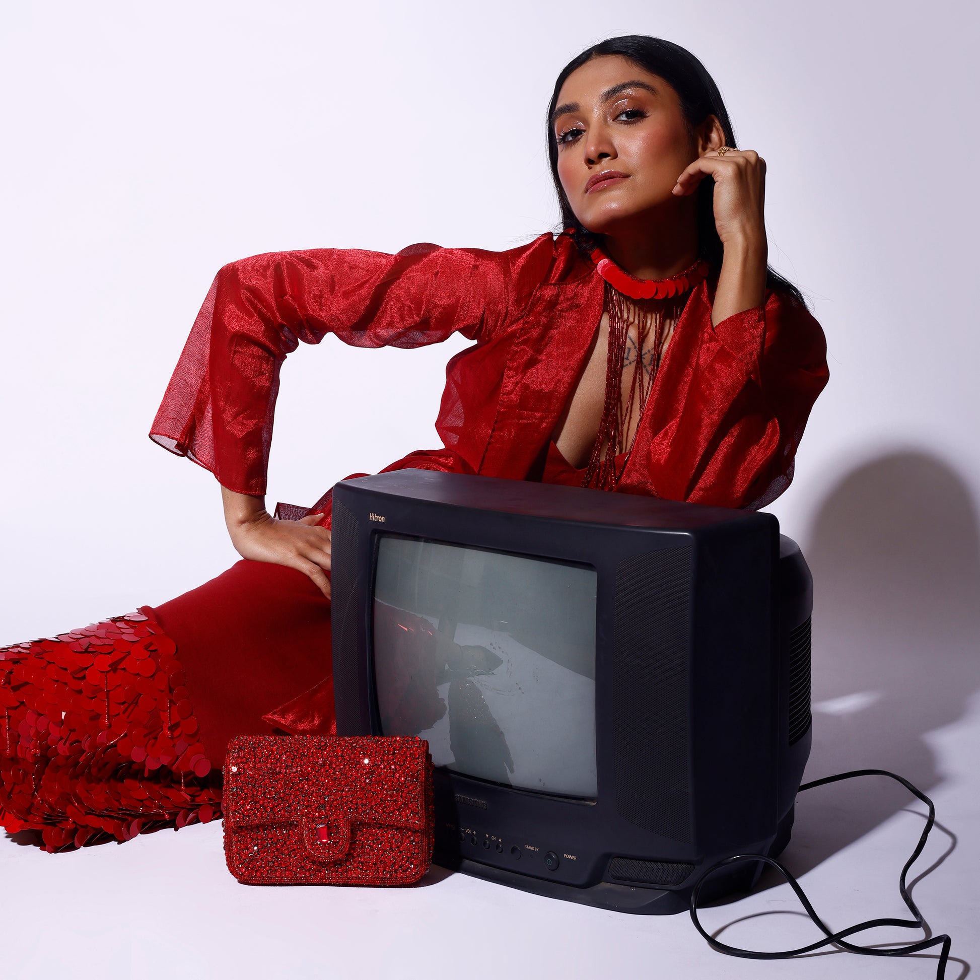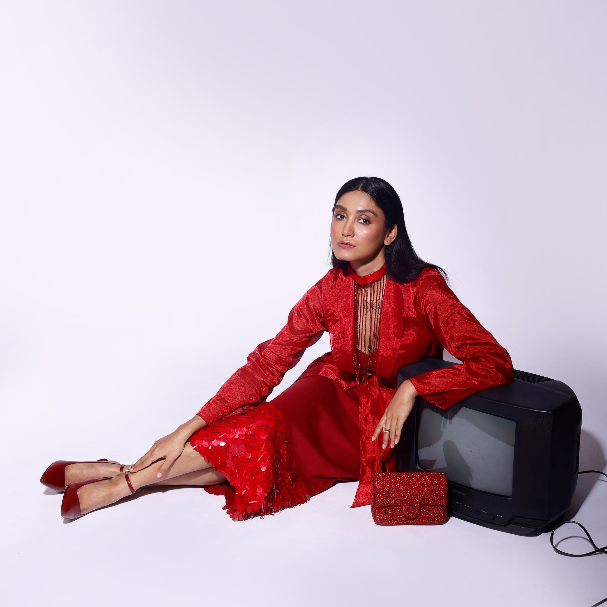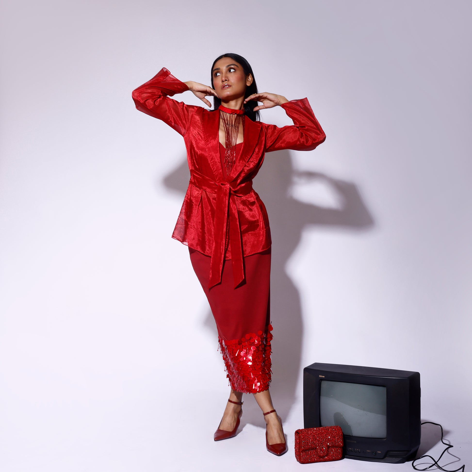 Elevate your style with this luxurious red silk tissue wrap top. The delicate sheen of the silk fabric, paired with the flattering wrap-around design, creates an effortlessly chic look. Perfect for a dressier occasion or a night out, this top offers timeless elegance with a modern twist.
