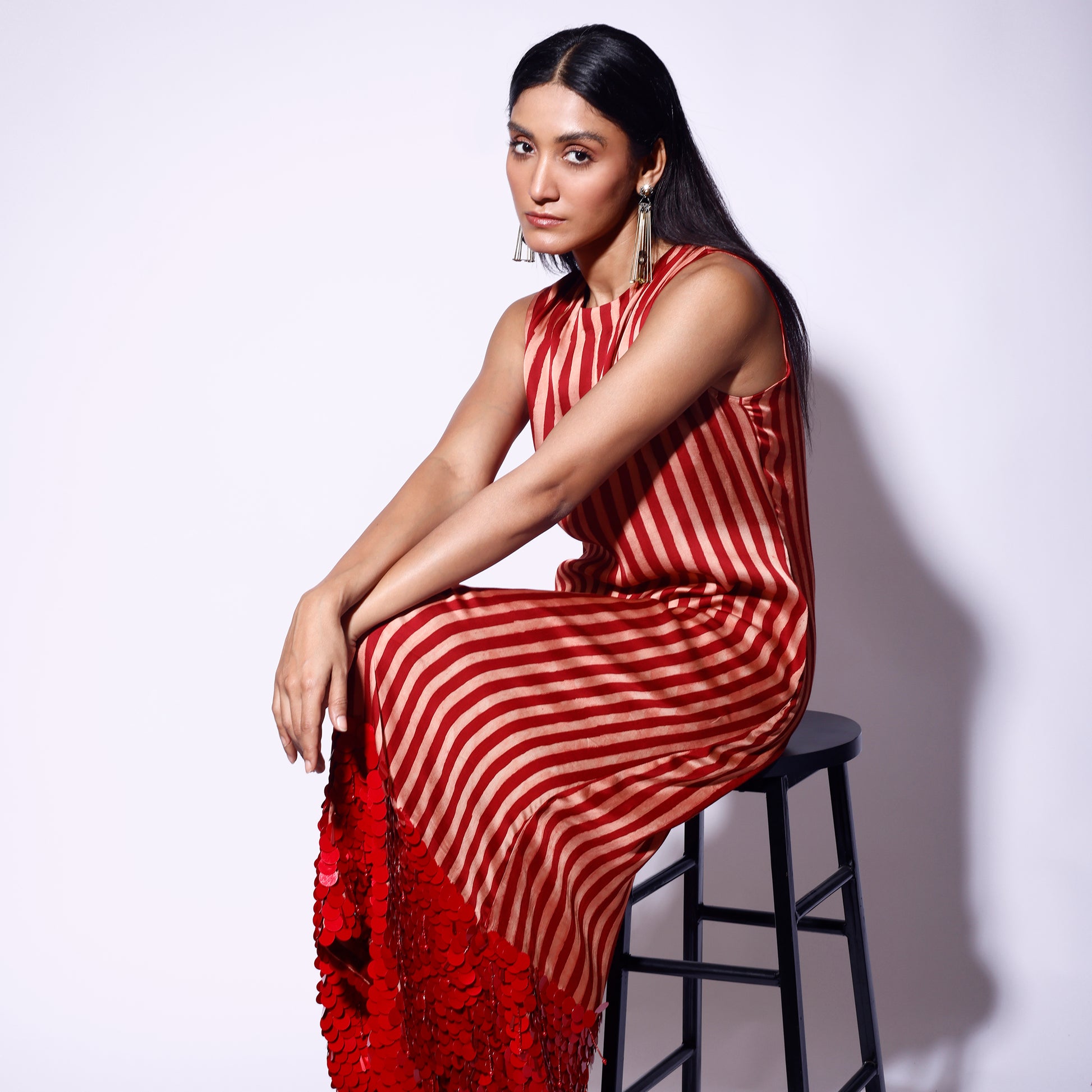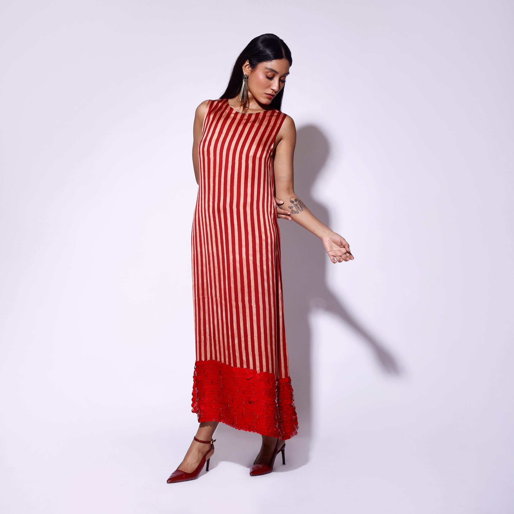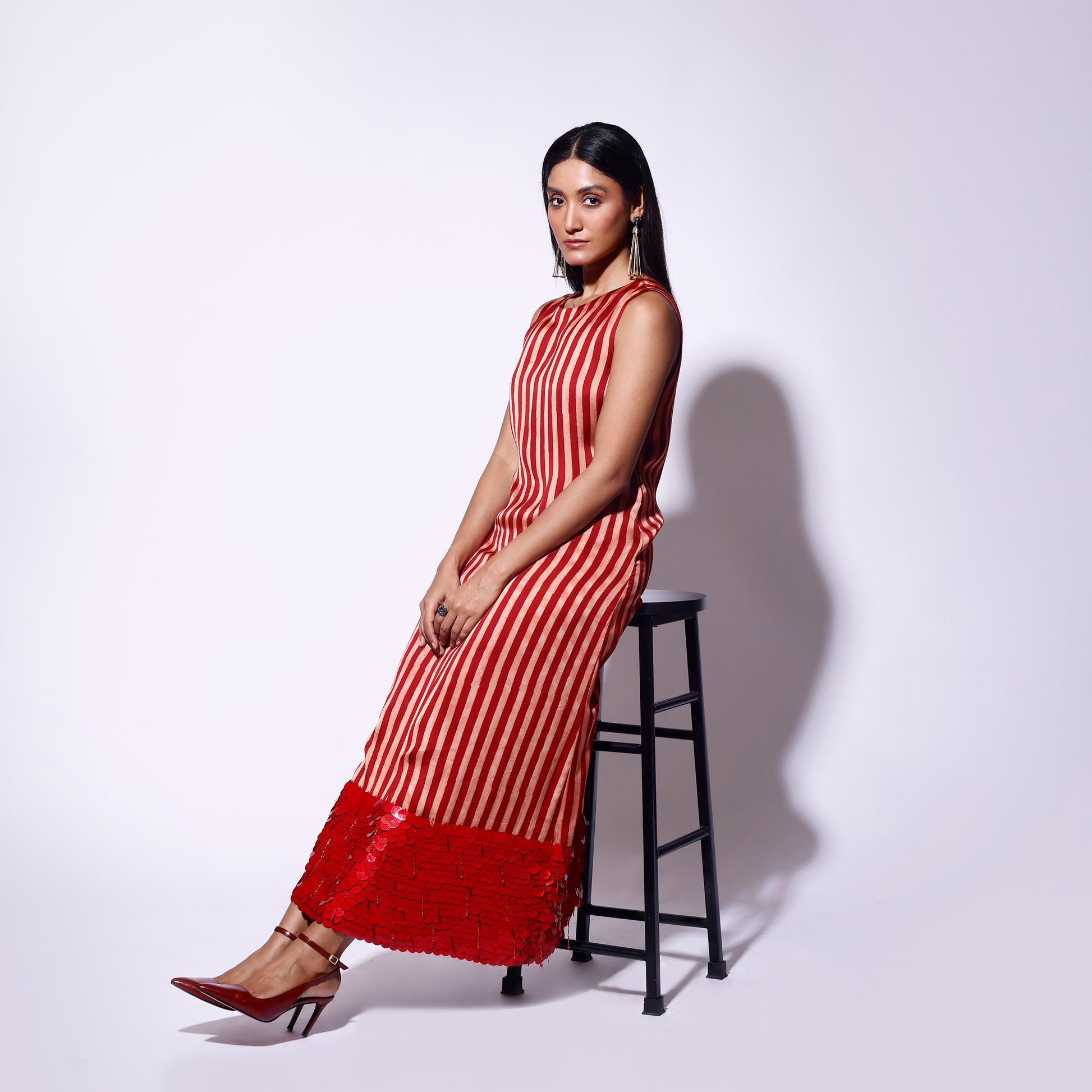 Make a bold statement with this stunning red and white striped midi dress, adorned with drop sequins and intricate embroidery. The playful stripes combine effortlessly with the sparkle of sequins, while the flattering midi length and feminine silhouette create a chic, contemporary look. Perfect for evening events or festive occasions, this dress adds a touch of glamour to any wardrobe, ensuring you stand out in style.