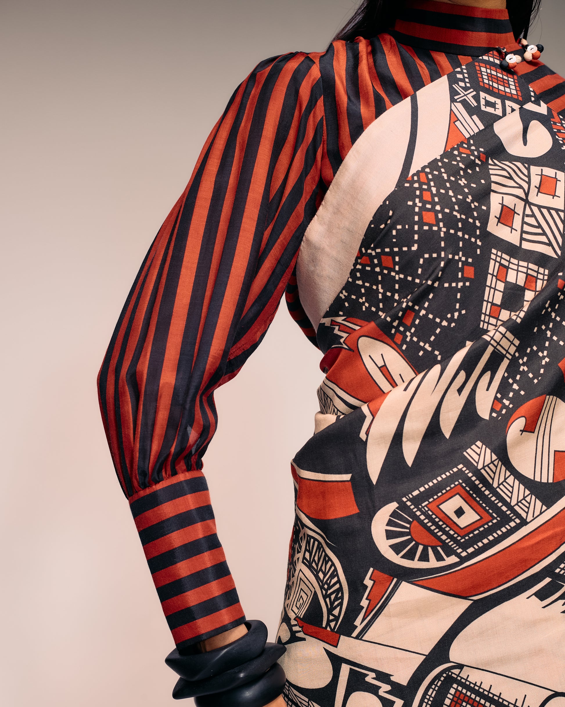 Crafted in soft, pure silk, the silhouette merges contemporary ease with timeless sophistication. The high neckline adds a touch of formality and poise, while the relaxed fit ensures effortless drape and comfort. The alternating stripes of rust and black create a dynamic visual rhythm. This top pairs beautifully with high-waist trousers, tailored pants, or a structured pencil skirt for formal occasions. For an artistic twist, it can also be worn with the Rust Black Check Drape Skirt or layered under the Rust Print Kantha Overcoat for a statement ensemble. Complete the look with minimal jewelry and sleek sandals or heeled boots.