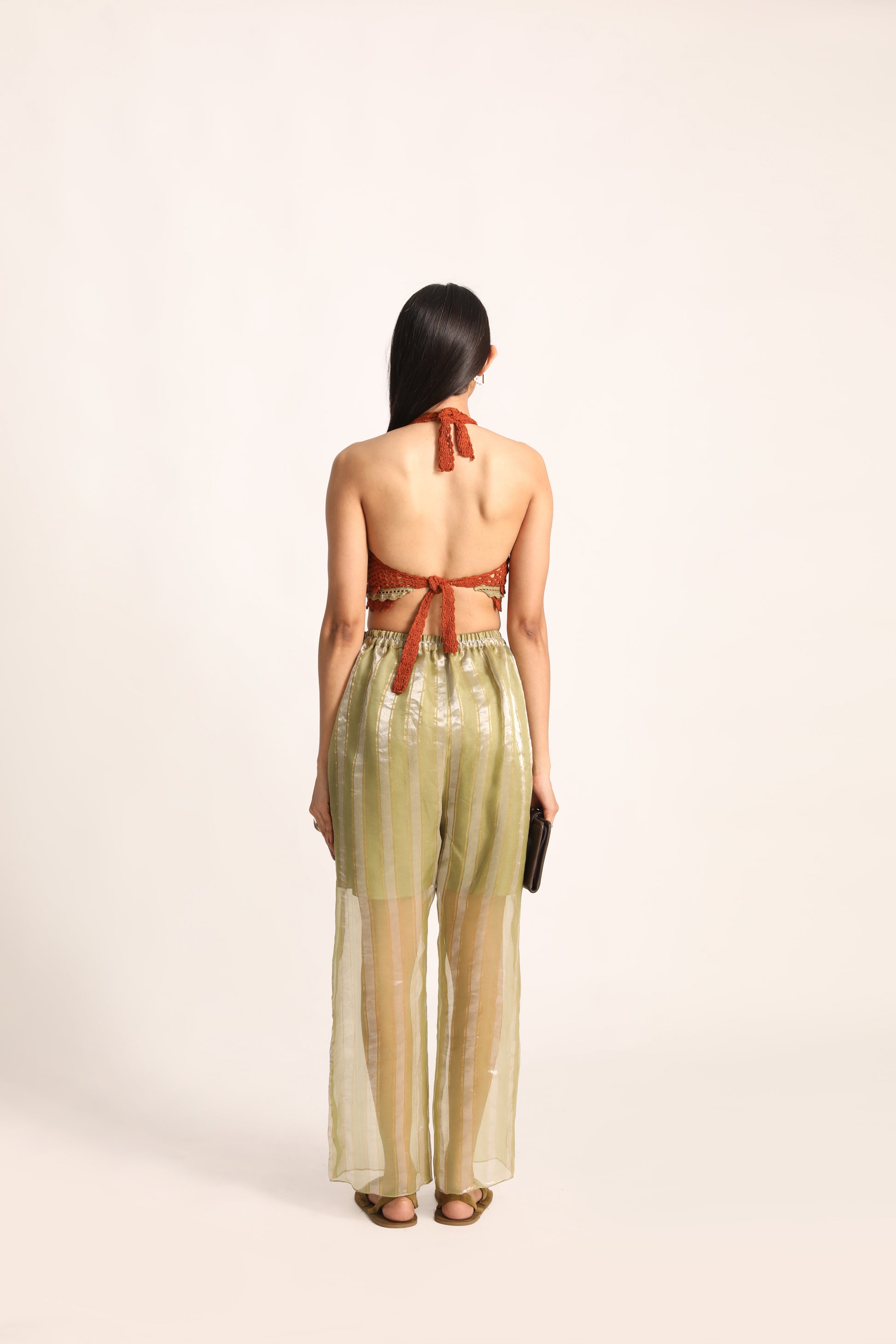 This hand-crocheted bralette top features printed cotton tie-up at the back and can be worn with matching or contrast shorts and pants for a summer chic look.