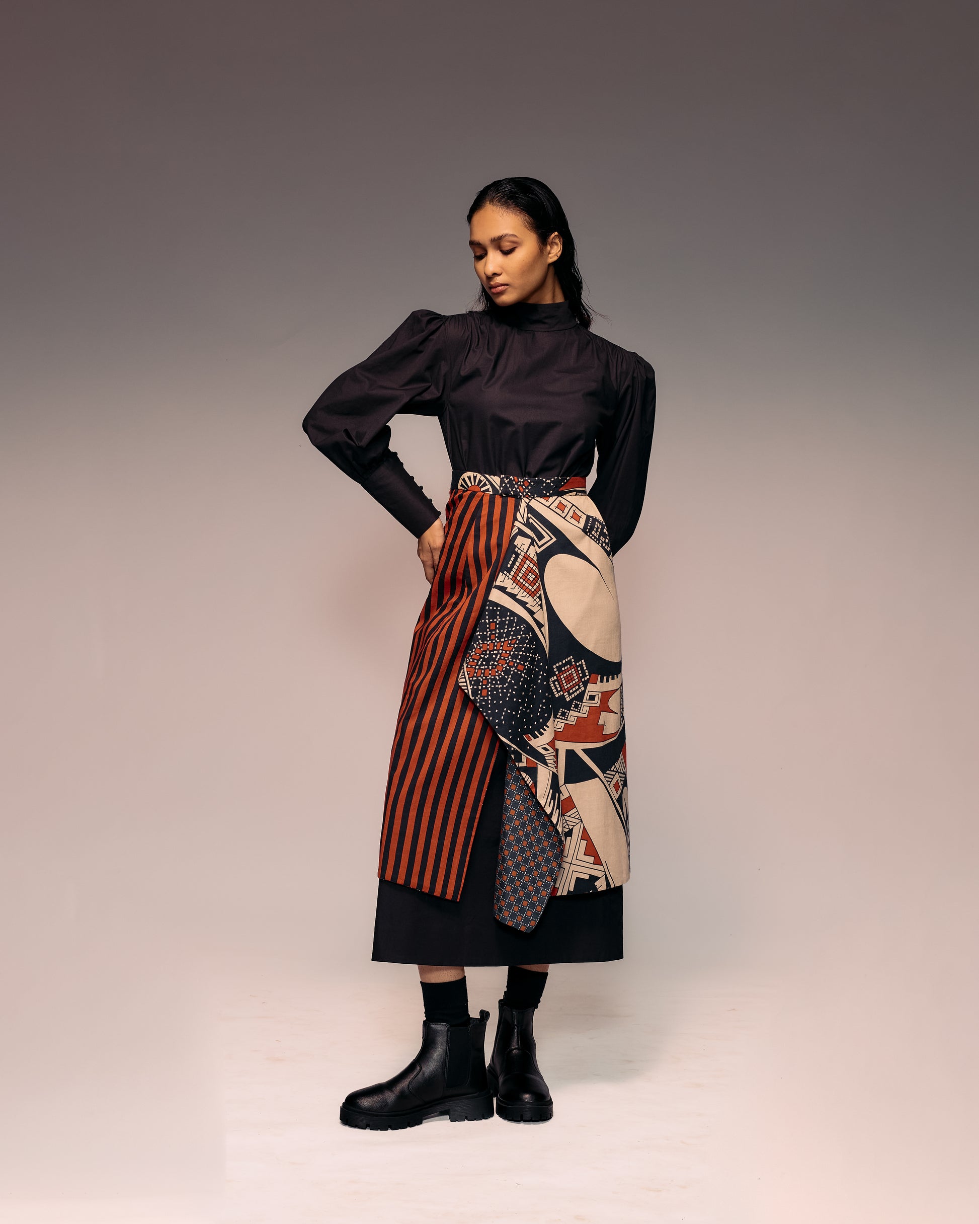 An artistic fusion of prints and textures, this reversible overlap skirt combines rust pottery prints, bold stripes, and black-rust checks in seamless harmony. Crafted from breathable cotton-satin, it offers soft structure and a fluid drape. The high-quality tailoring ensures perfect alignment of patterns and a polished finish. Pair it with a solid blouse or the matching striped top for a coordinated statement look. Ideal for contemporary wear, art events, or stylish evenings through warm to mild seasons.