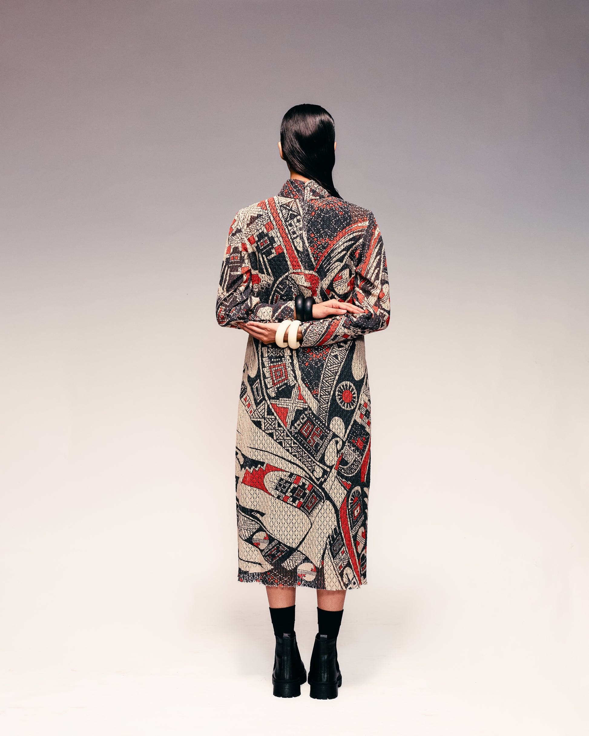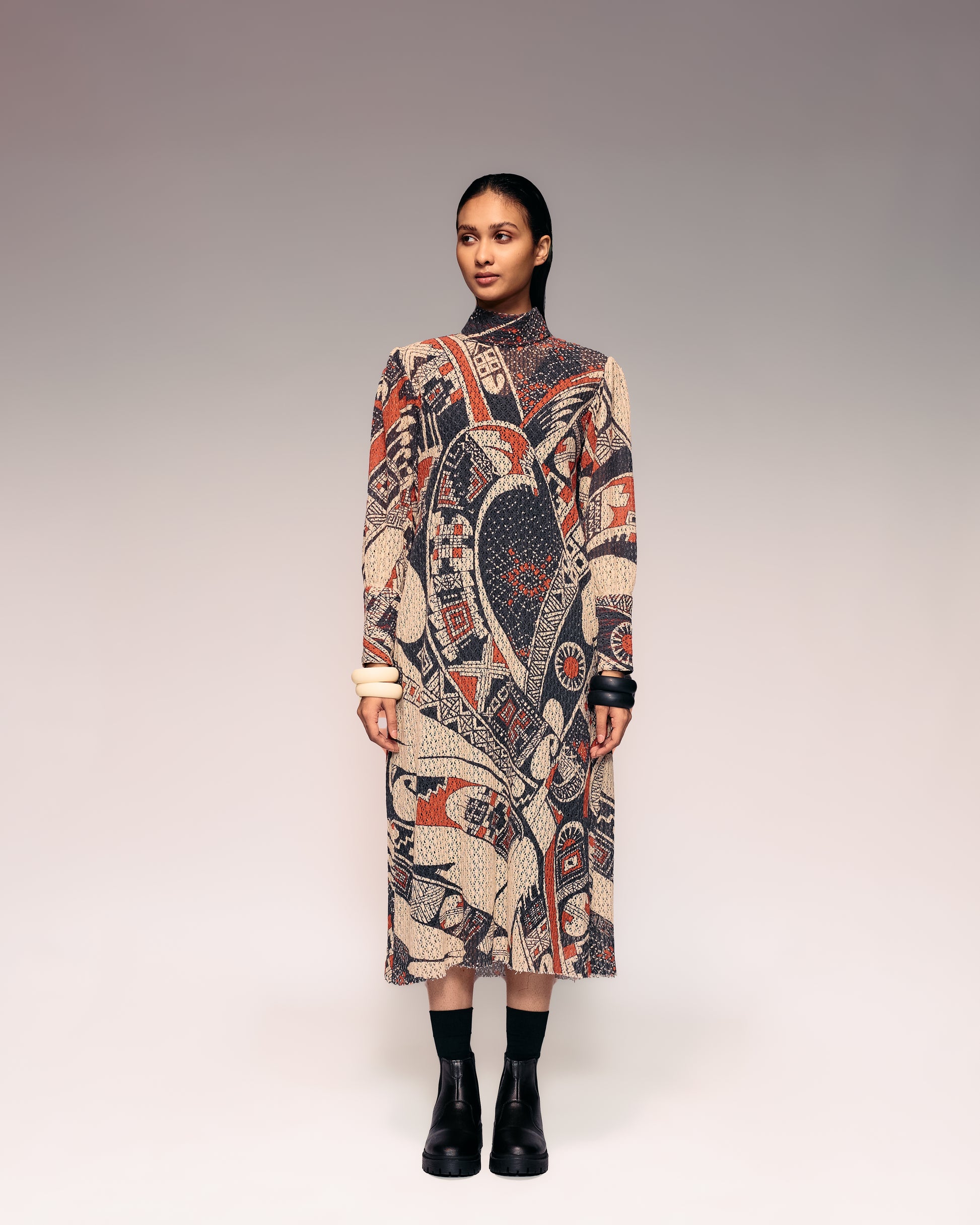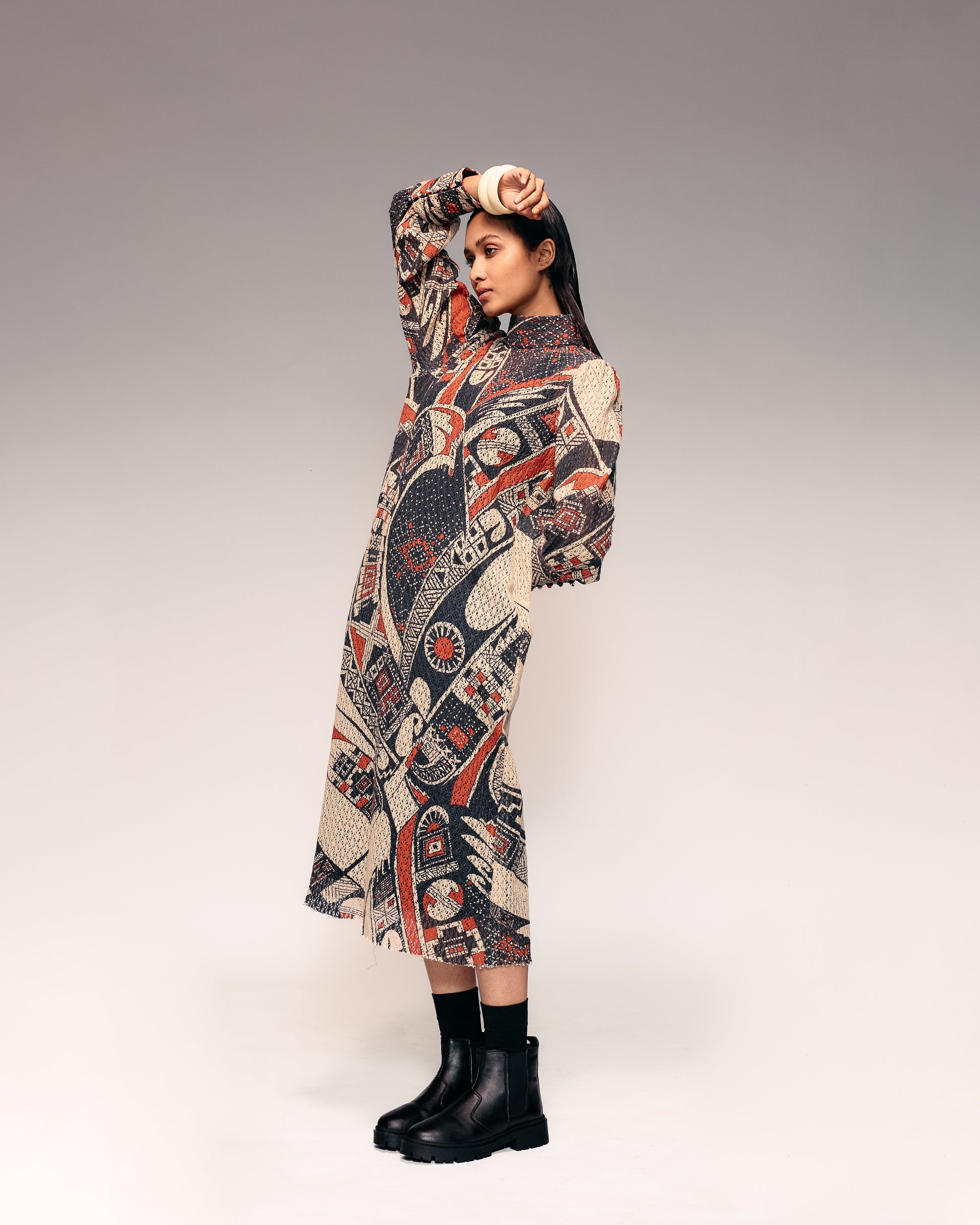 Crafted in soft cotton-net fabric, this Rust Print Midi blends comfort with artisanal elegance. The silhouette flows effortlessly with a relaxed fit and mid-length finish, ideal for classy and chic wear. Inspired by Mata Ortiz pottery motifs, its rust and black tones evoke earthy sophistication. Tailored with fine stitching and careful lining, it offers breathability and luxury in equal measure. Pair it with tan sandals or minimal heels for brunches, travel, or summer gatherings. Perfect for day-to-evening transitions with effortless charm.