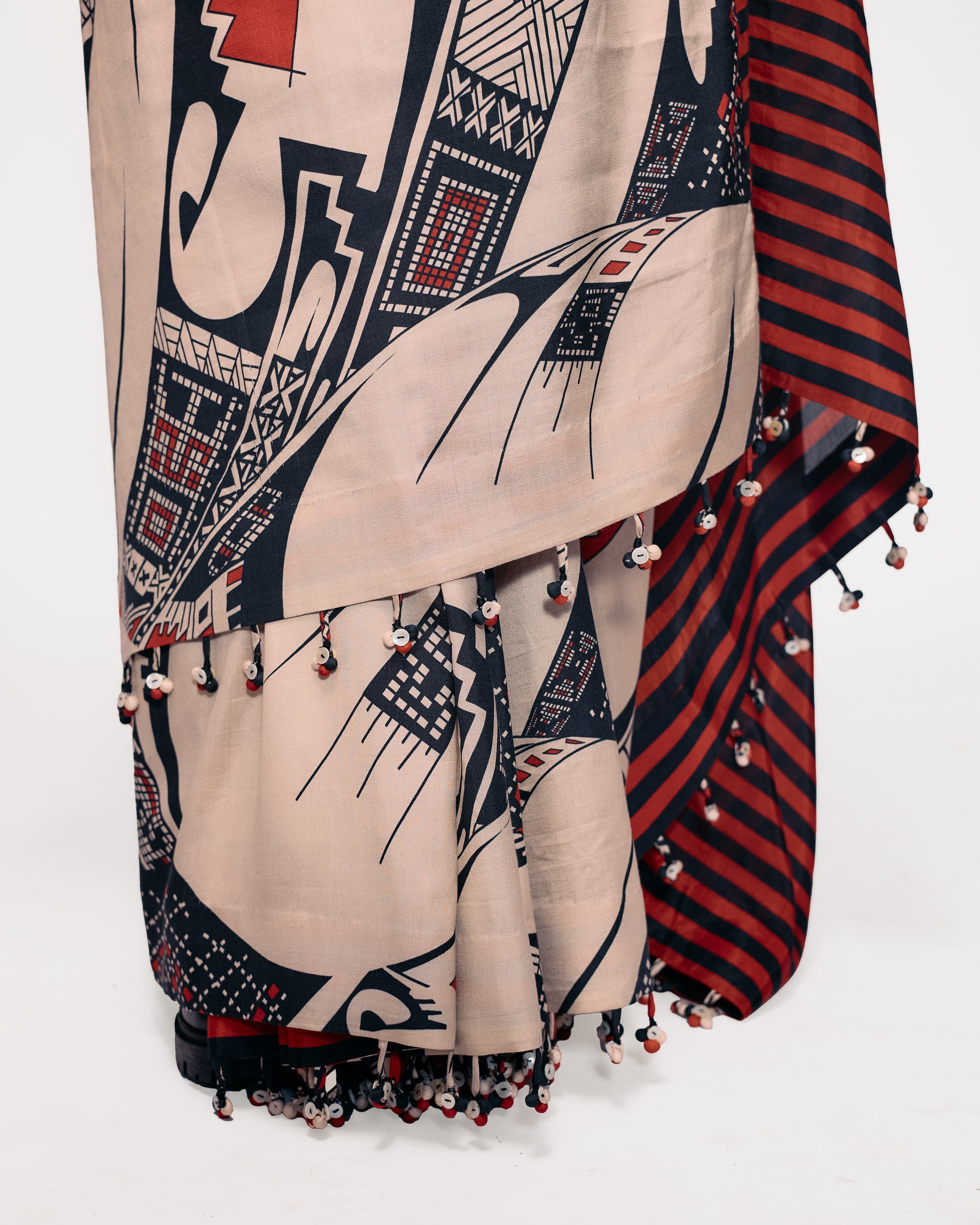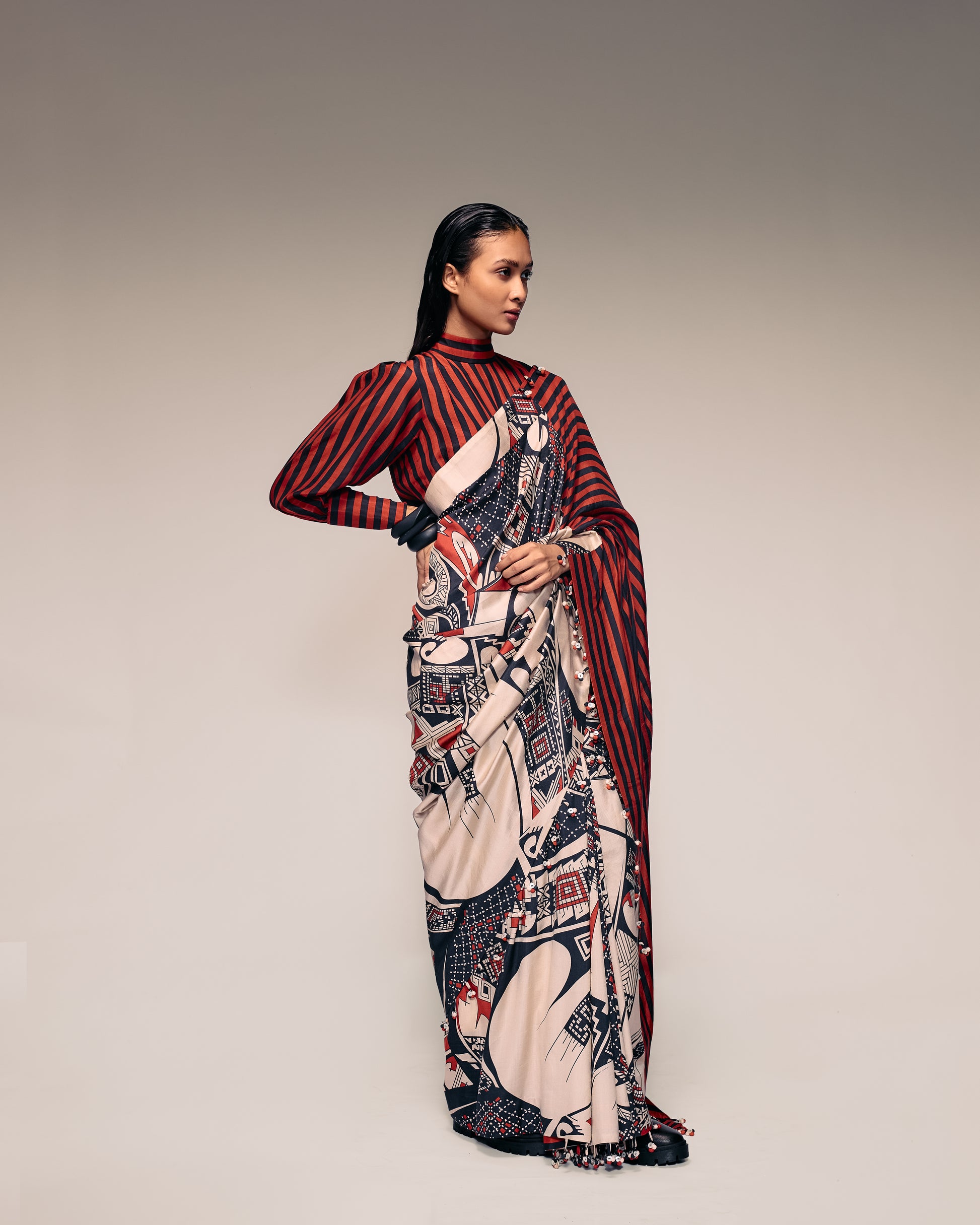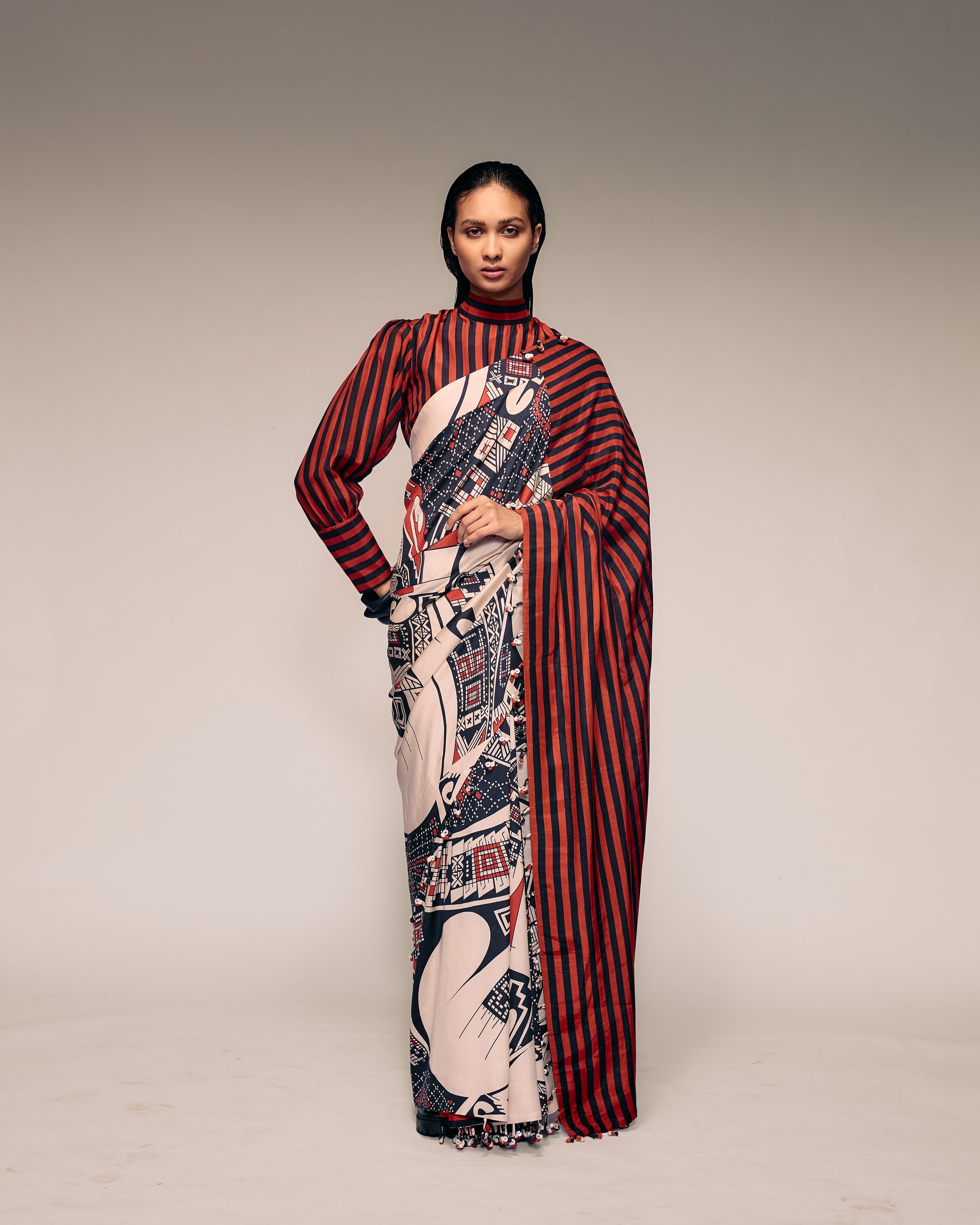 A statement piece crafted with exceptional artistic detail, this saree juxtaposes two distinct design philosophies a Mata Ortiz pottery-inspired design and a rust-black striped section seamlessly stitched together to create a balanced yet dramatic half-and-half visual. The