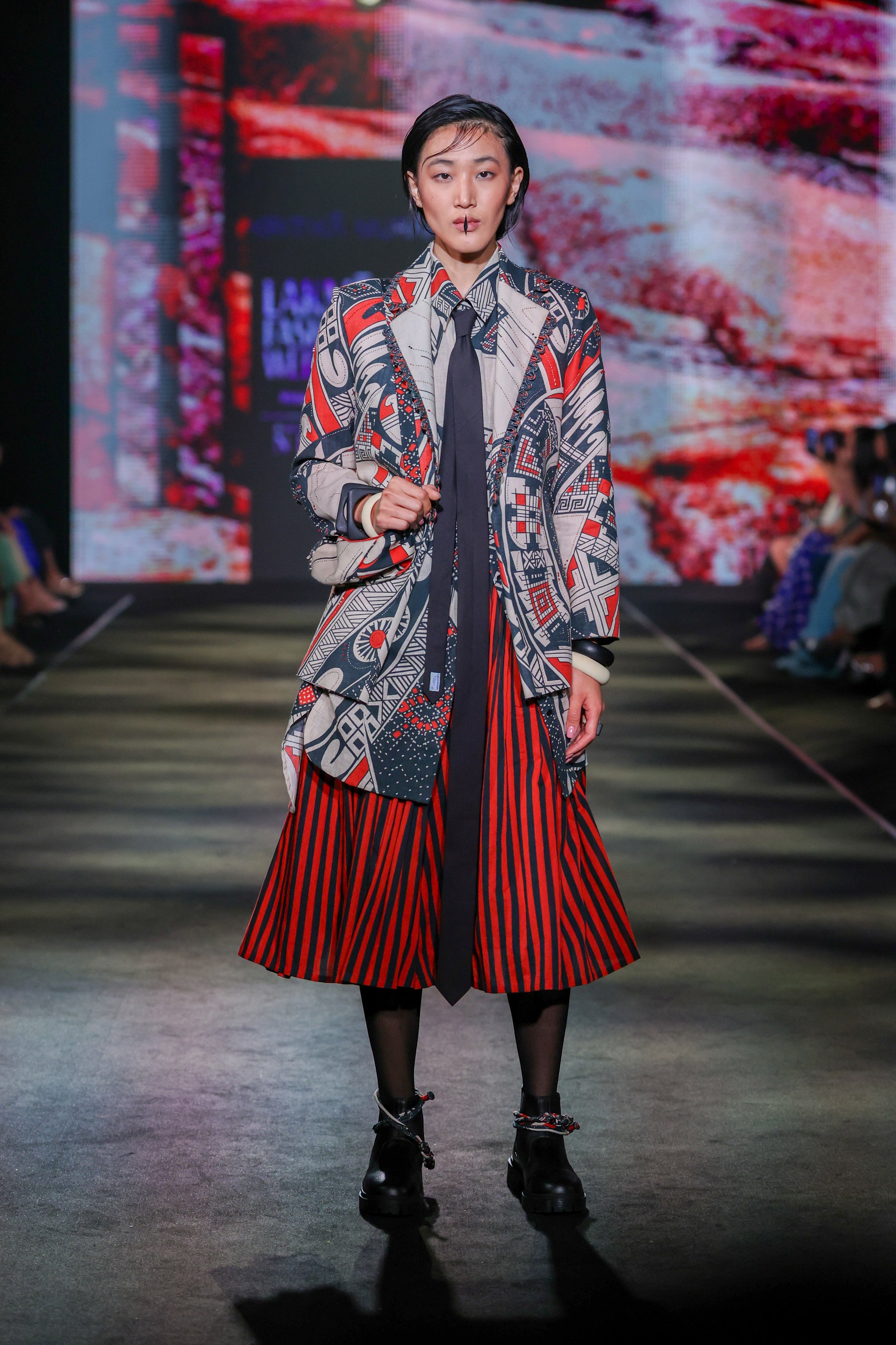 The print showcases stripes in rust and black, arranged in a rhythmic linear pattern that creates a striking visual flow. Made from fine cotton, the fabric is known for its feather-light softness and breathable comfort. Its naturally airy weave lends the skirt a graceful drape and flow. This skirt pairs beautifully with the Rust Print Linen Shirt Dress worn as an open layer or
