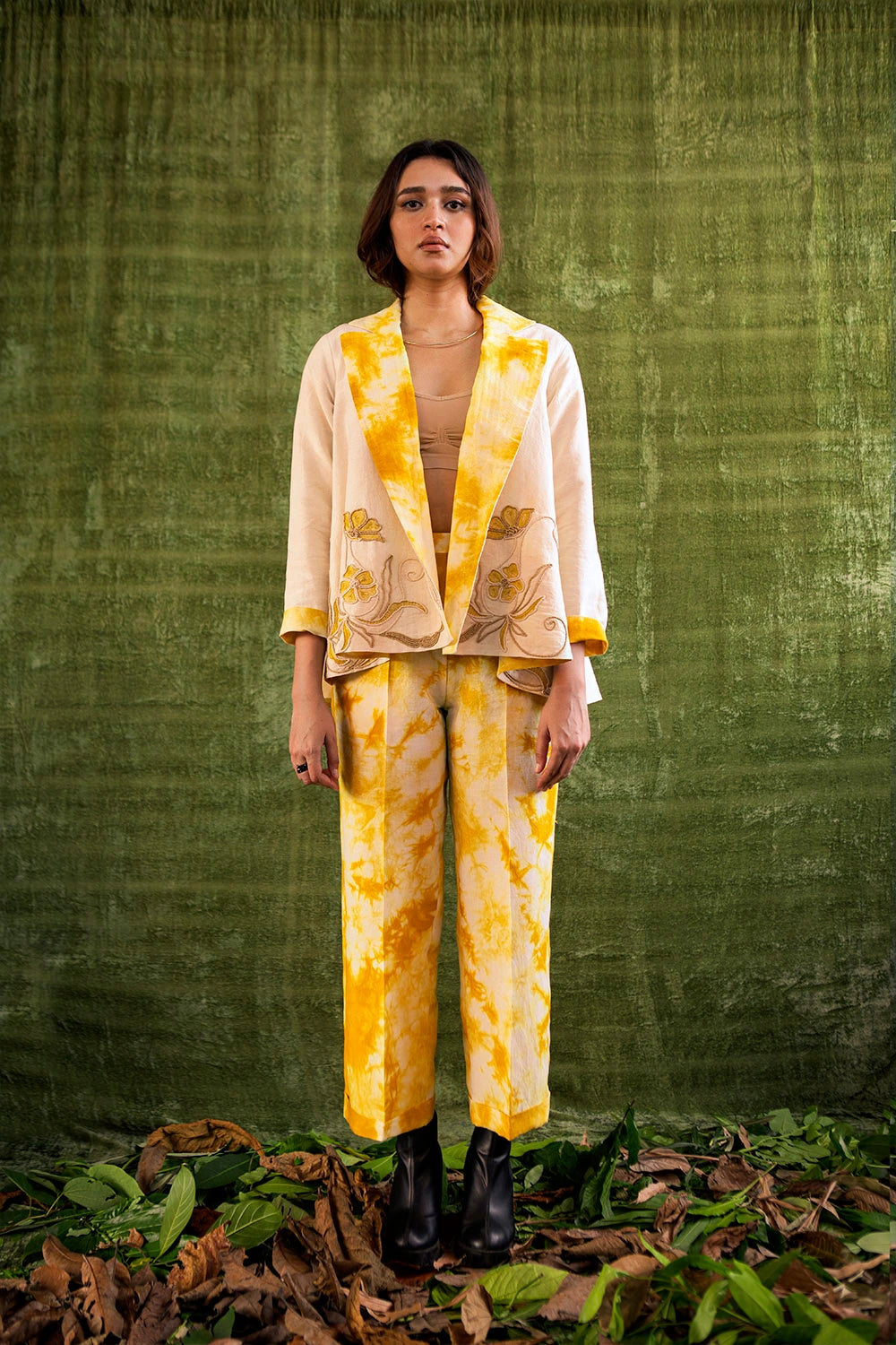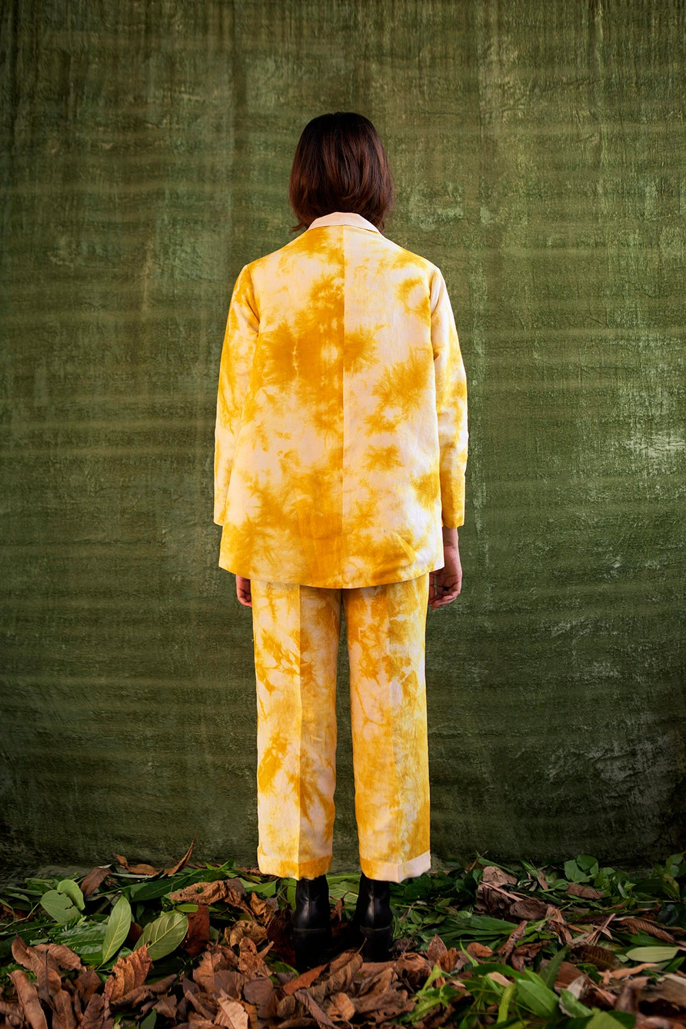 The yellow tie-dye ankle-length pant is inspired by 1920s men's wardrobe. Made in handloom linen, it features a cuffed hem and a front pintuck to add structure.