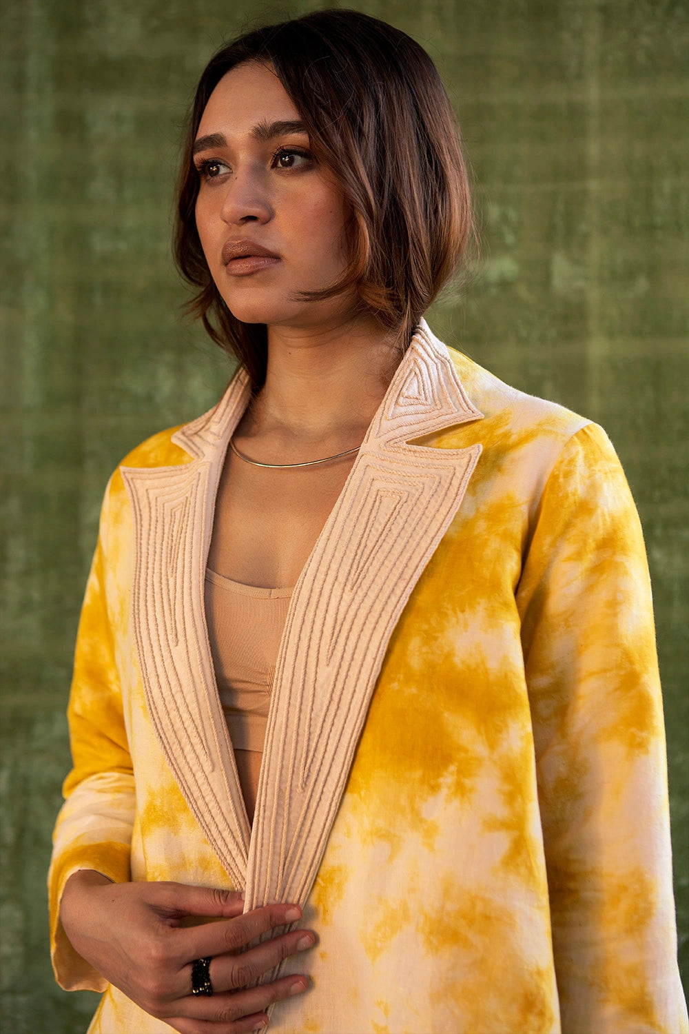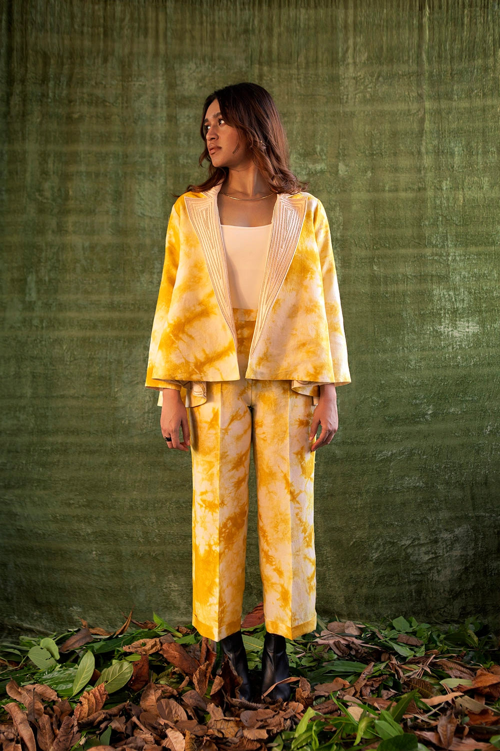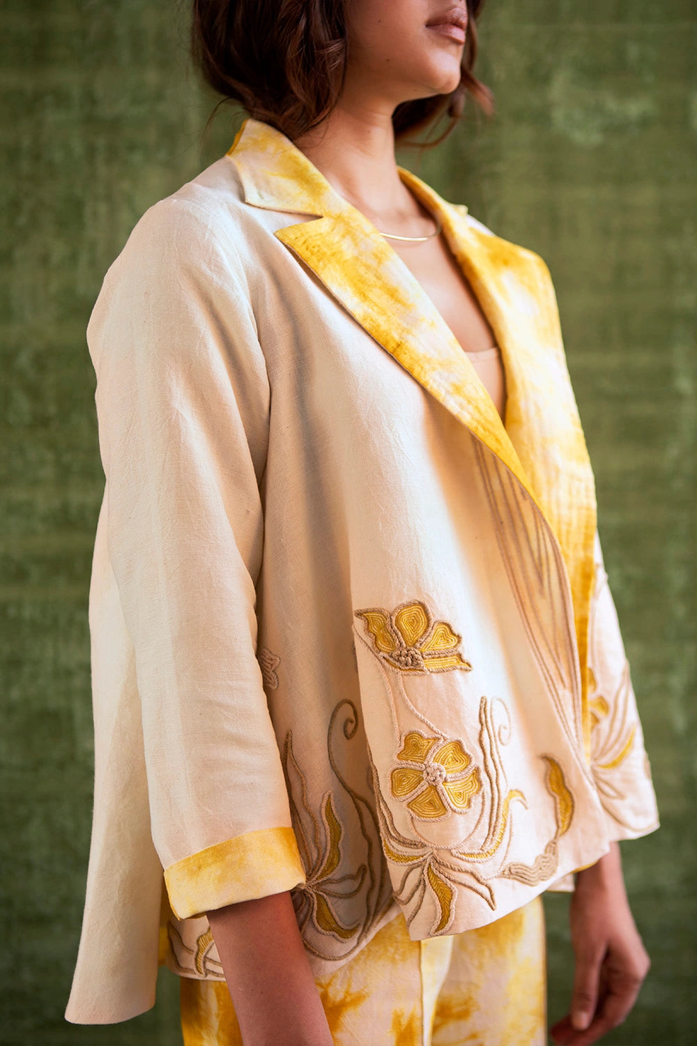 The yellow tie-dye anti-fit reversible jacket is inspired by the beauty of nature and the colour of the sunset. Made in handloom linen, it features cord-embroidered floral motifs on one side and an embroidered collar on the other.