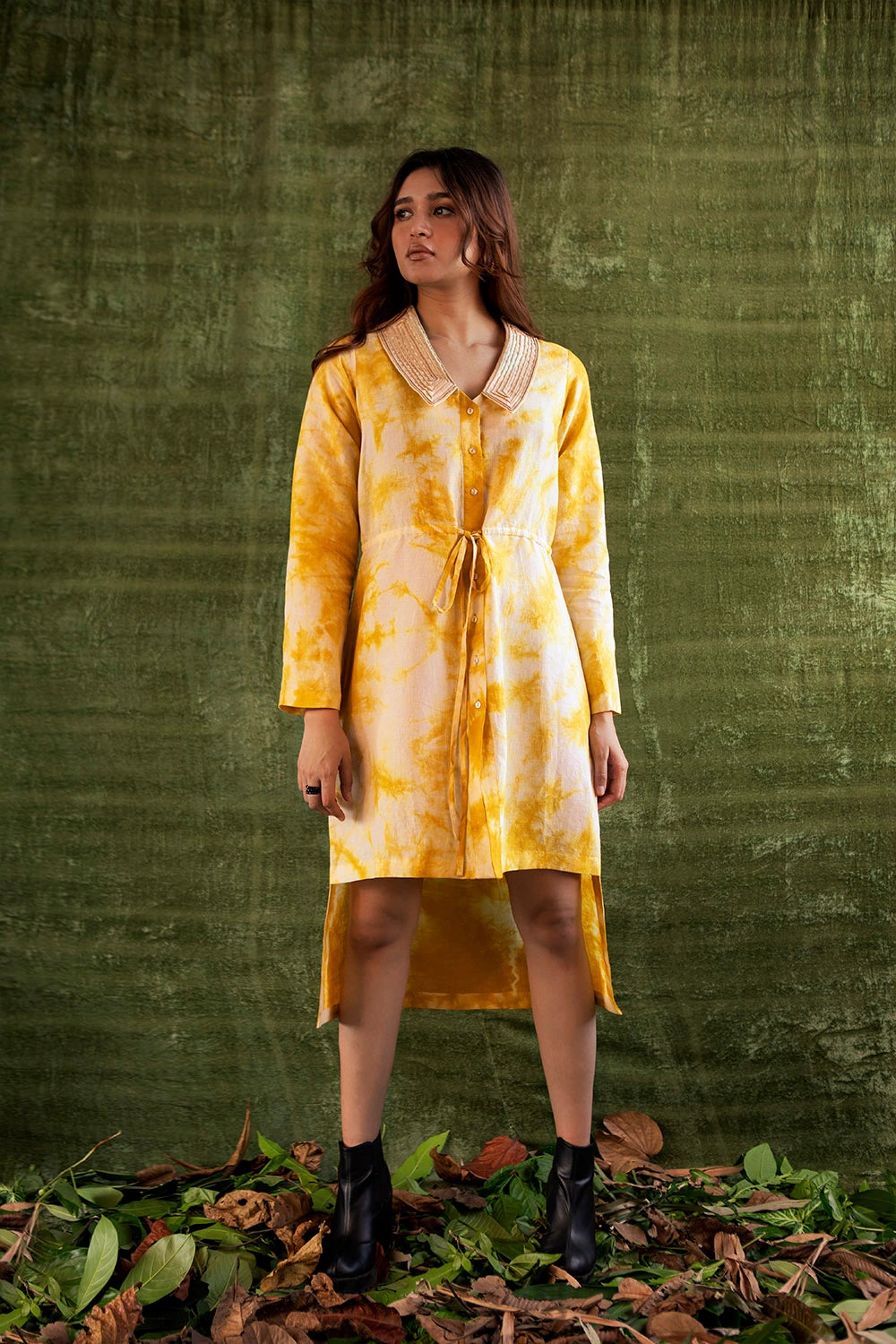 The yellow tie-dye asymmetric shirt dress is crafted in handloom linen. It features an embroidered collar and a back panel with a front button closure and drawstring at the waist to define the silhouette.