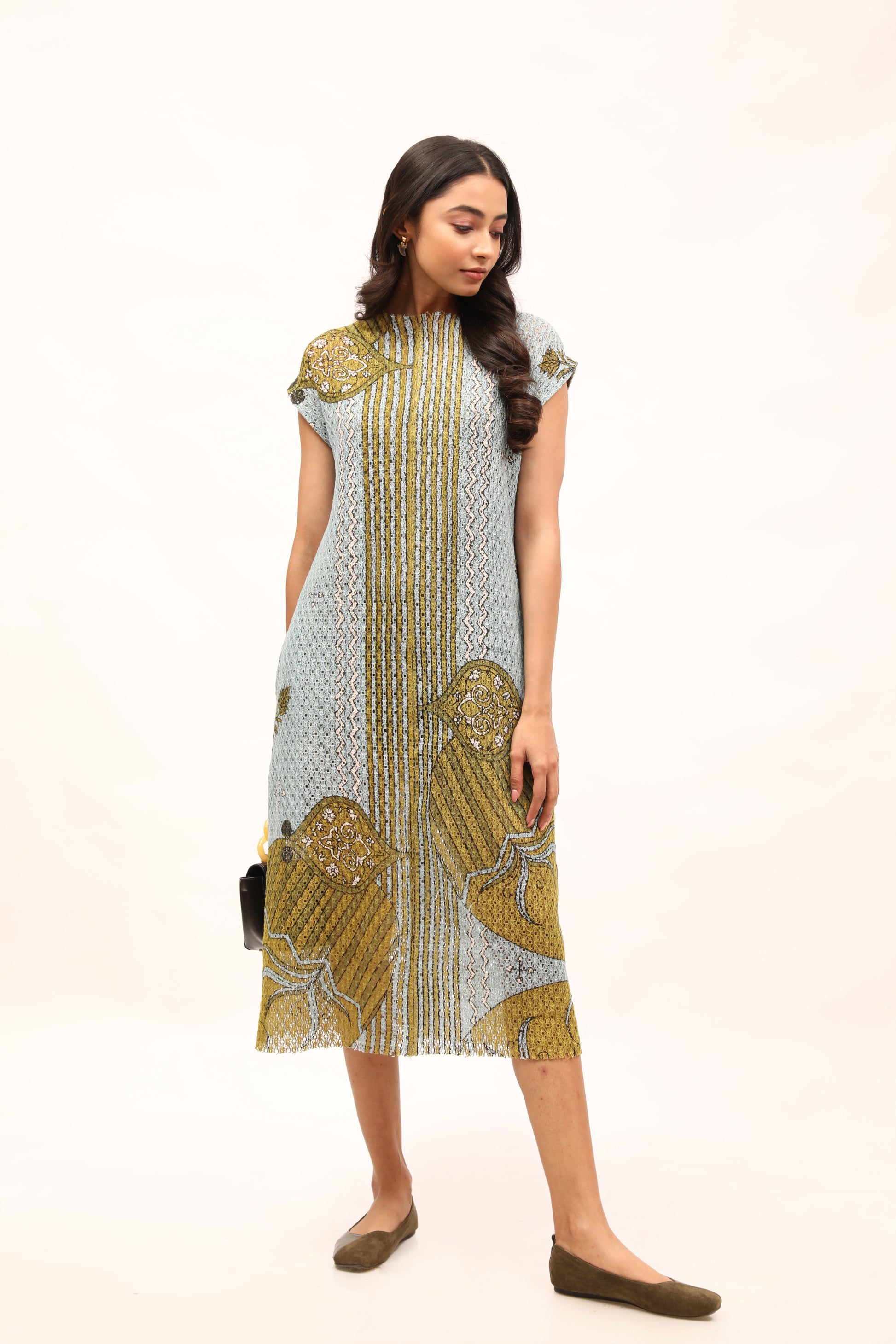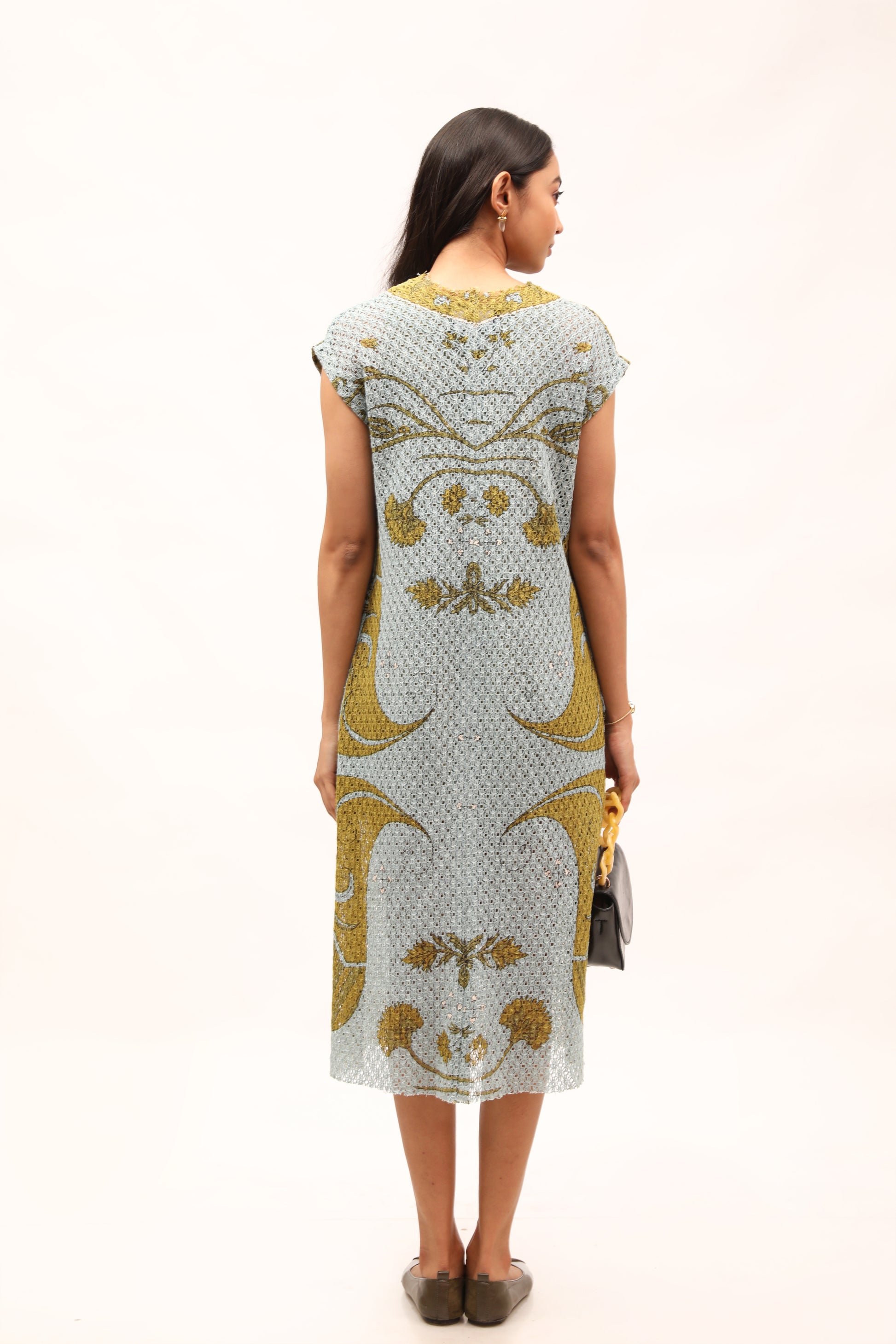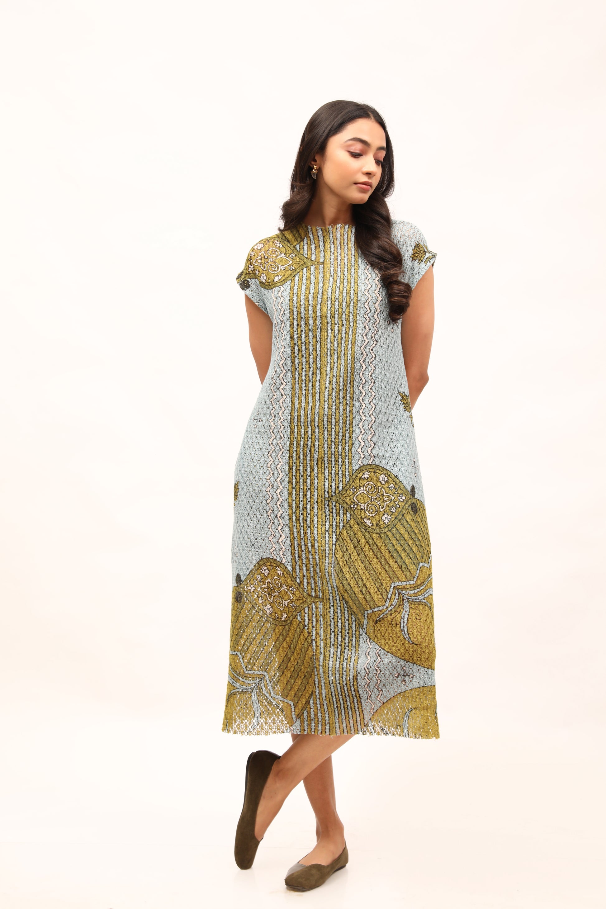 This printed cotton net dress has a relaxed, shift silhouette, elegantly detailed with drop shoulders and unfinished neckline. Style it with jewelled accessories and sleek pumps.