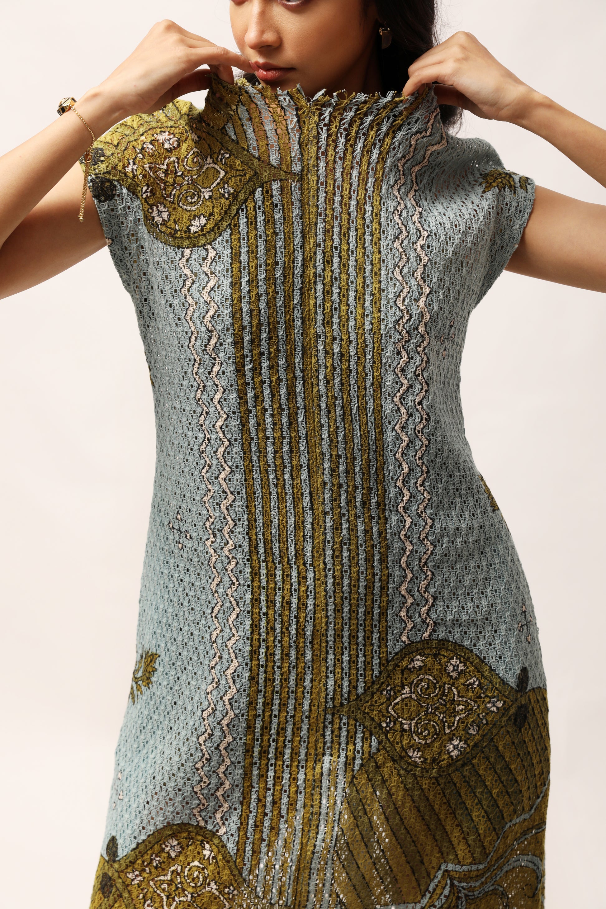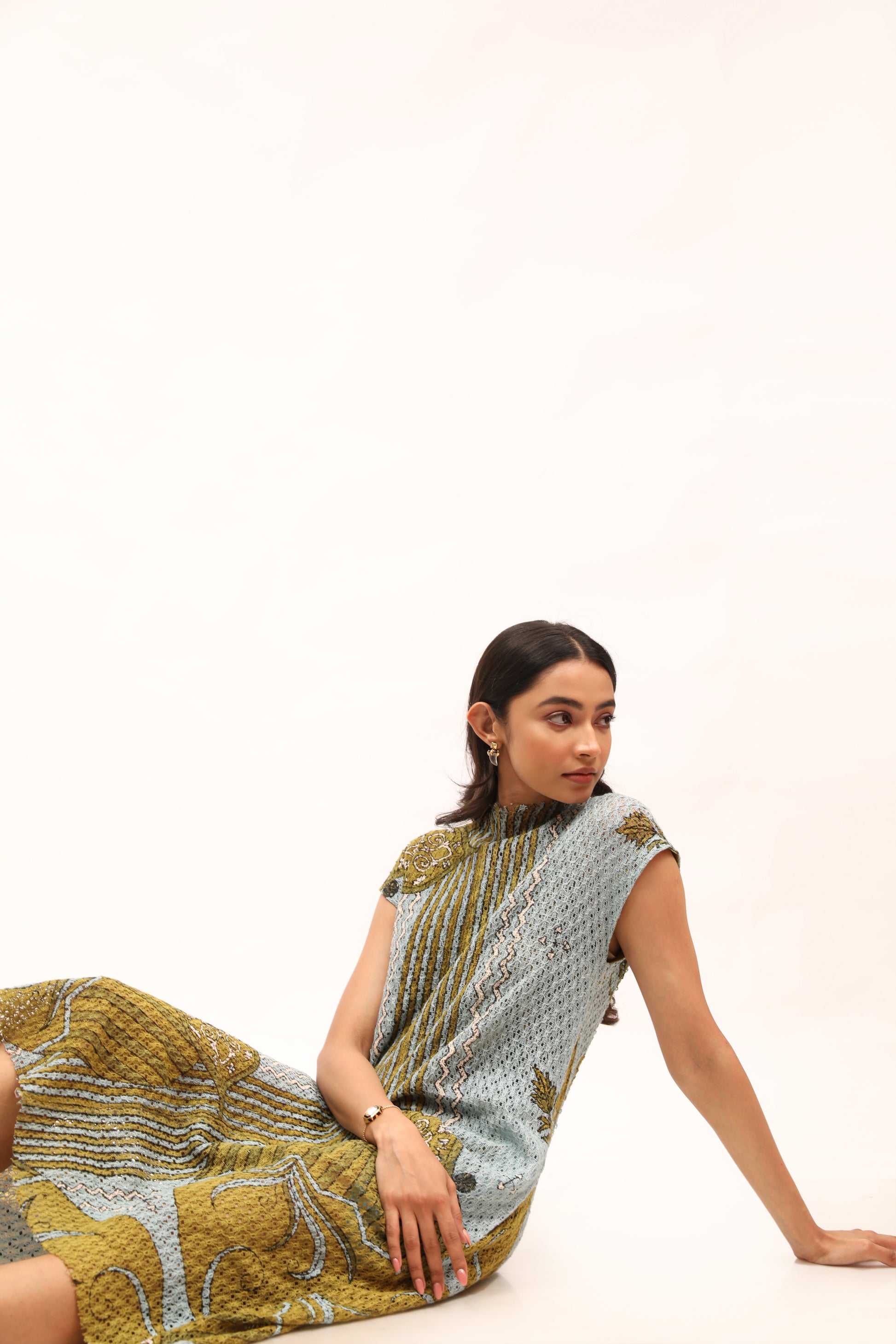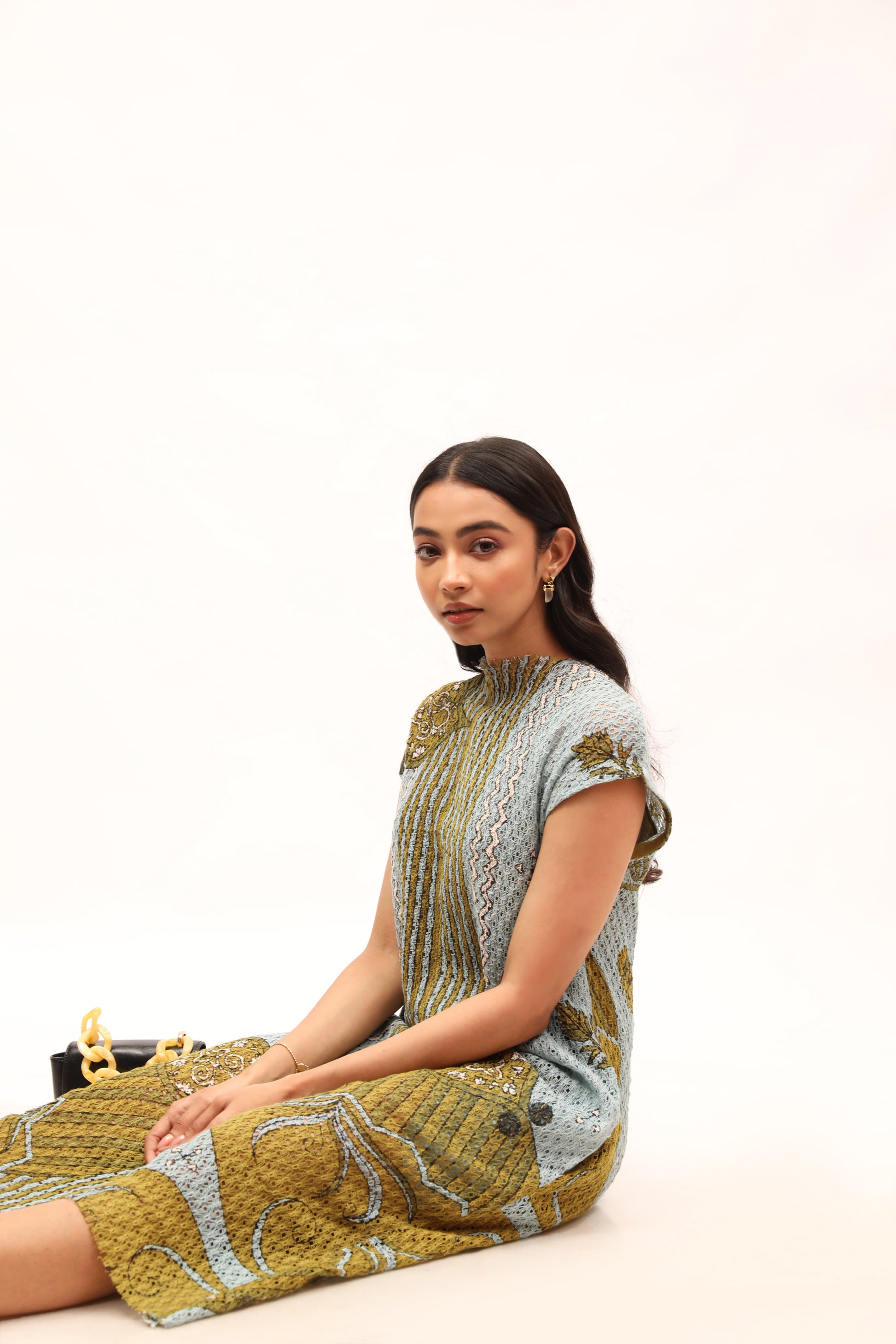 This printed cotton net dress has a relaxed, shift silhouette, elegantly detailed with drop shoulders and unfinished neckline. Style it with jewelled accessories and sleek pumps.