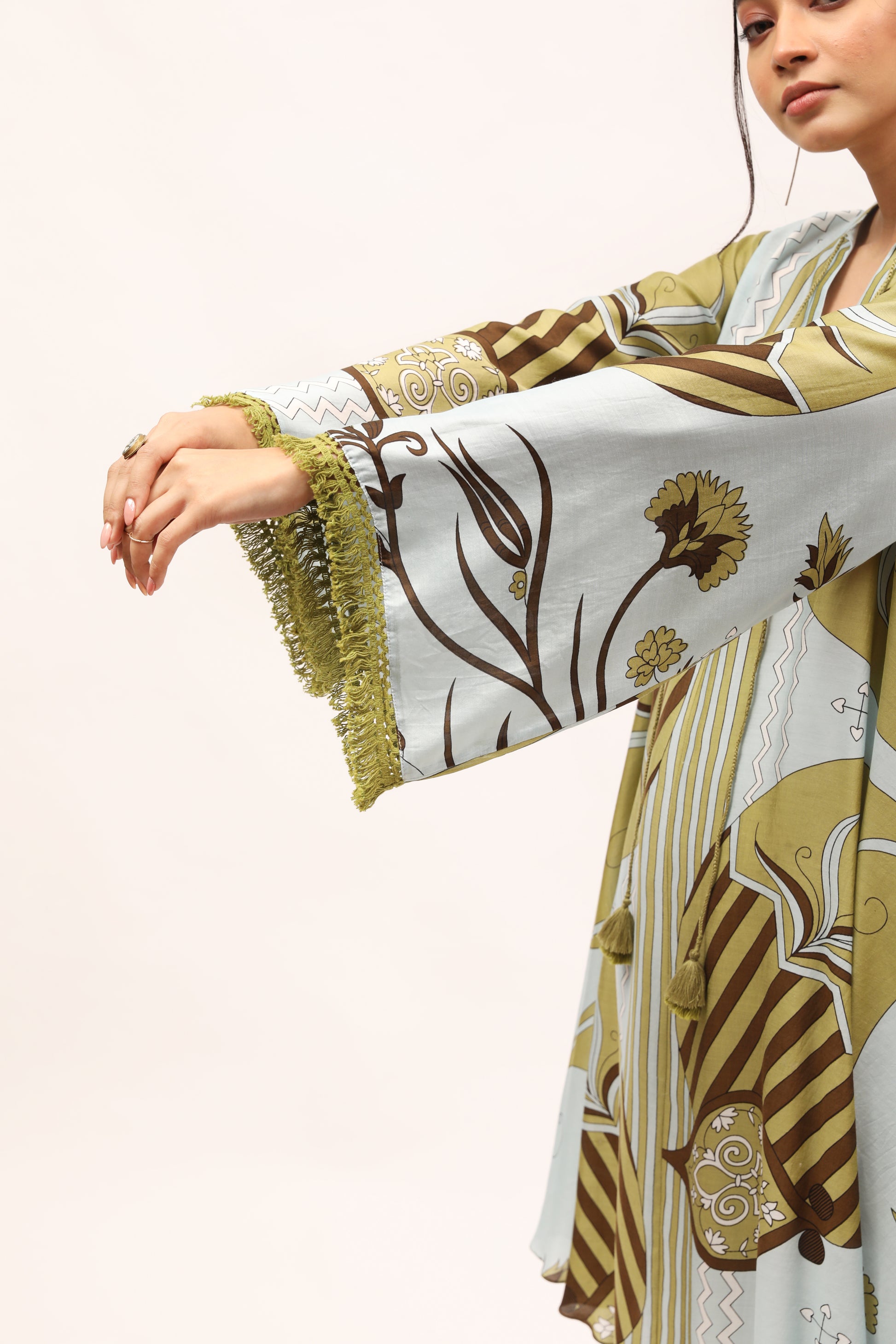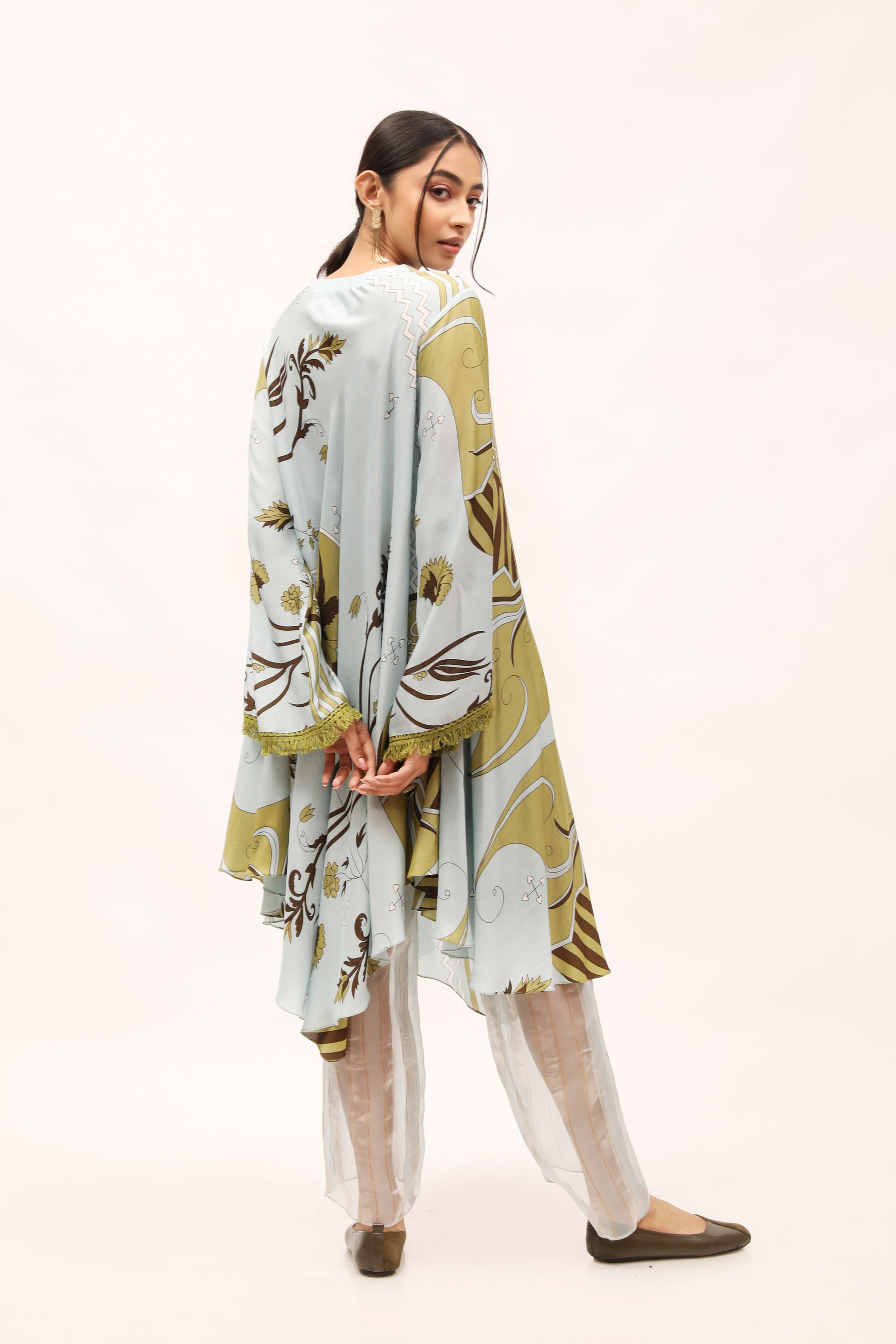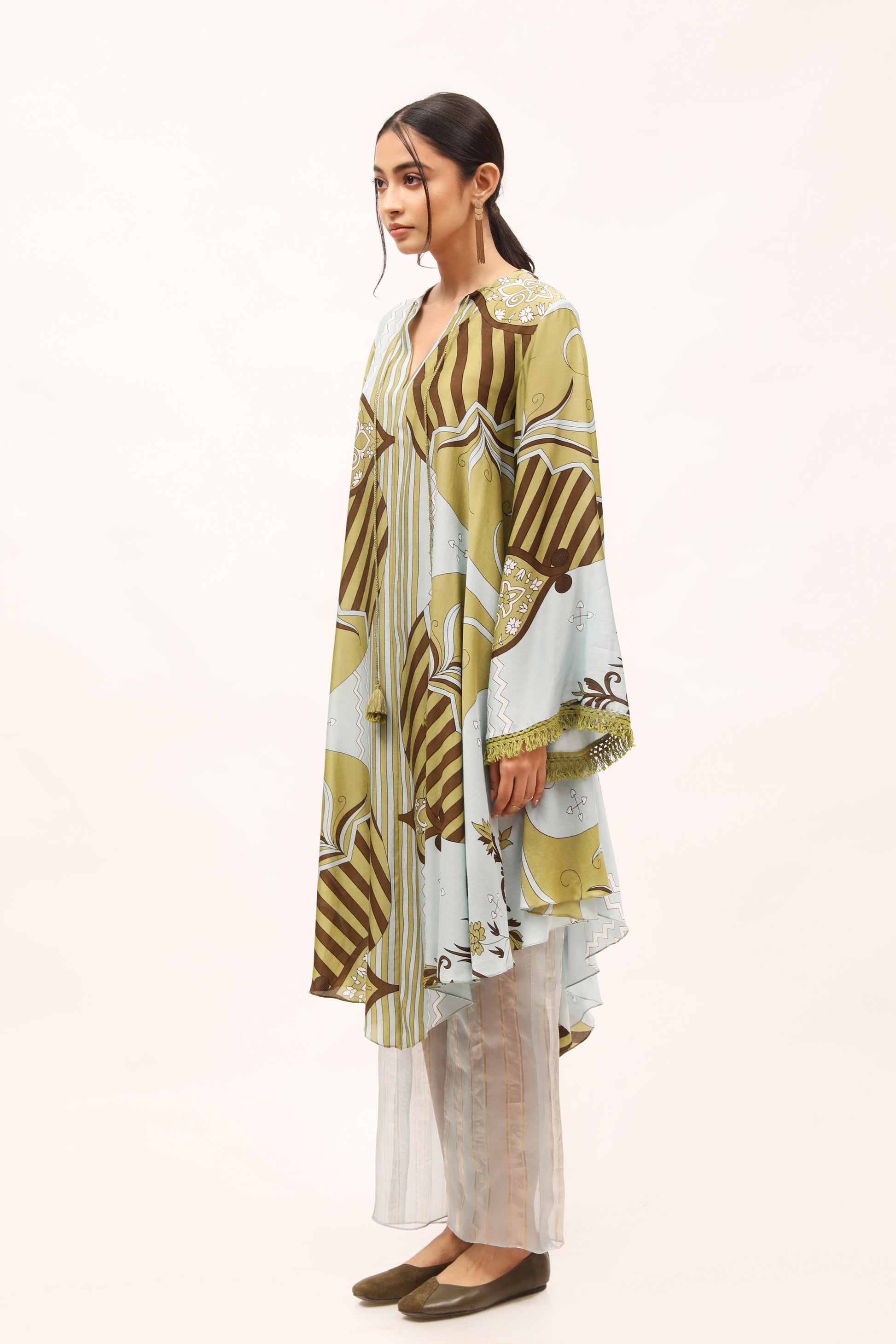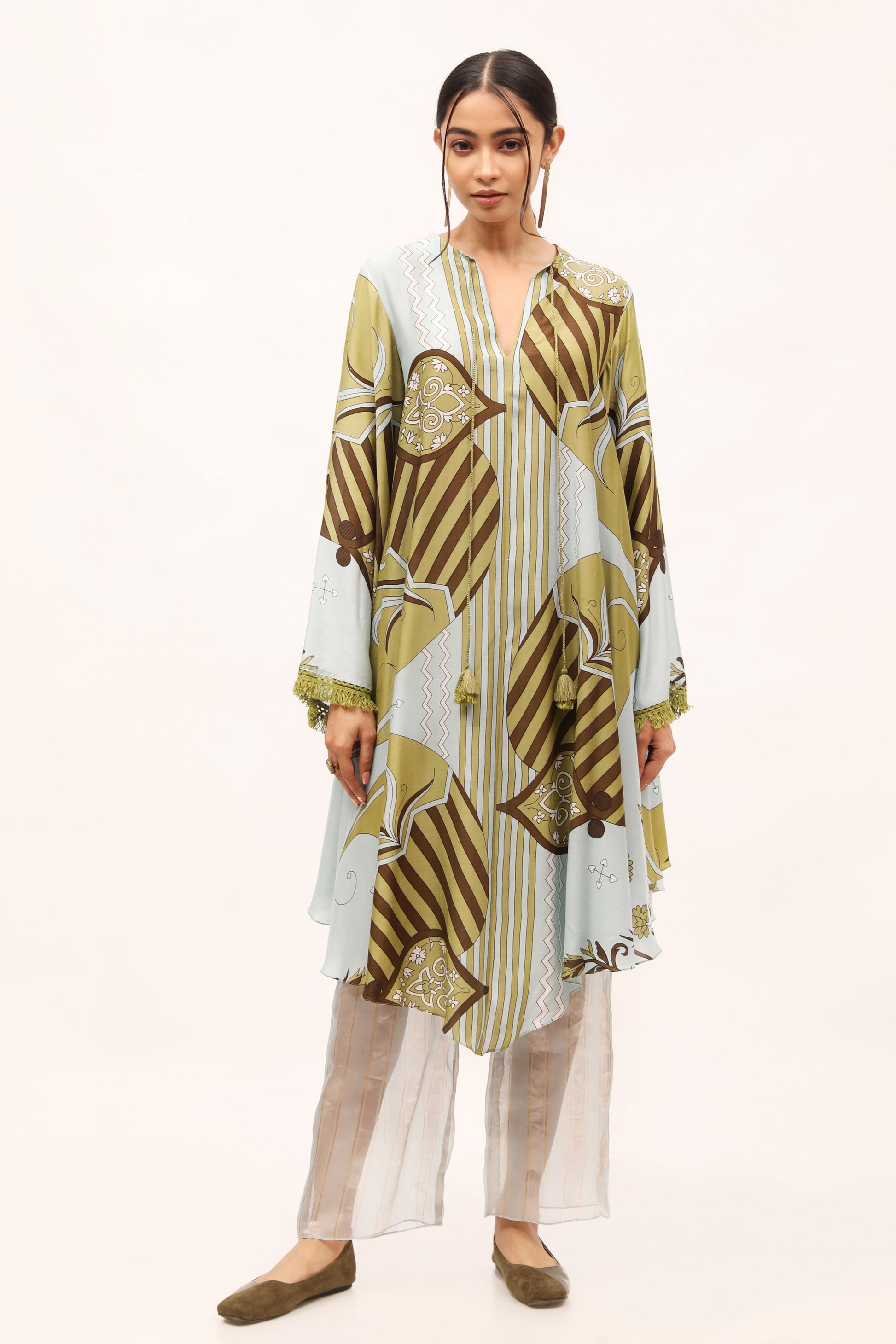 Cut from lustrous cotton silk, this printed tunic has a high-low hem with a v-neck and braided tassel detailing. With lace detailed comfortable bell sleeves and relaxed silhouette, keep accessories to a minimum and pair it with our organza stripe pants for an easy-elegant look.