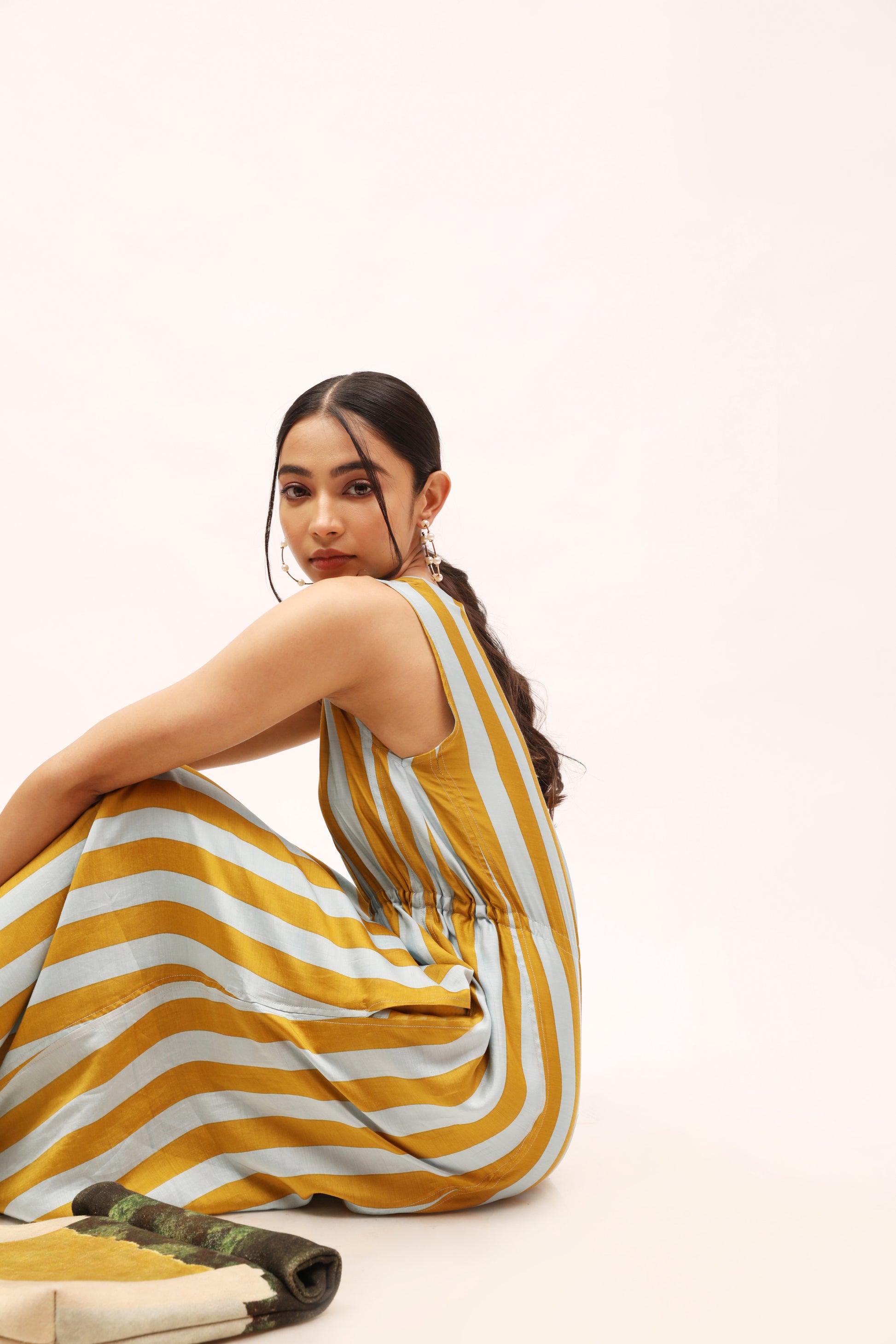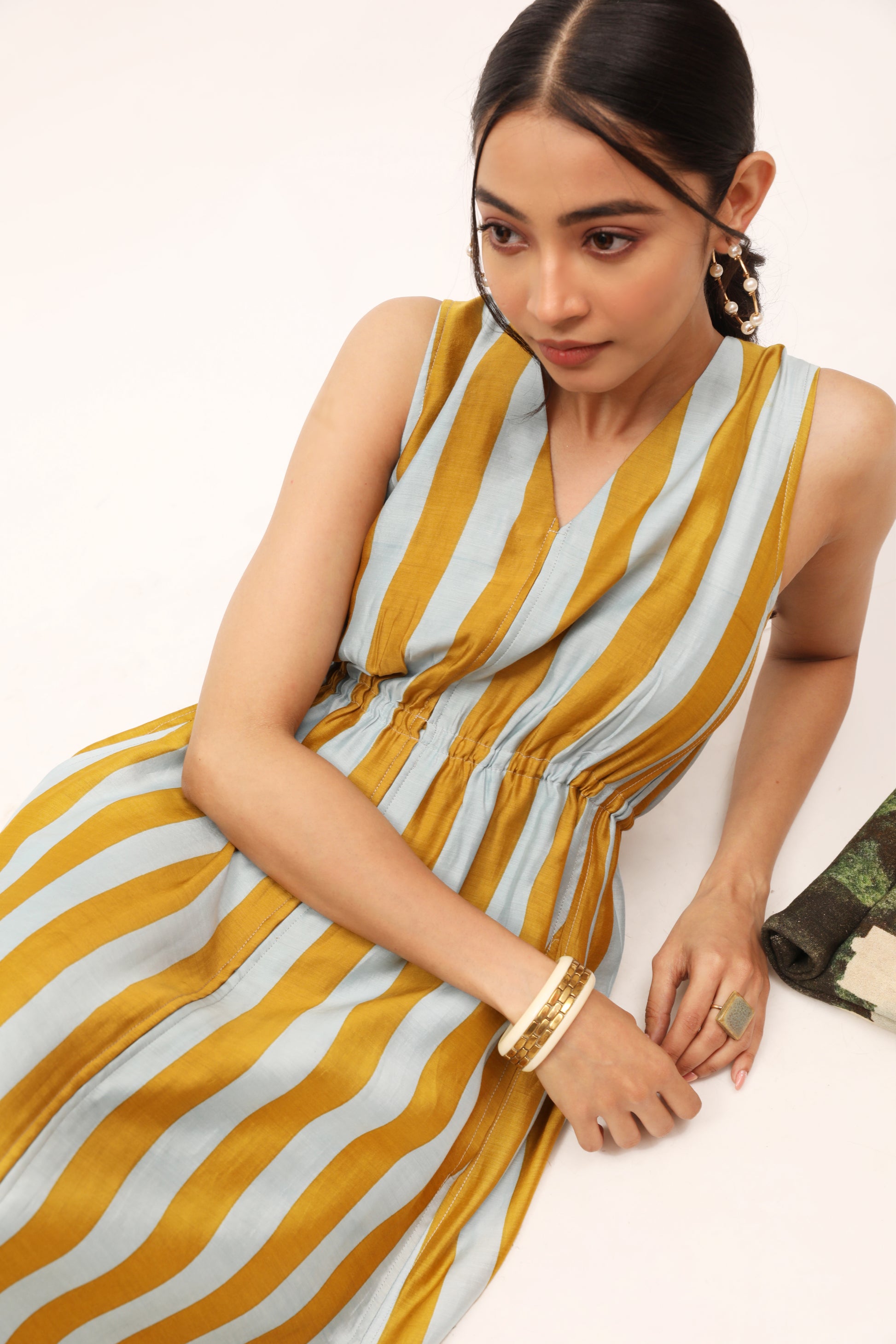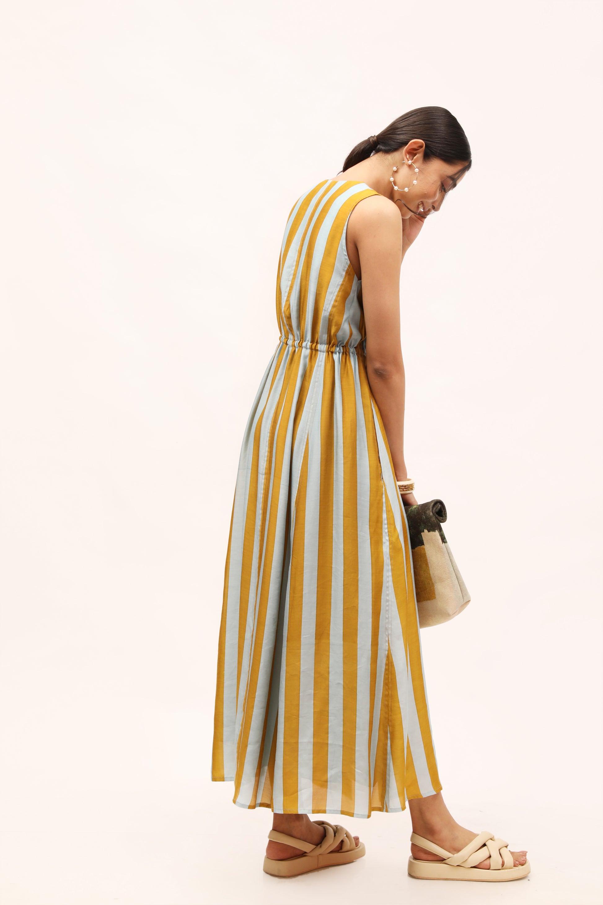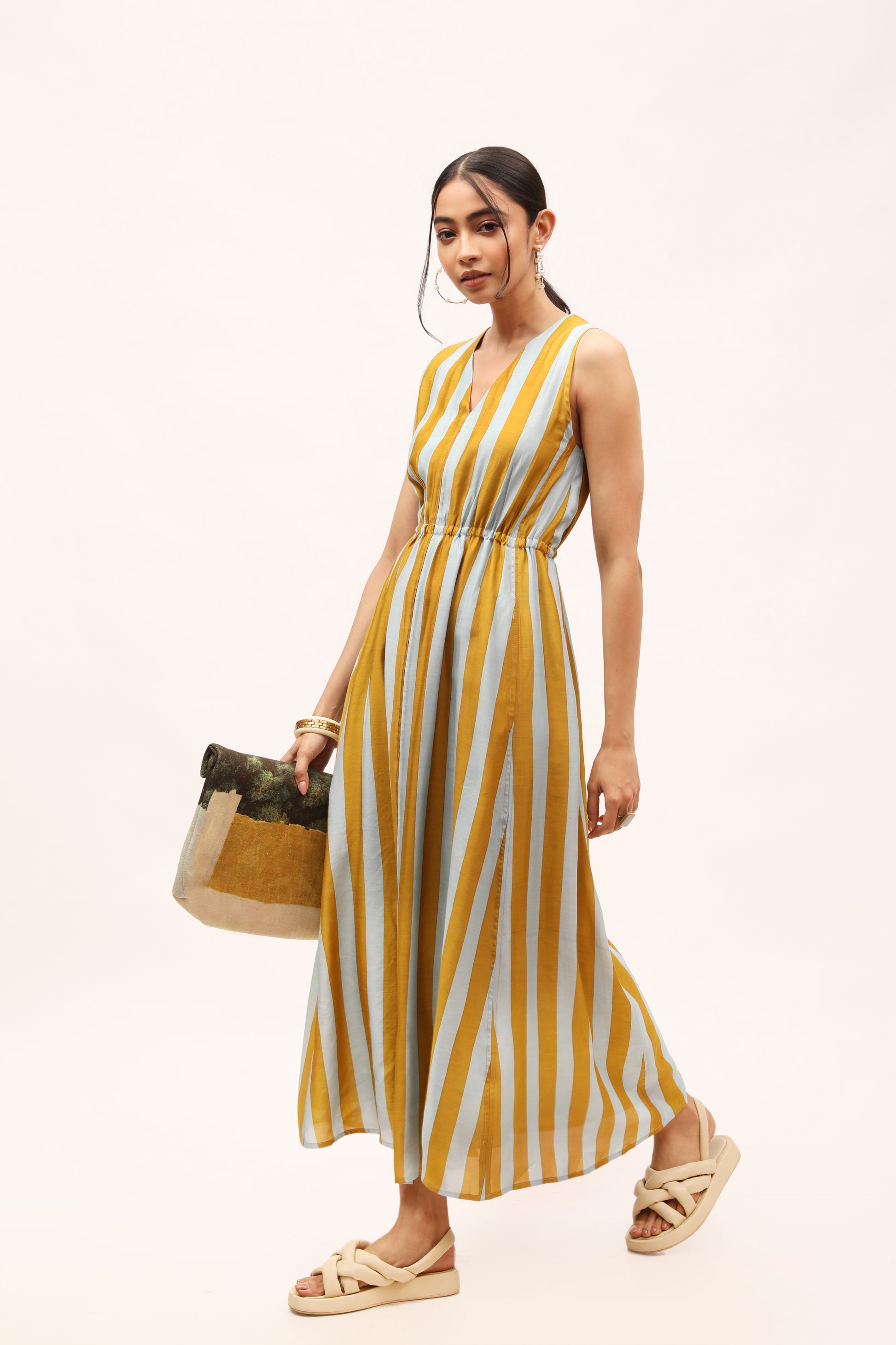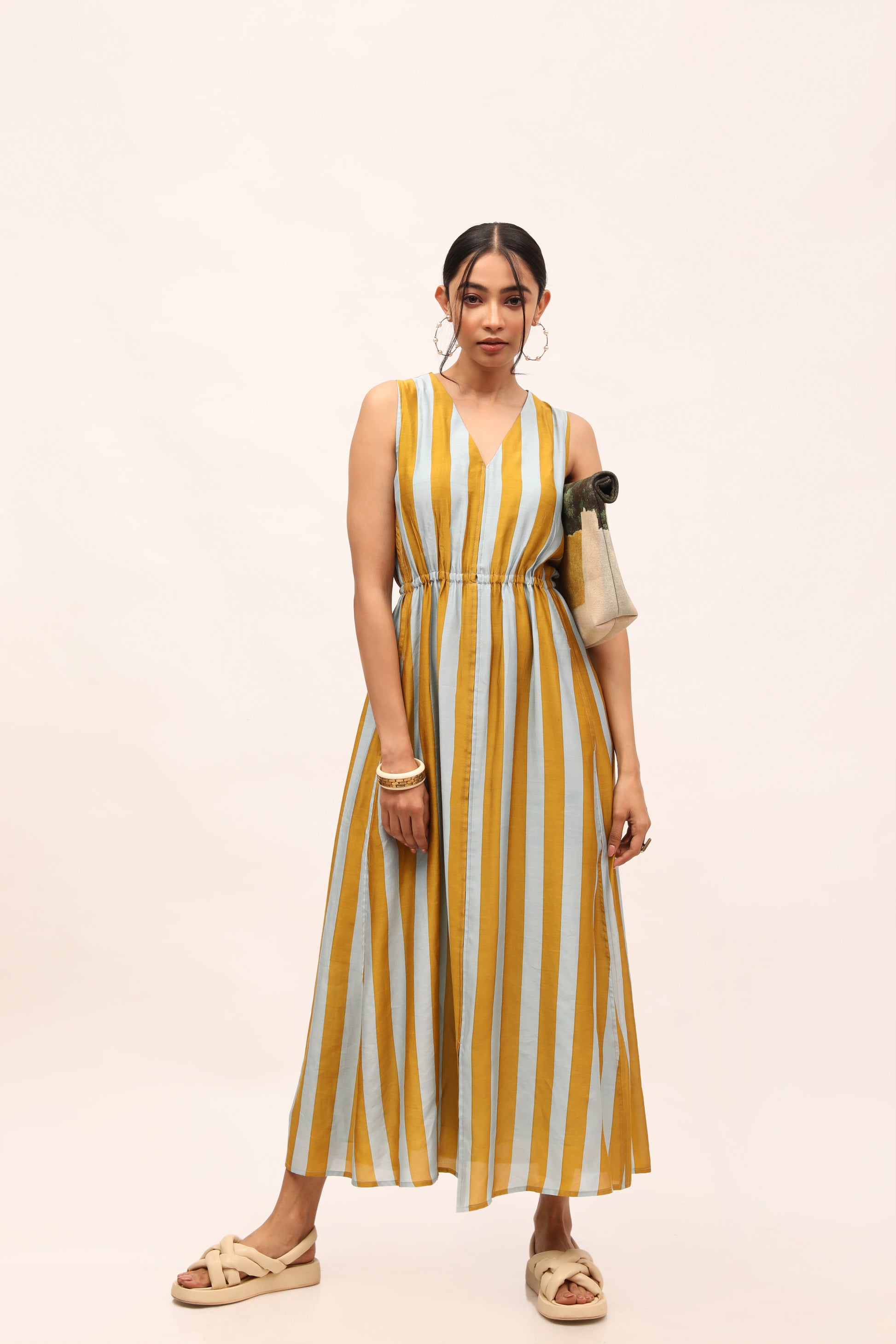 This straight silhouetted stripe long dress featuring V-neckline and fitted waist with side pockets is a perfect easy wear for your comfortable day look.