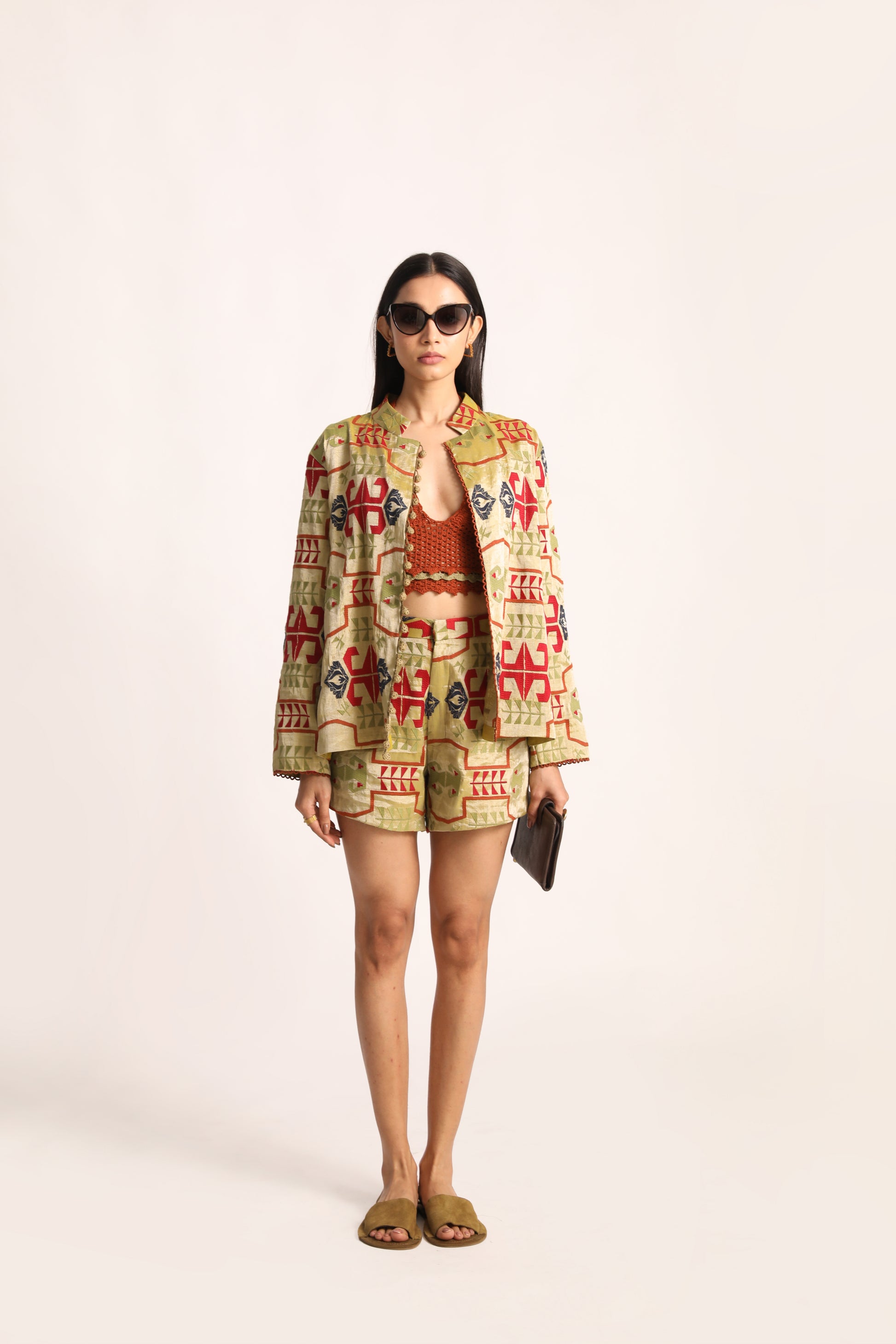 Constructed from tissue organza with Anatolian motifs these mini shorts have a relaxed fit and side pockets. Pair it up with matching emboidered jacket or shirt and bralette of the matching hue to complete the look.