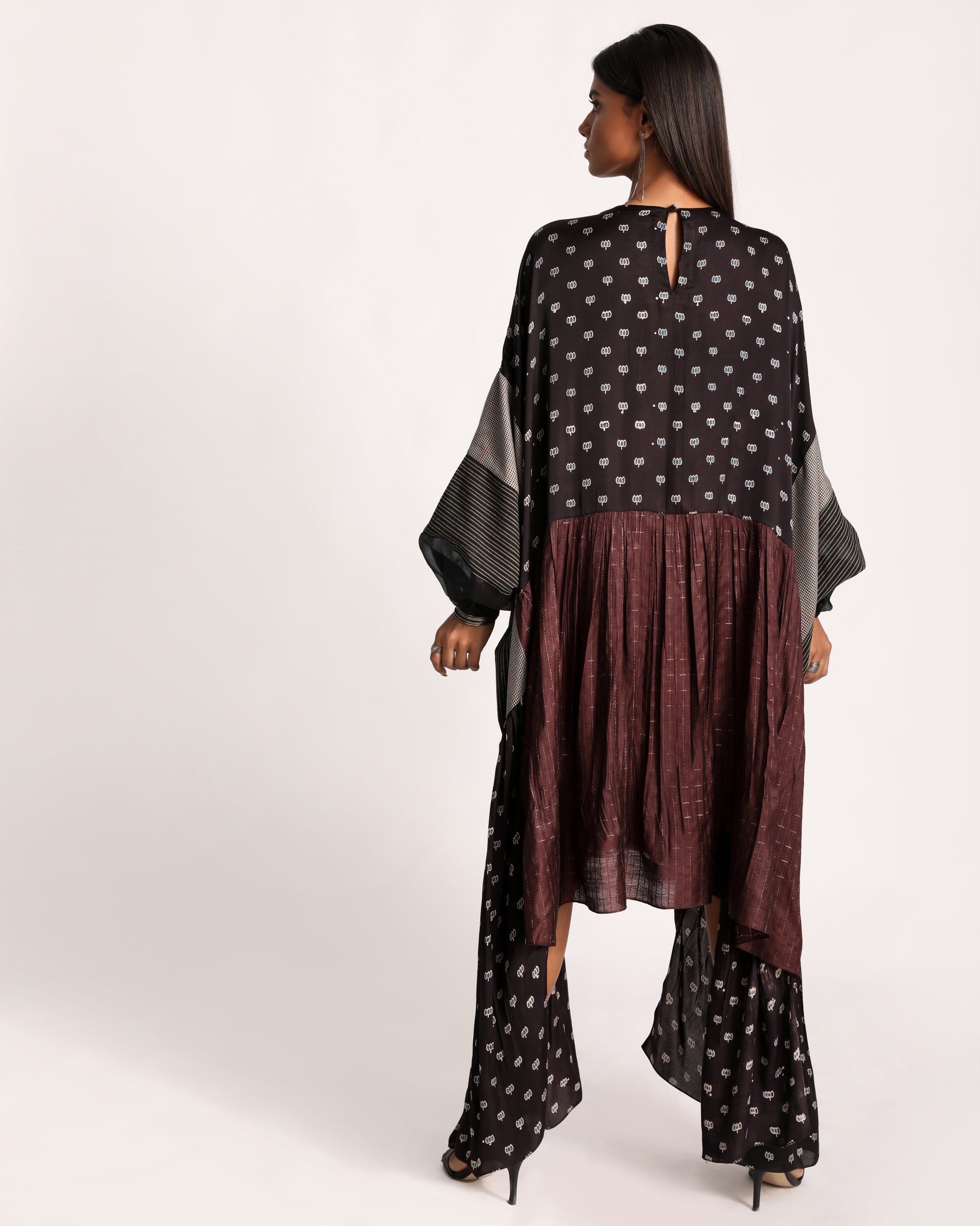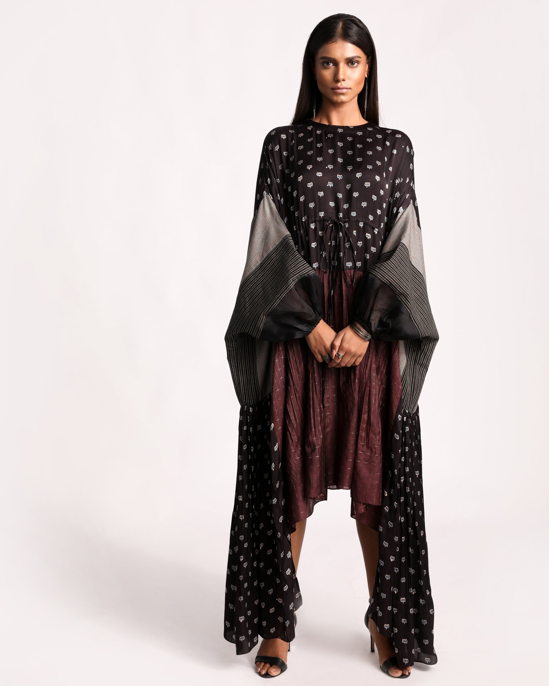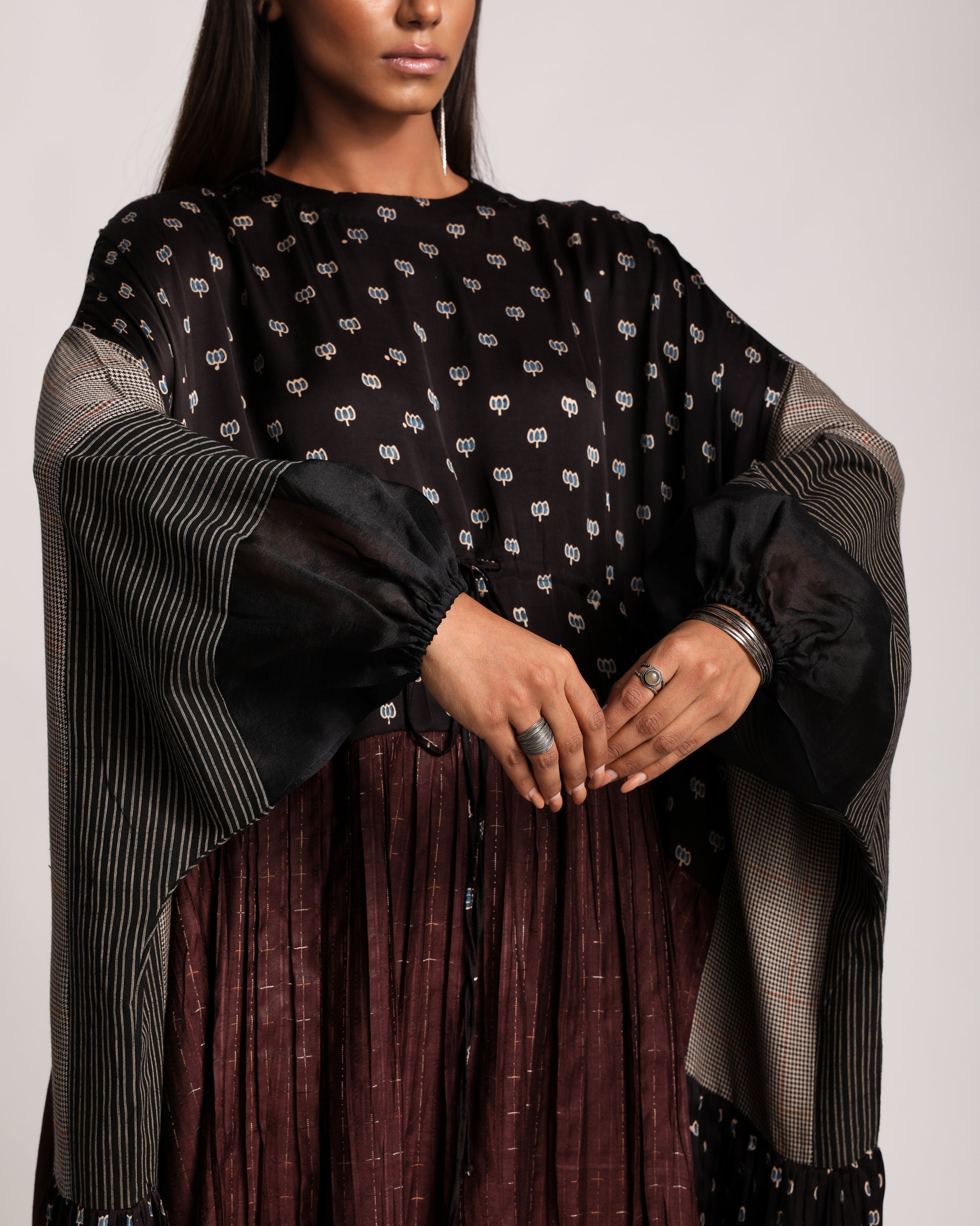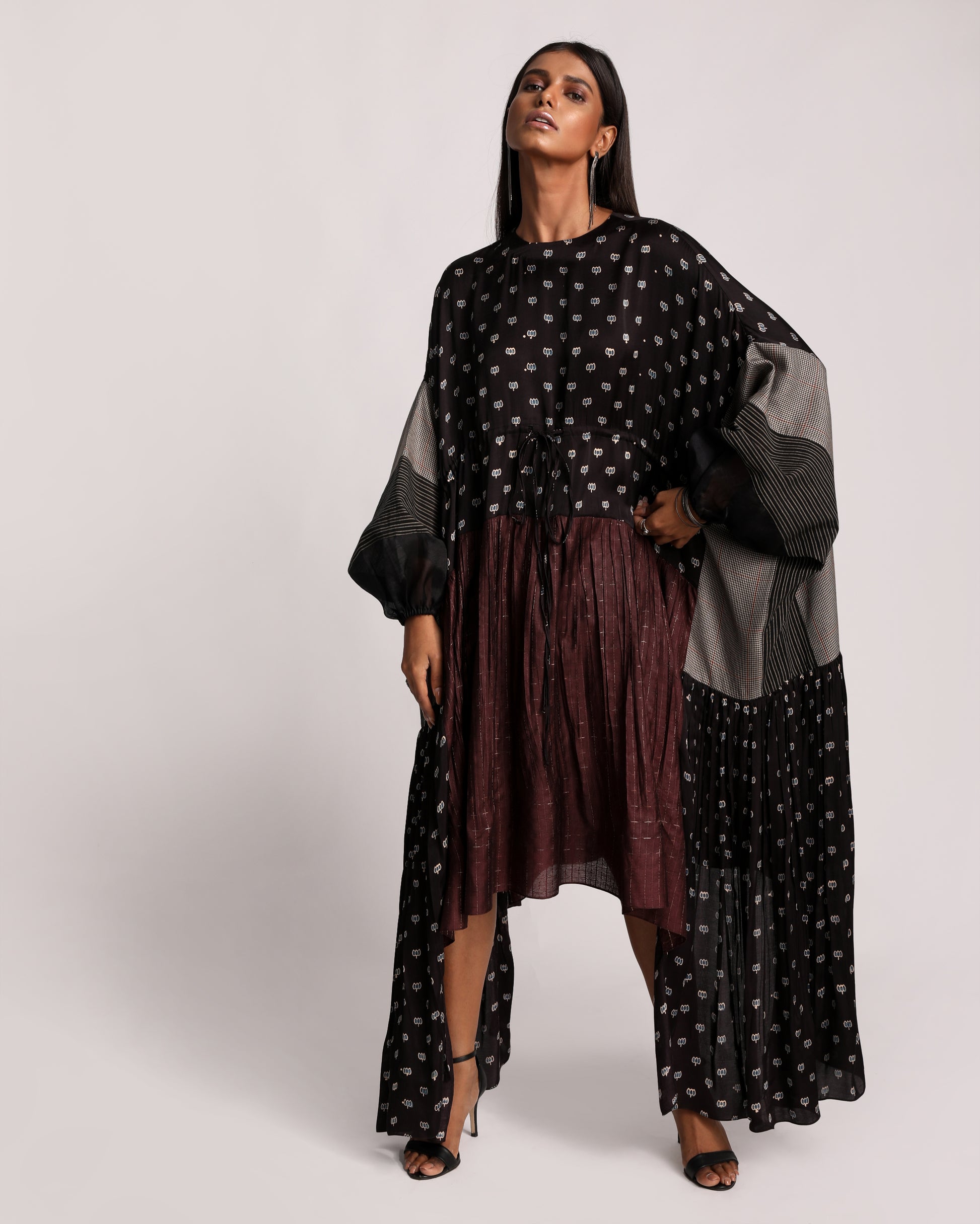"Make a statement in our vintage checks lotus print high-low midi this season. The dress has a relaxed cut with dropped puffy shoulders and a fitted waist with a drawstring at the front.
