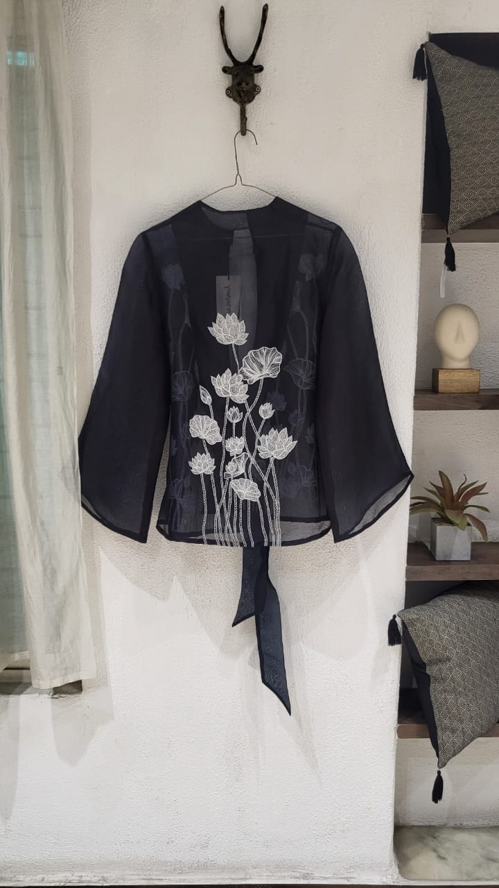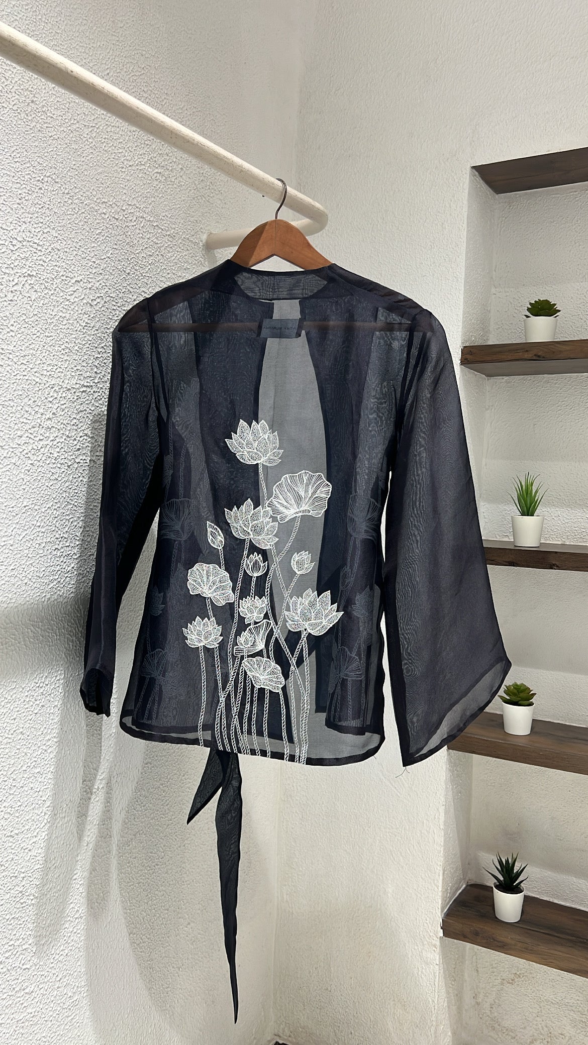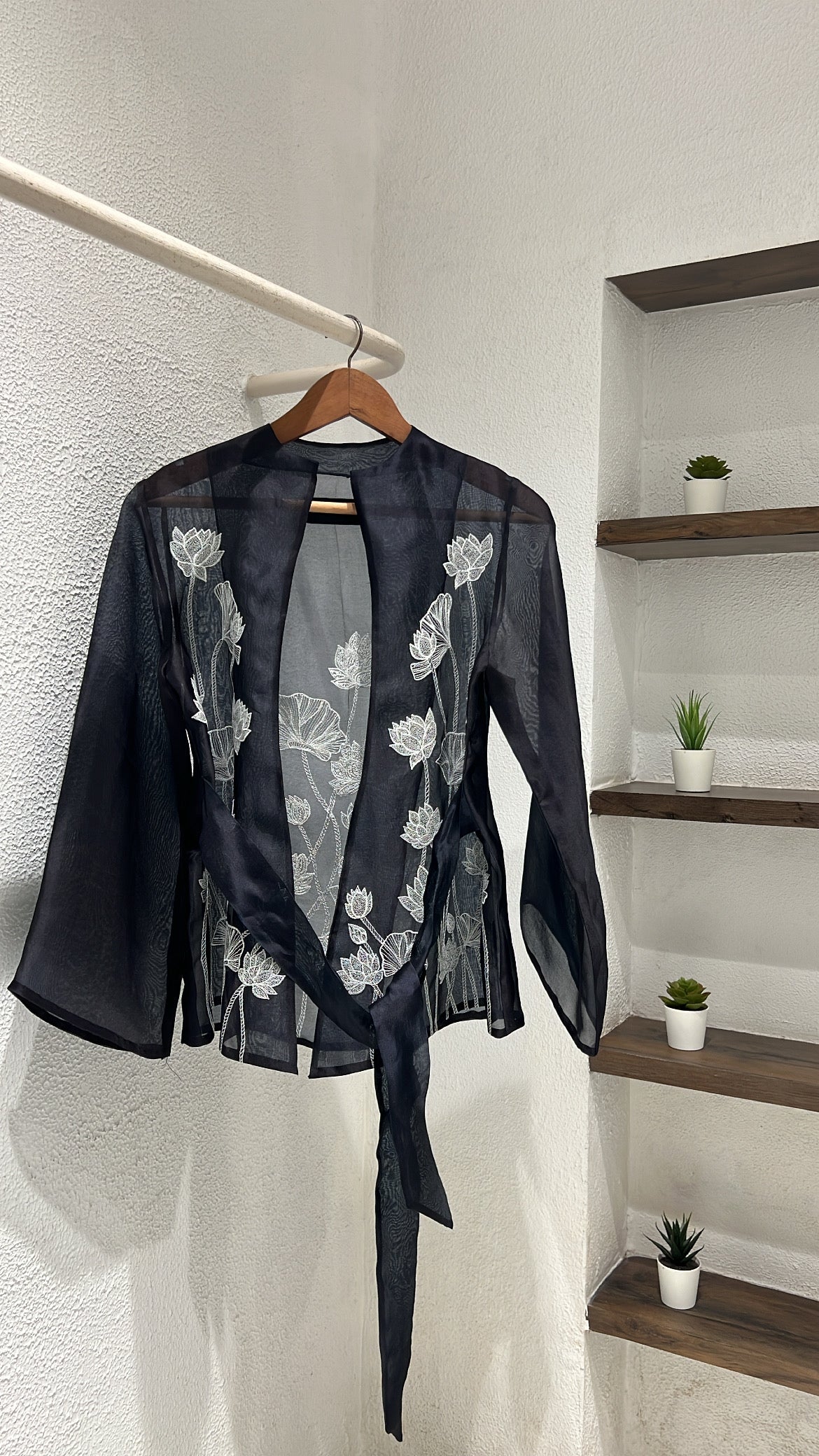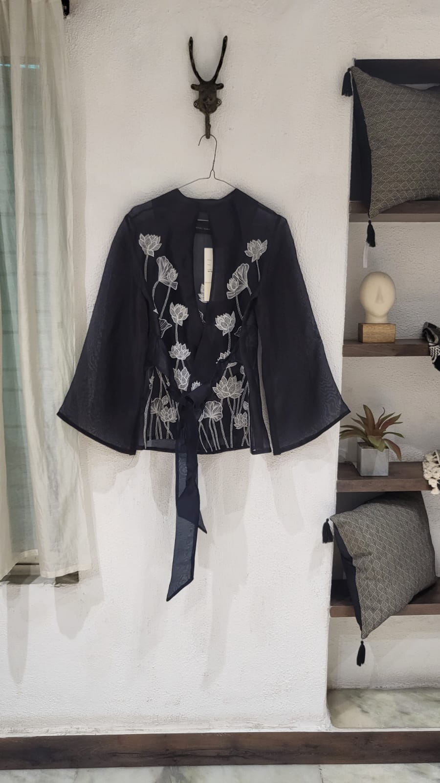 Cut from organza silk and crafted with machine embroidery, this belted wrap top is an easy silhouette. Team it up with drape skirts or trousers for an uplifted look.