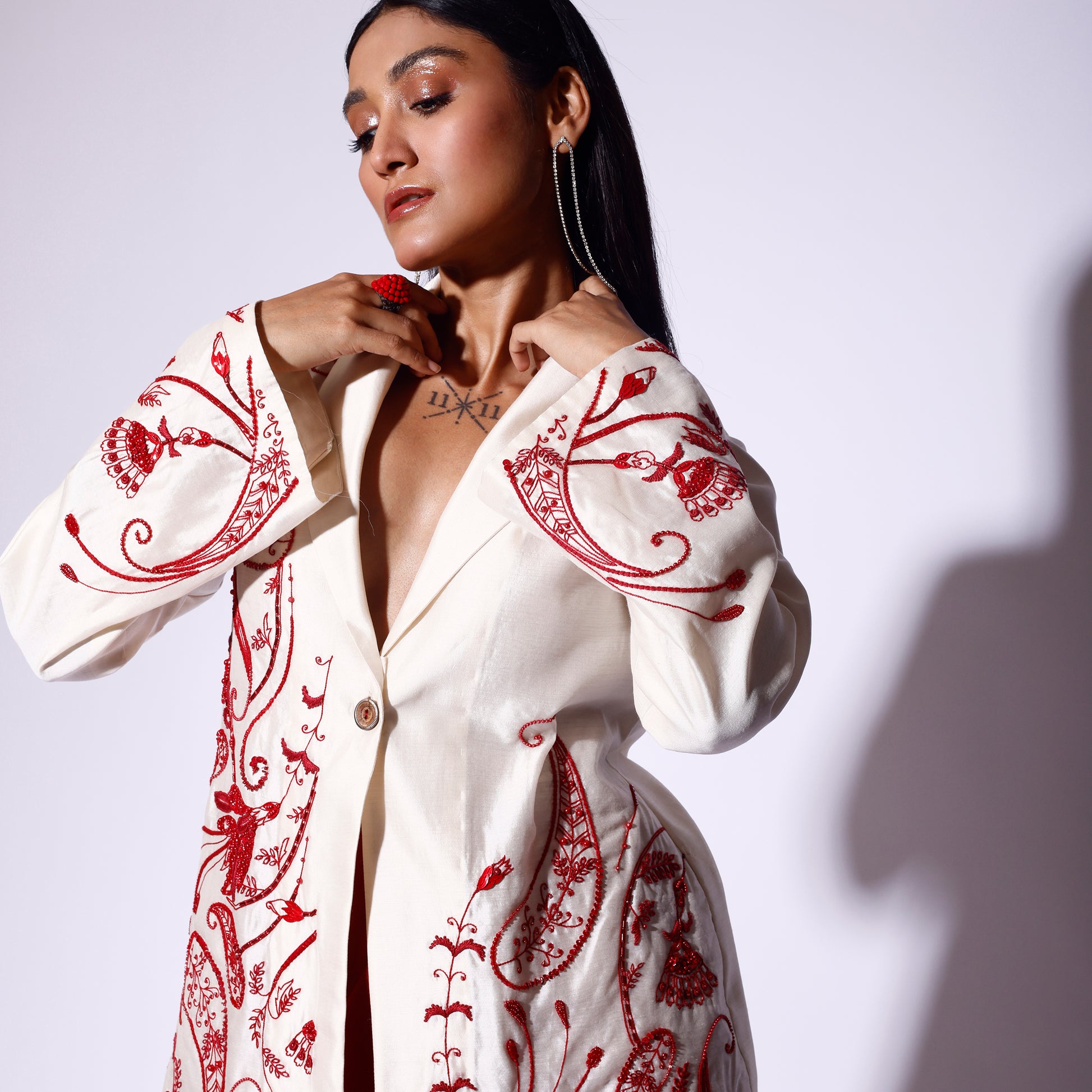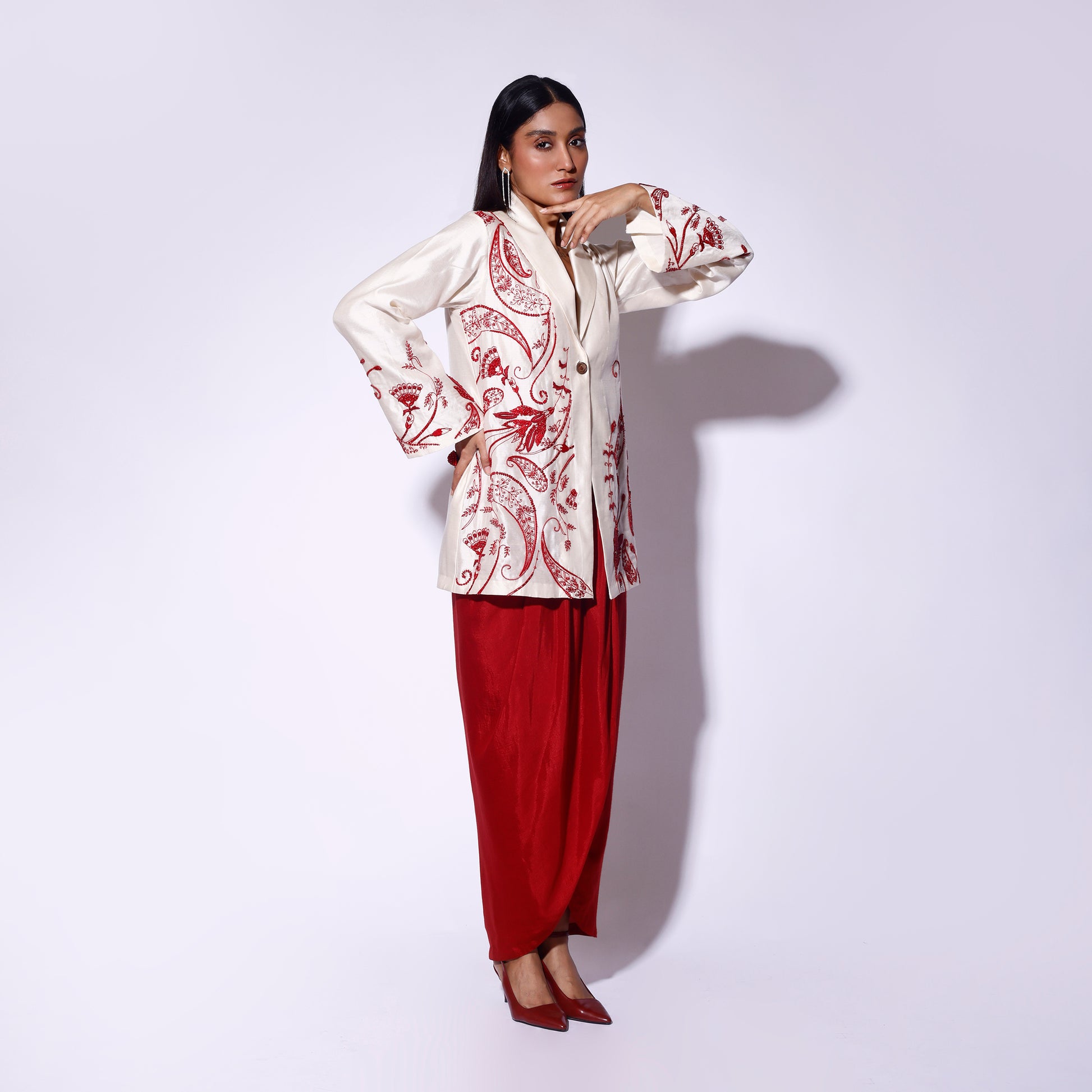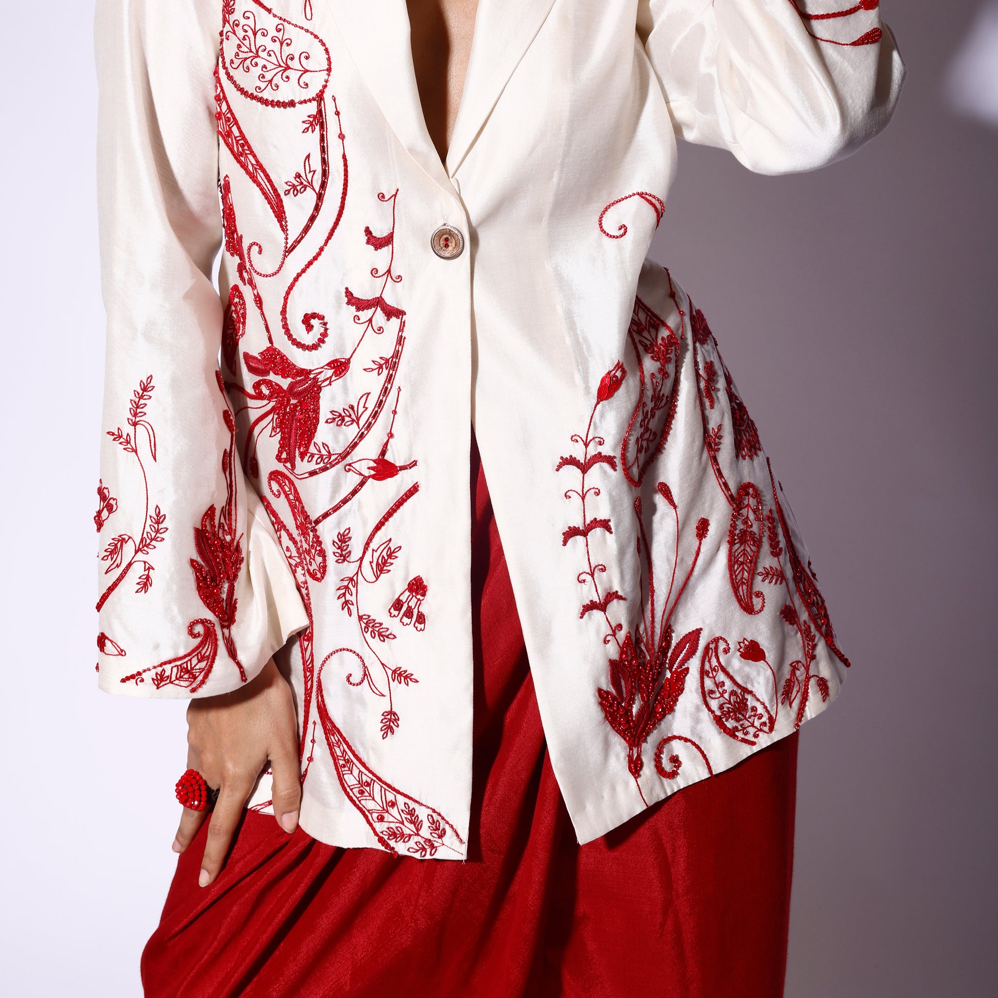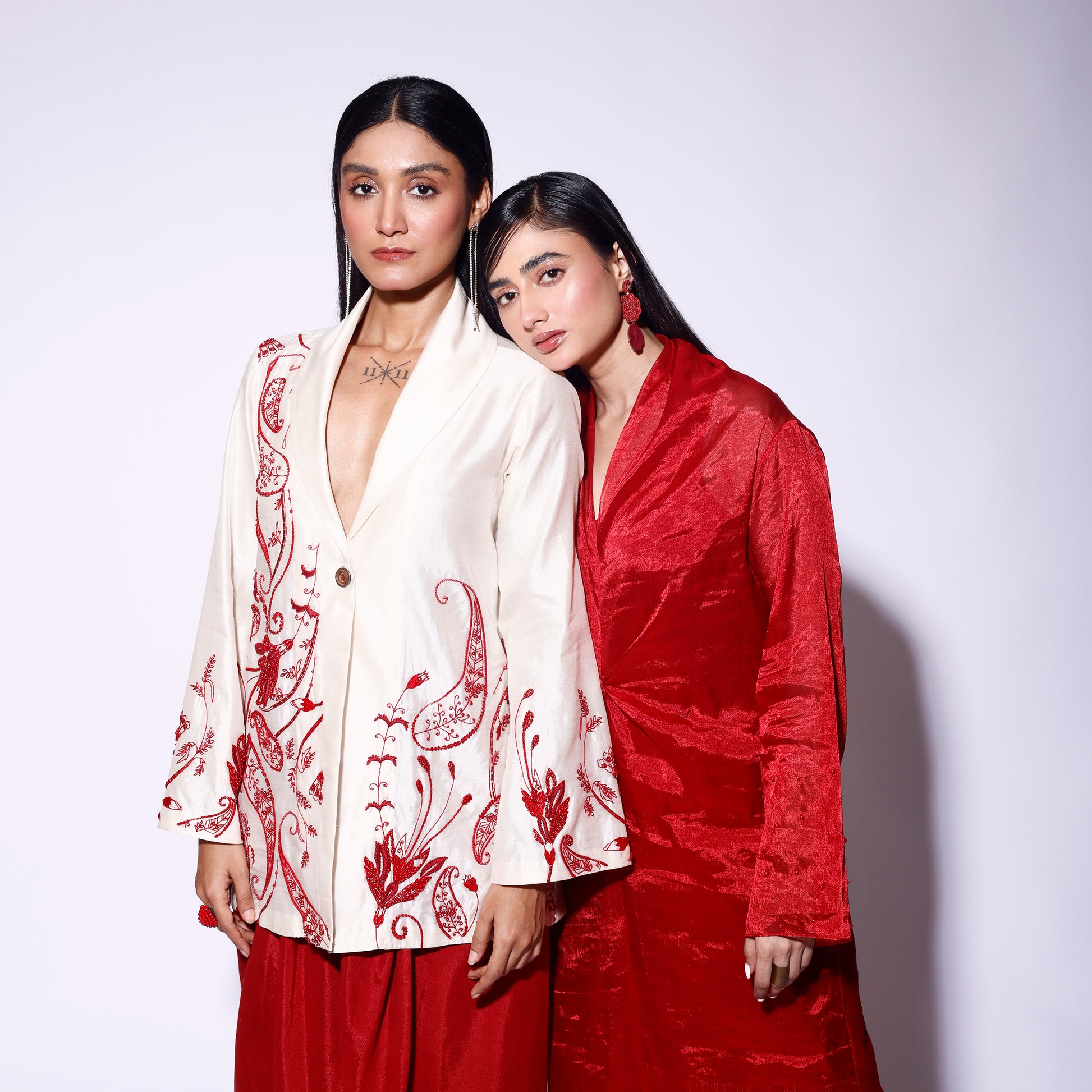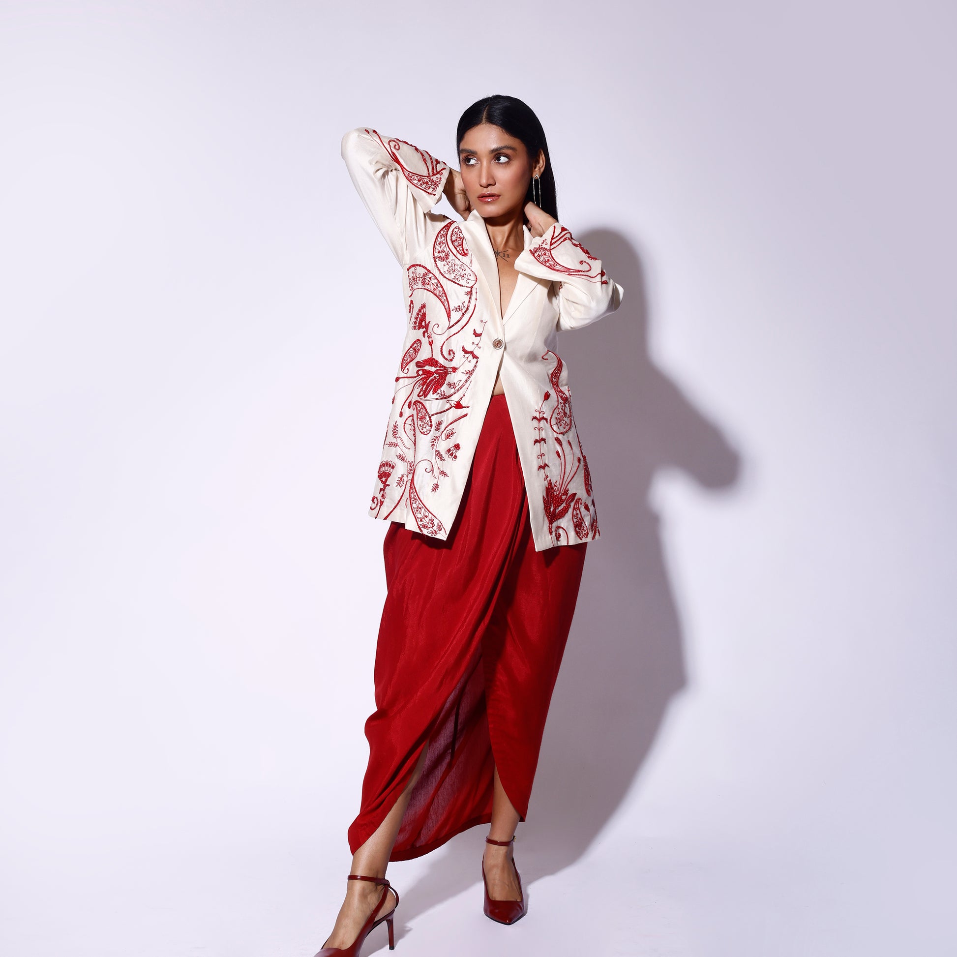 This luxurious handloom silk blazer with hand embroidery and a shawl collar combines traditional craftsmanship with modern tailoring. Perfect for layering over our red drape skirt.