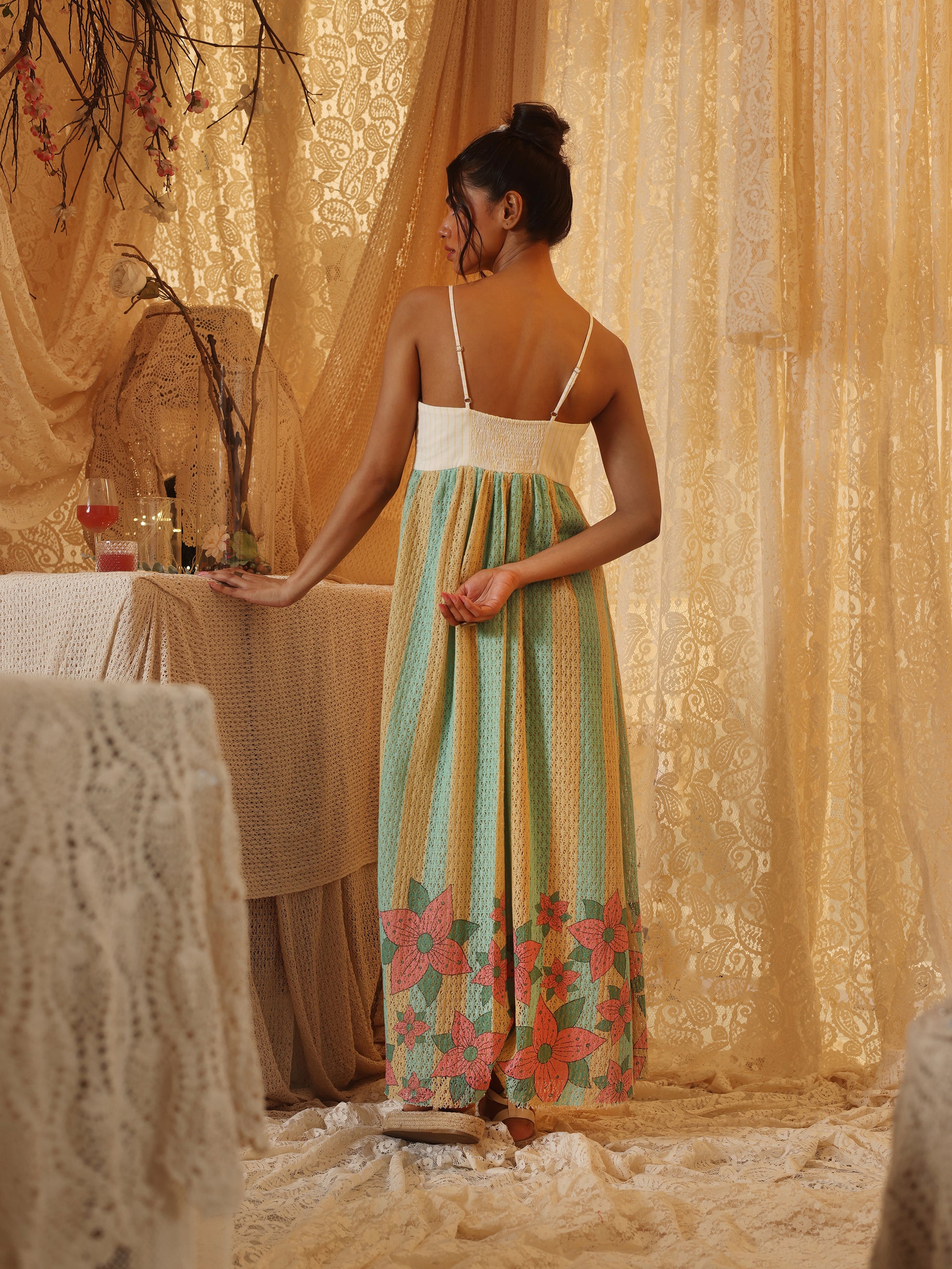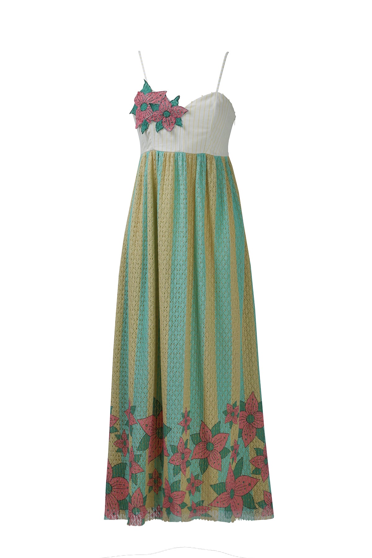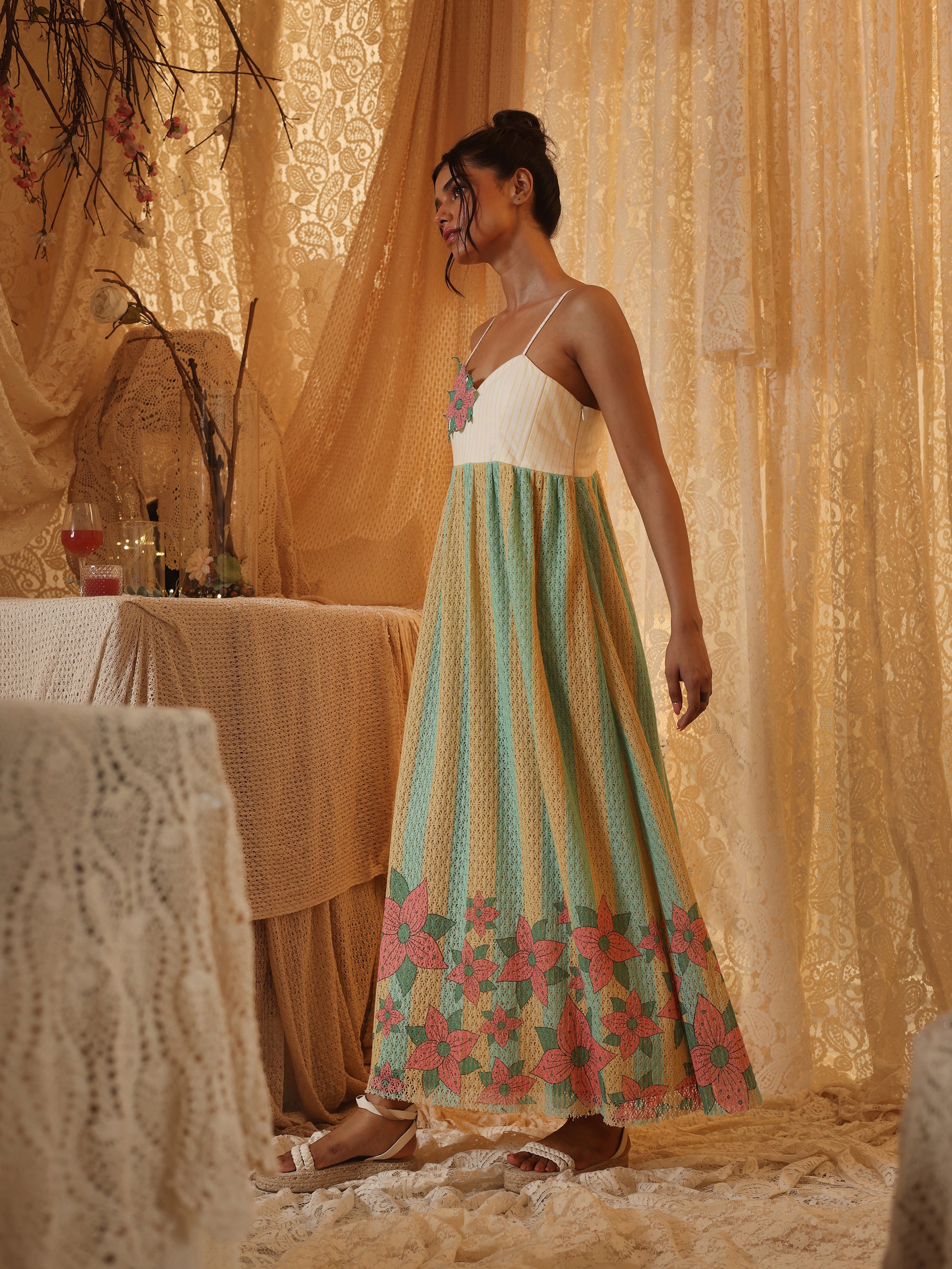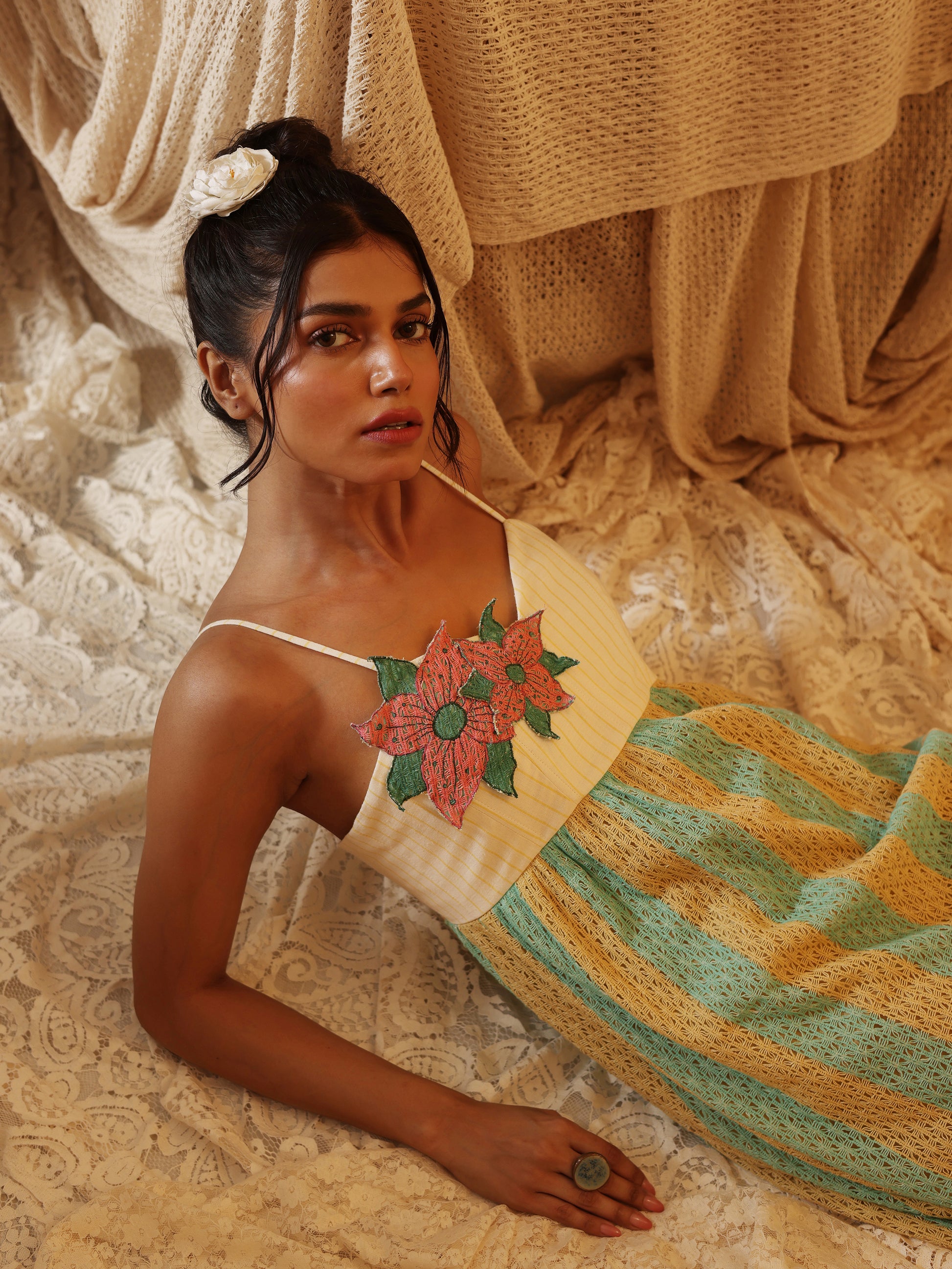 Playful and pretty, this spaghetti strap dress features a vibrant mix of yellow and blue stripes on airy cotton net. Delicately placed floral appliqués add a handcrafted, whimsical flair. The silhouette is flowy and feminine, making it perfect for sun-kissed days by the pool or tropical