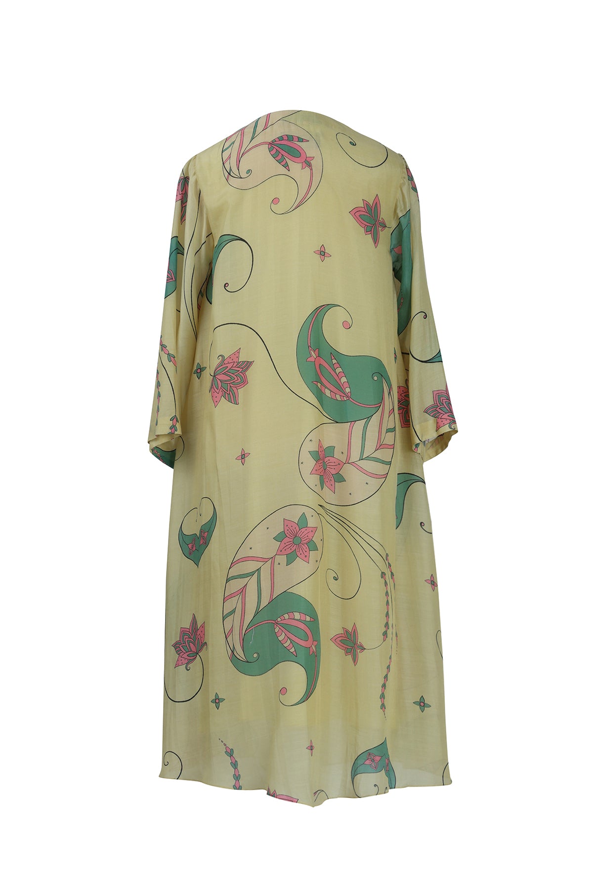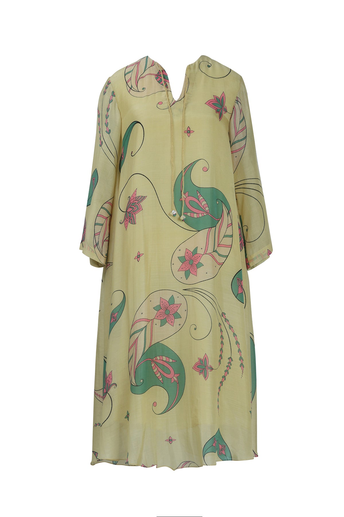 A sunlit delight in cotton silk, this yellow tunic dress showcases contemporary paisley motifs in a modern resort-ready form. The braided thread at the neckline adds artisanal flair, while the relaxed fit ensures day-long comfort. Designed for summer strolls, monsoon getaways, or beachside dinners, this tunic embodies warmth and ease. Pair with flats and minimal jewelry for an effortless vacation ensemble.
