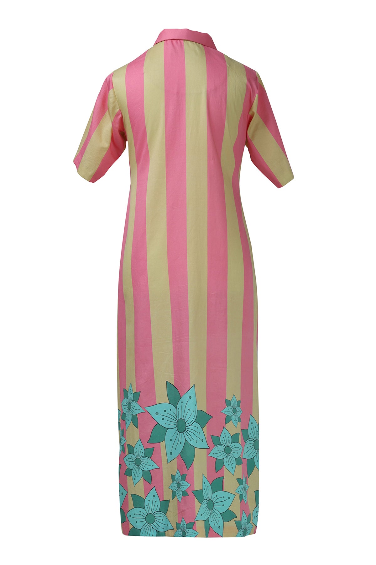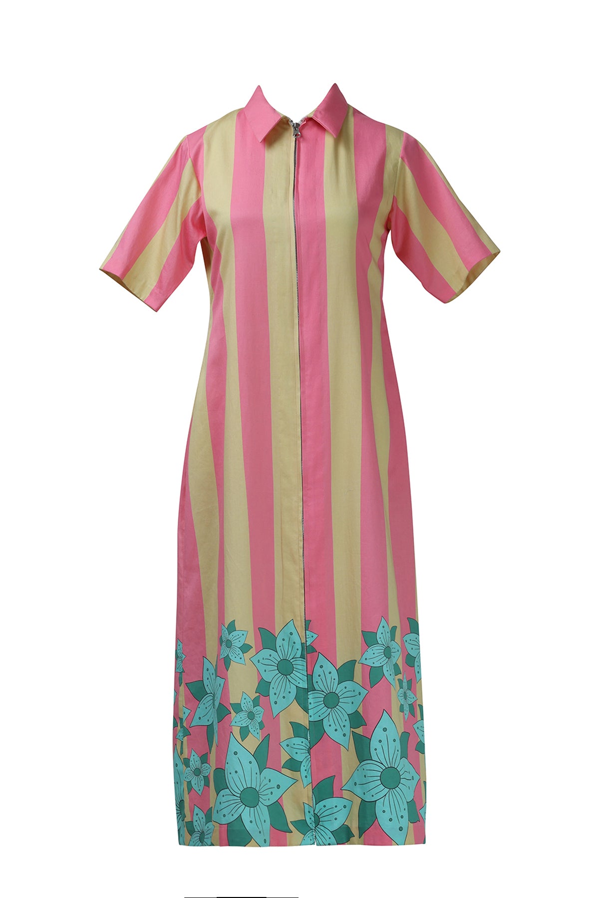 Fresh, youthful, and functional, this cotton dress mixes yellow-pink stripes with scattered blue floral prints. A front zipper detail adds a sporty edge to the relaxed silhouette, offering a modern take on vacation fashion. Wear it zipped up for polish or slightly open for a casual look.