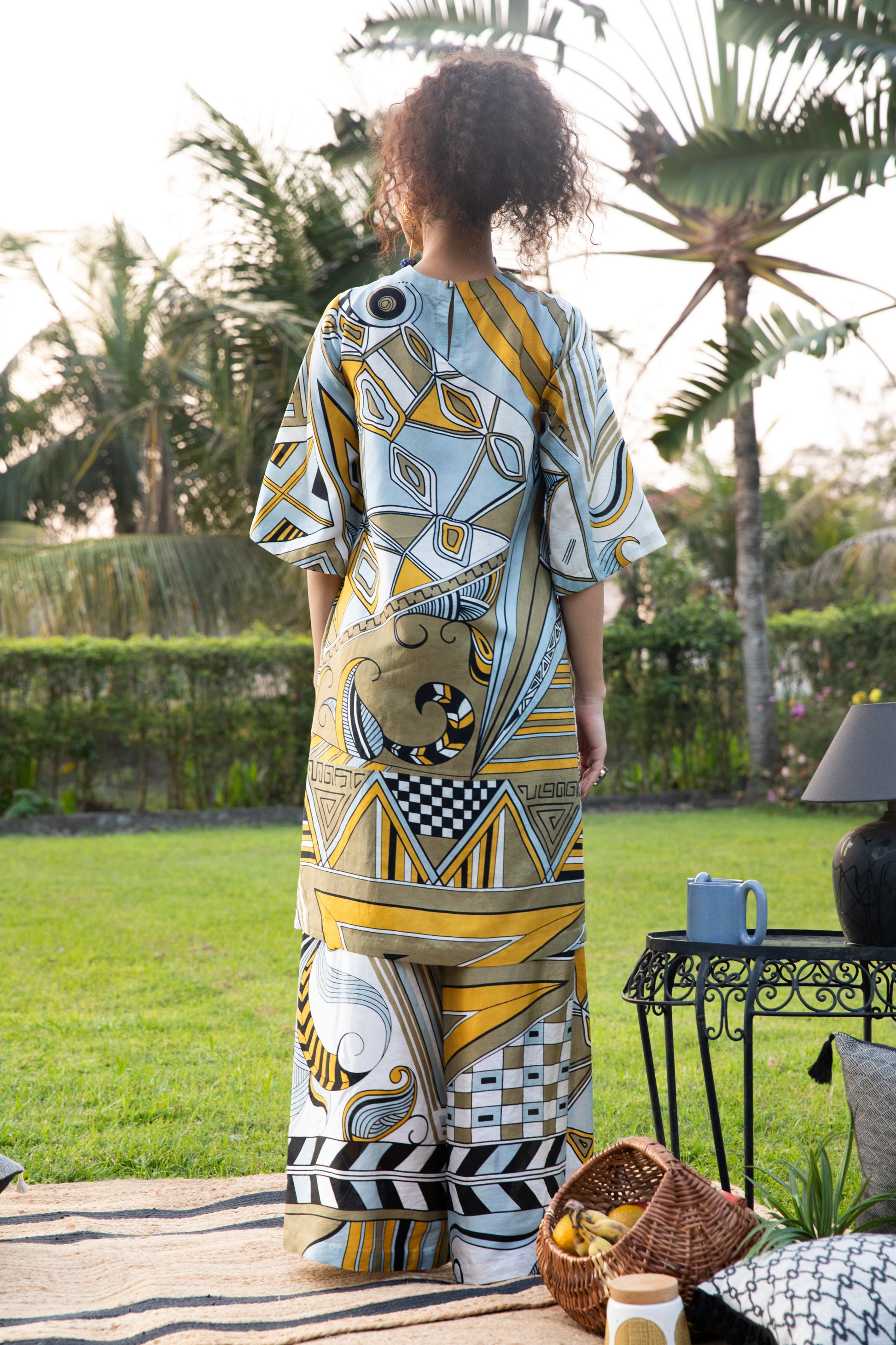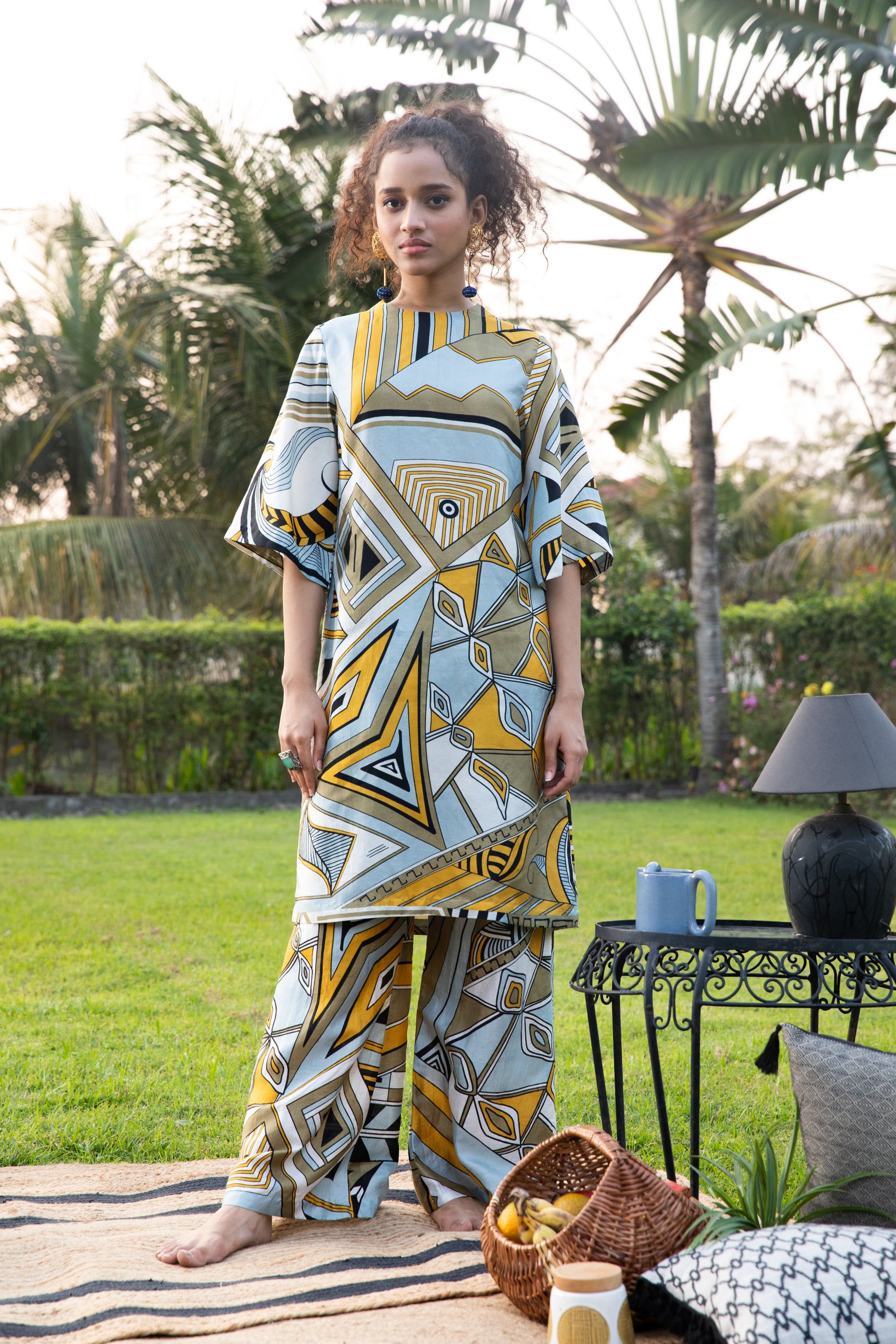 Simple straight cut tunic dress with pant set is made using lightweight handloom silk. Printed using a screen by indigenous craftspeople of India.